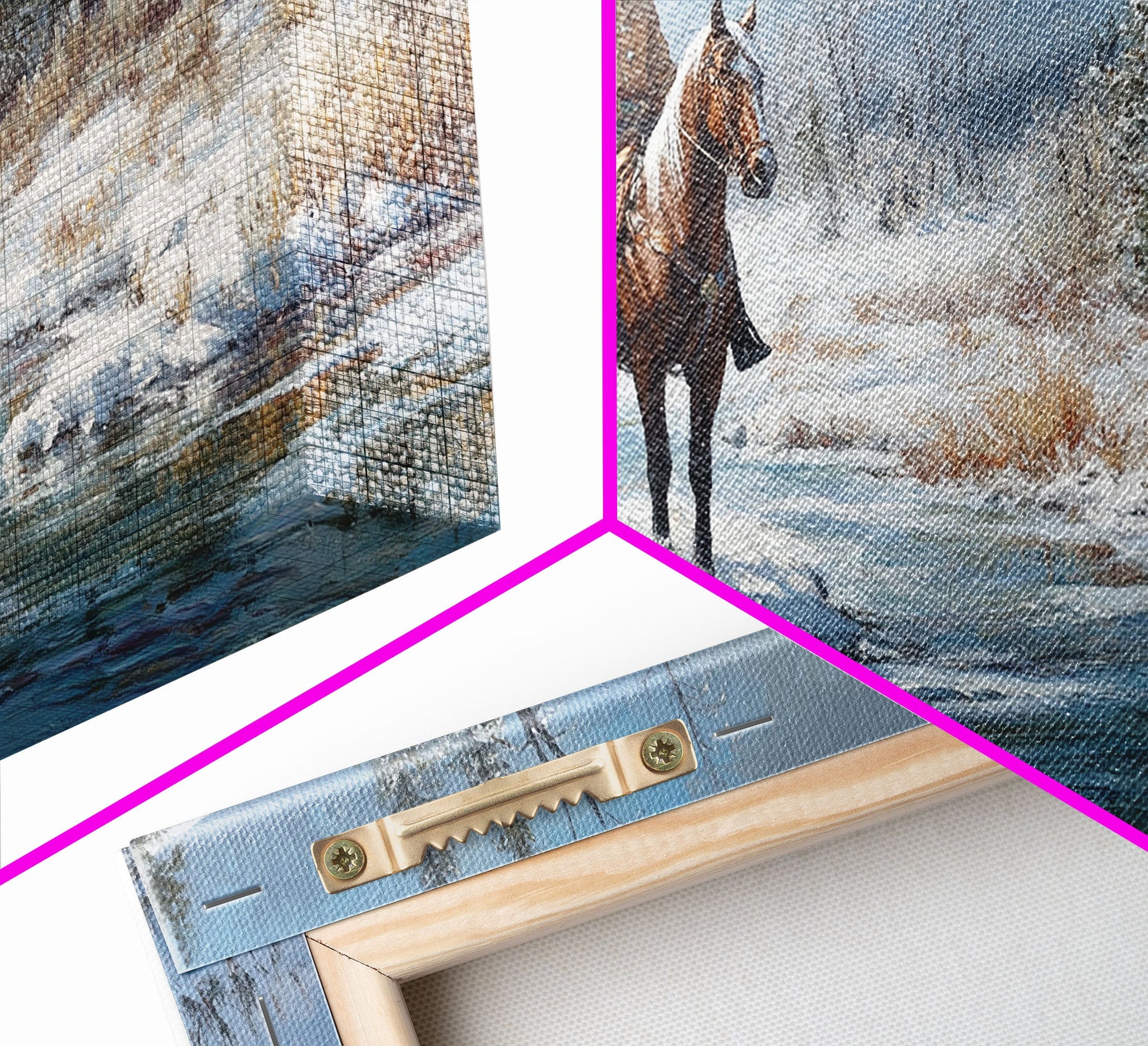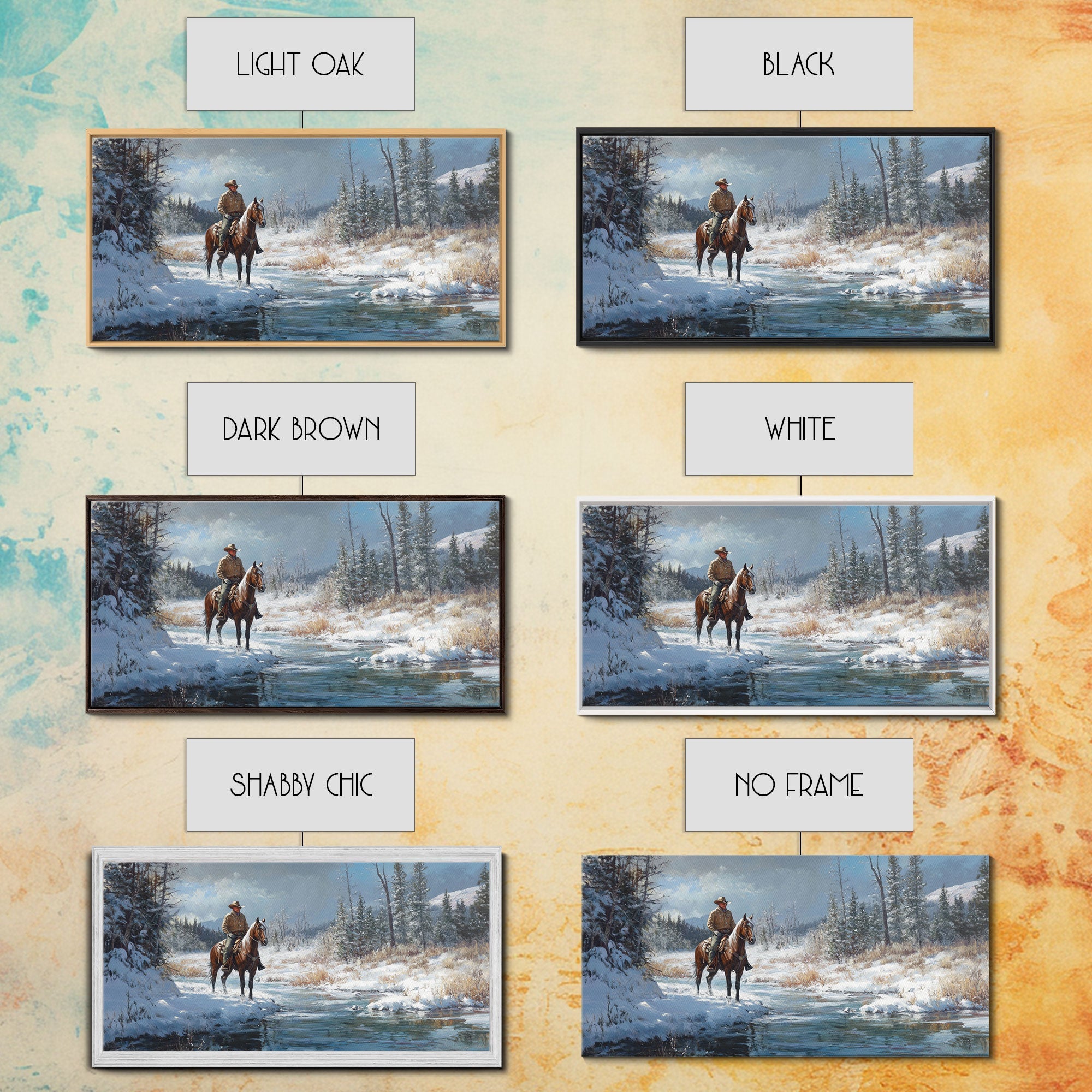 Cowboy riding horse through vibrant autumn forest, Framed Canvas Print, tall fall wall art, rustic western decor, moody landscape