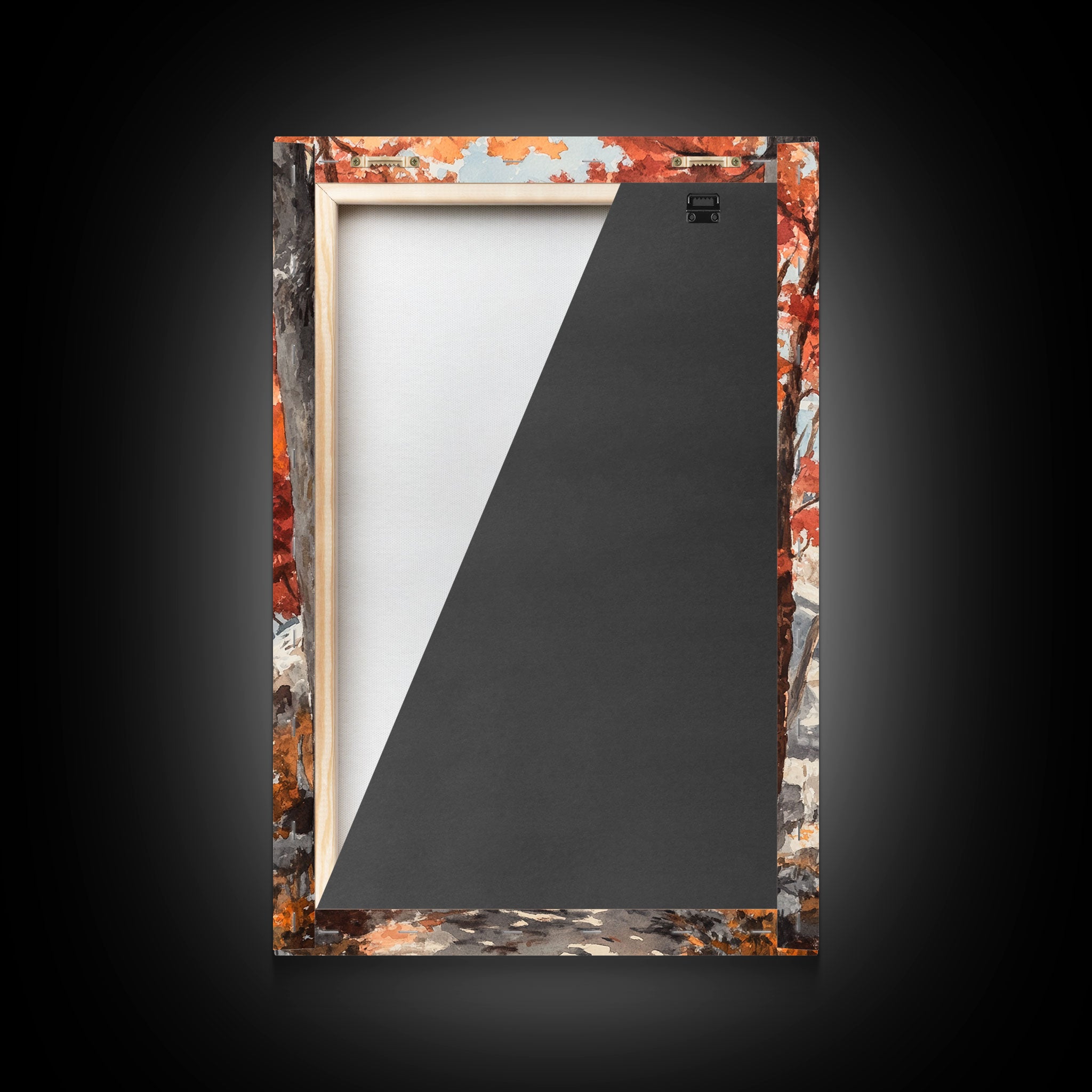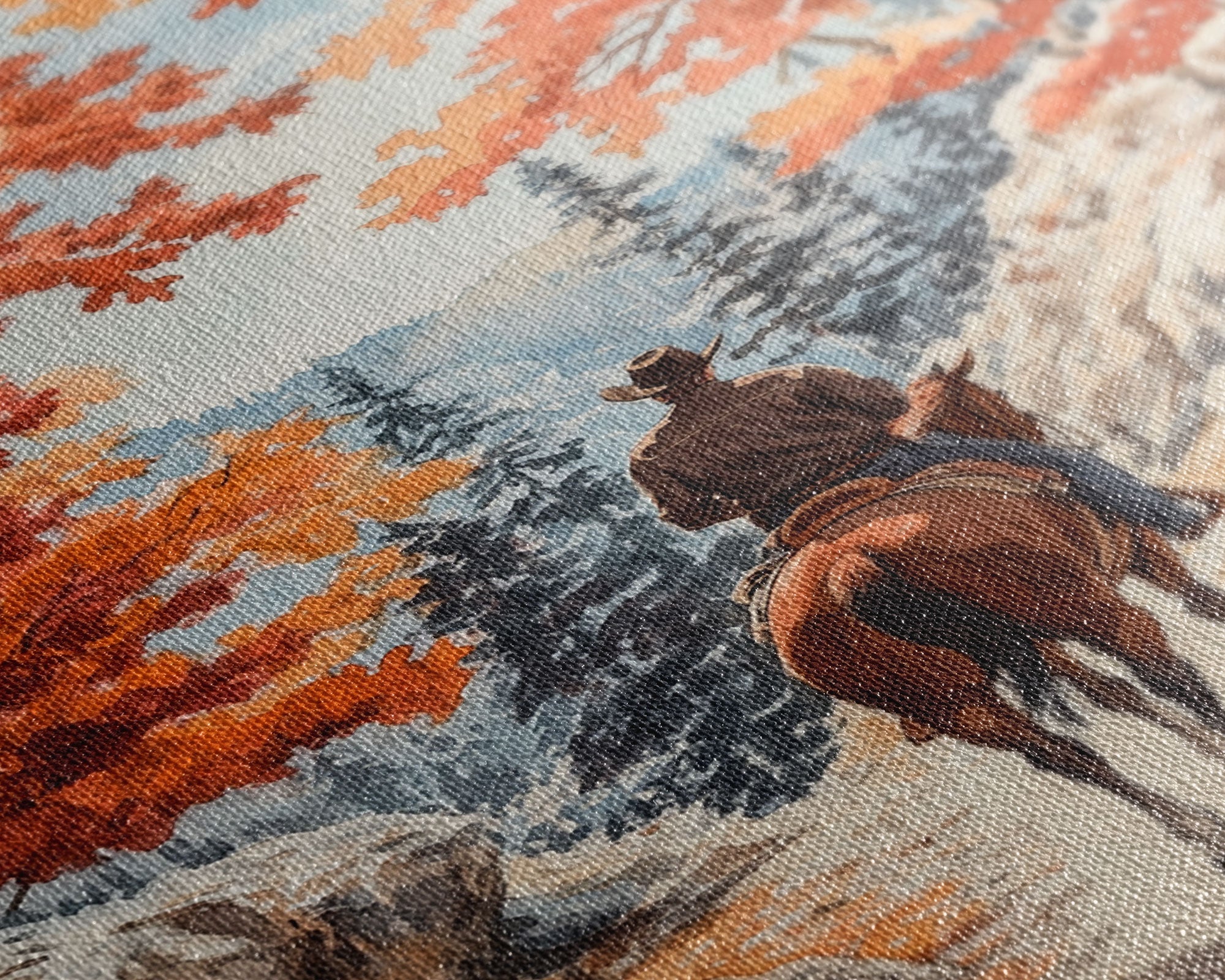 Cowboy riding through autumn forest, Framed Canvas Print, fall landscape wall art, western style decor for cozy homes, perfect gift idea