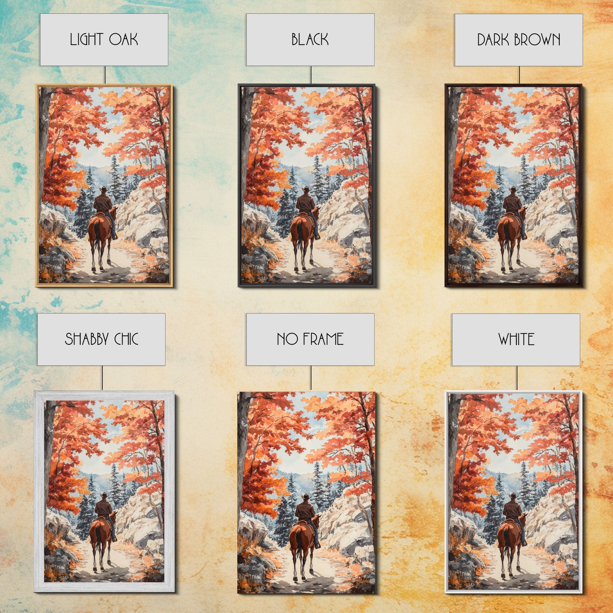 • Load image into Gallery viewer, Cowboy riding through autumn forest, Framed Canvas Print, fall landscape wall art, western style decor for cozy homes, perfect gift idea