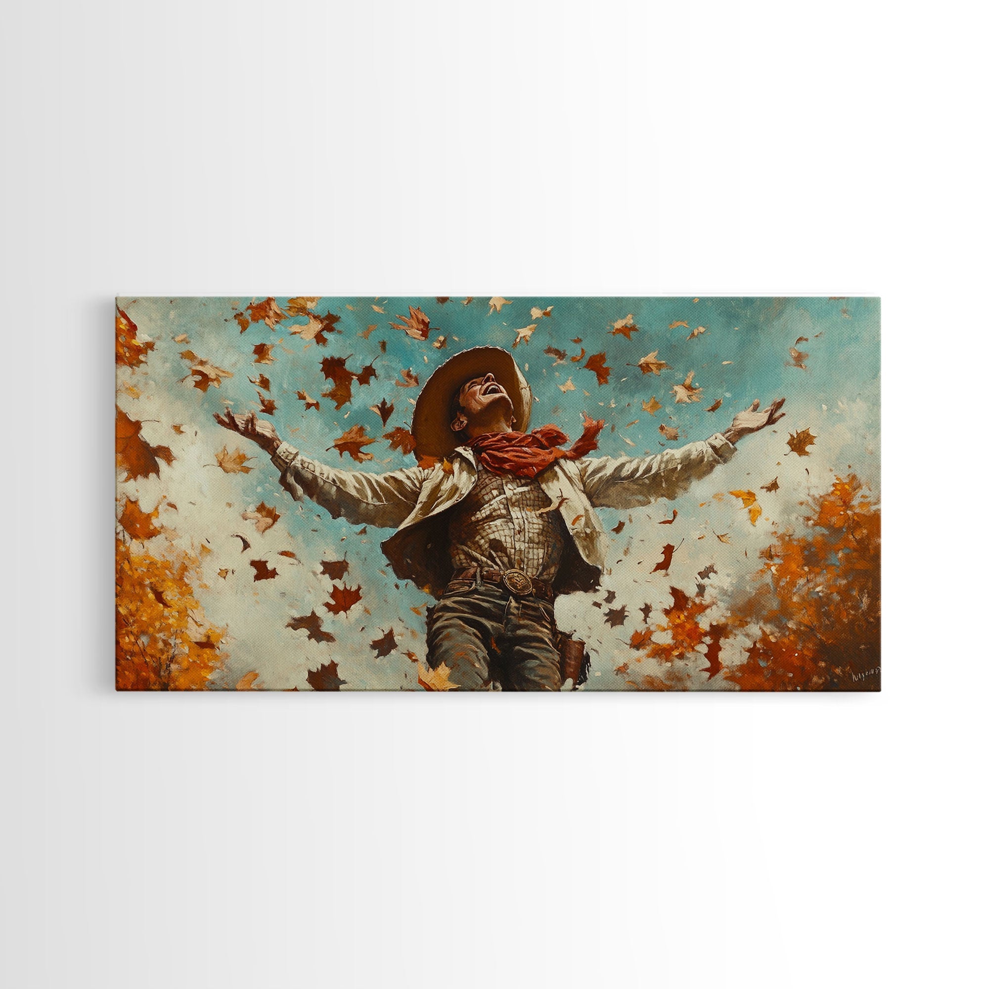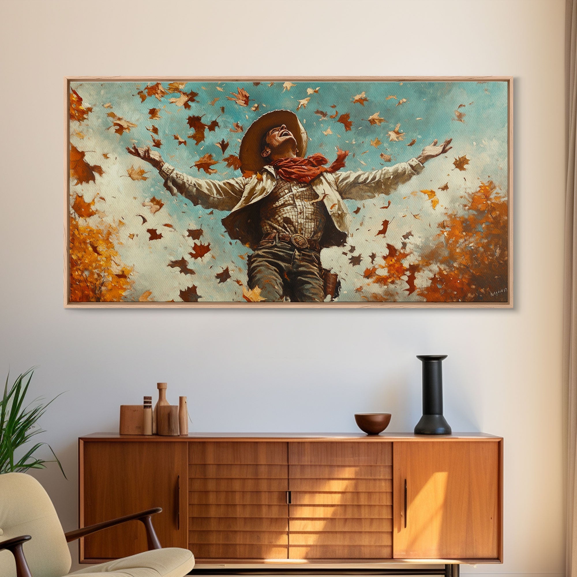 Cowboy Throwing Leaves In The Air, Funny Western Decor, Framed Canvas Print, Mood Lifting Wall Art, Fall Decor