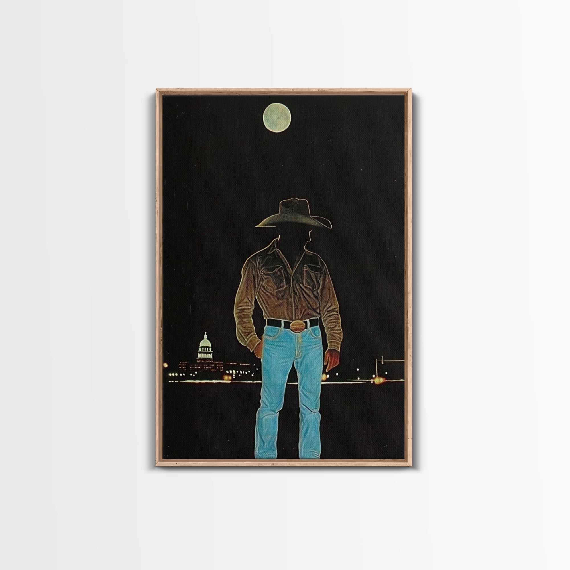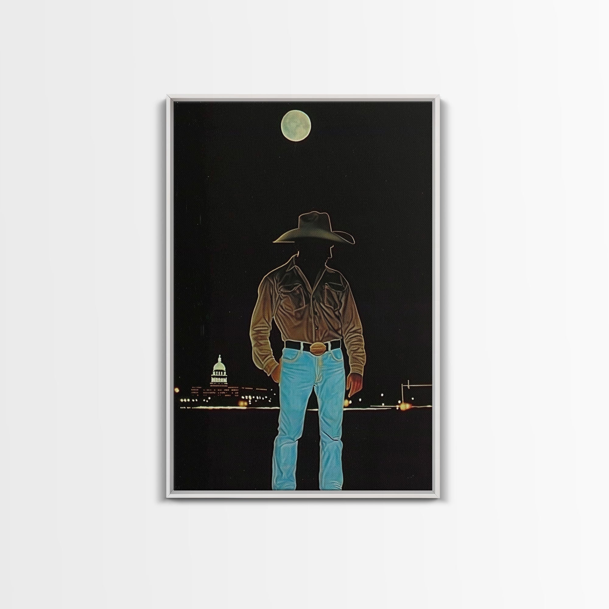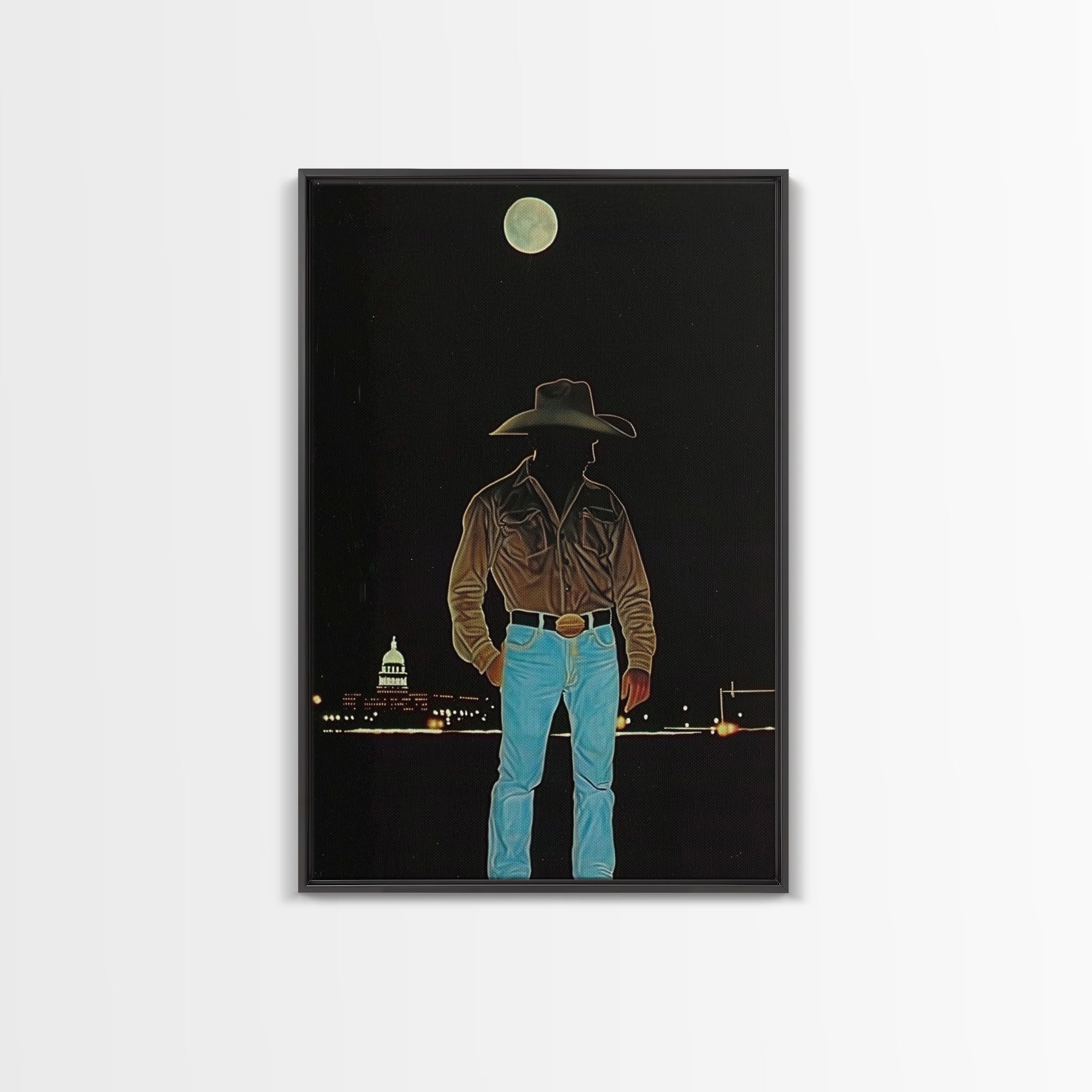 Cowboy Under the Moon Print - Framed Canvas Wall Art, Rustic Western Decor, Nighttime Cowboy Artwork for Living Room, Western Night Sky