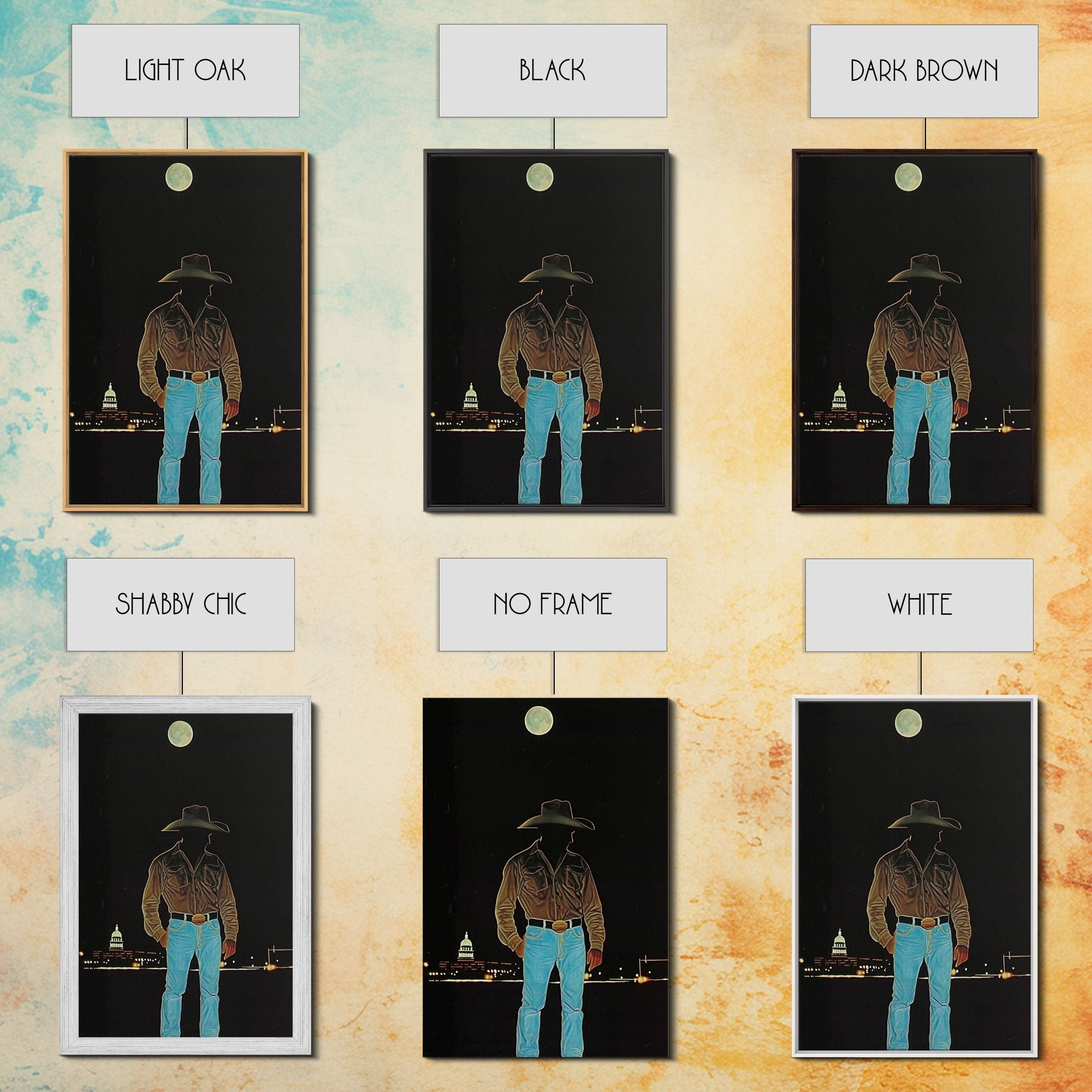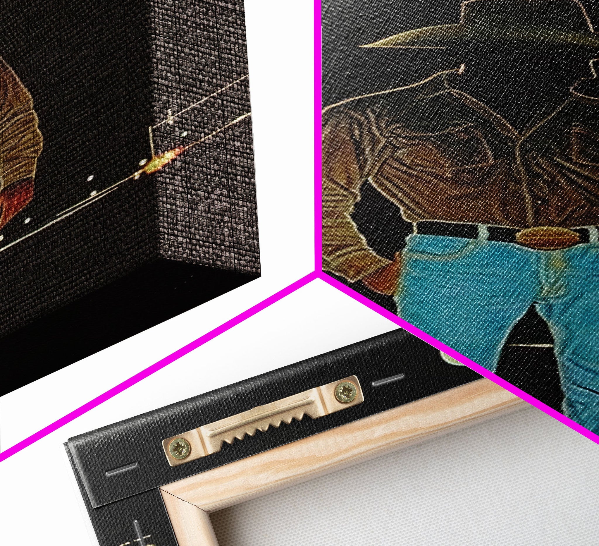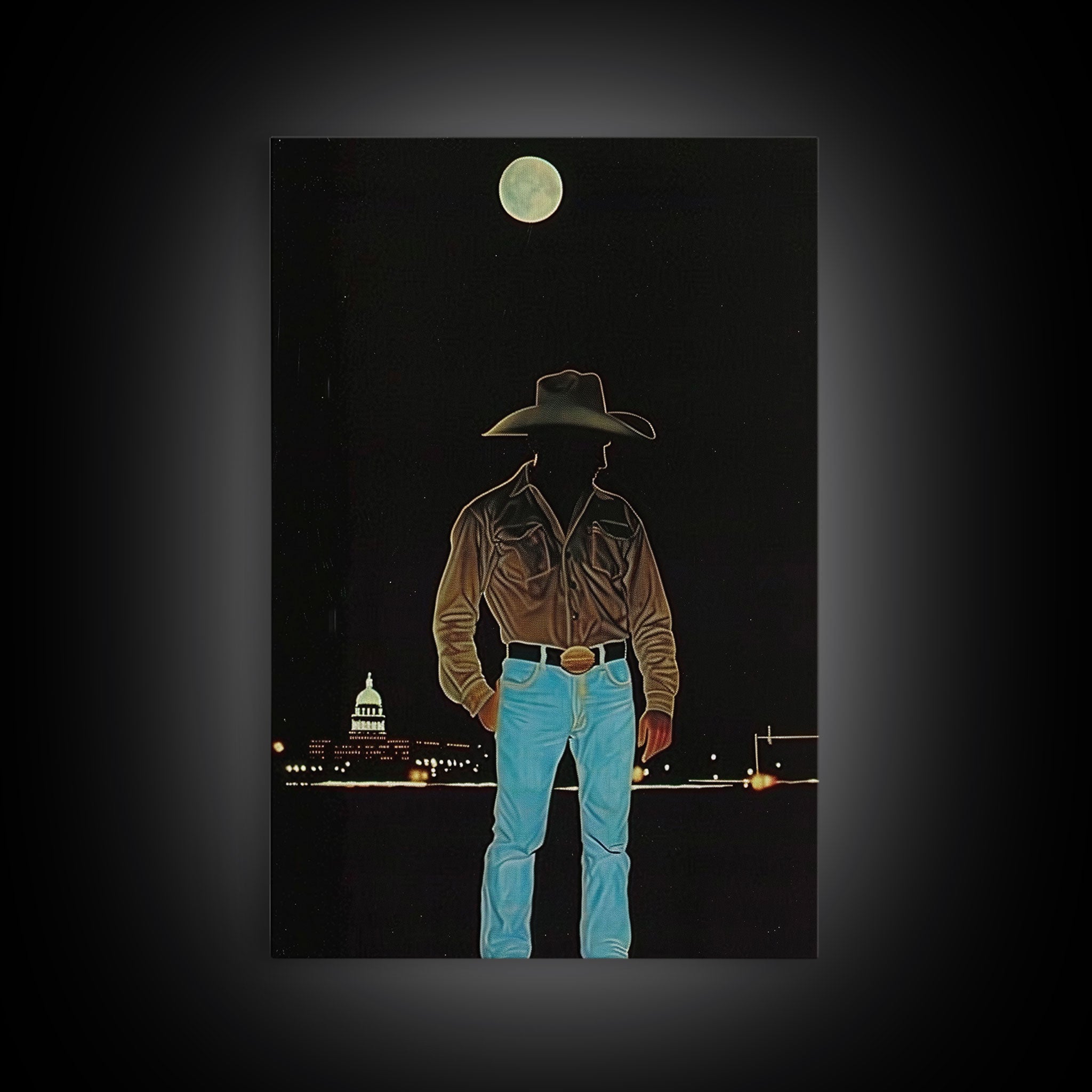 Cowboy Under the Moon Print - Framed Canvas Wall Art, Rustic Western Decor, Nighttime Cowboy Artwork for Living Room, Western Night Sky