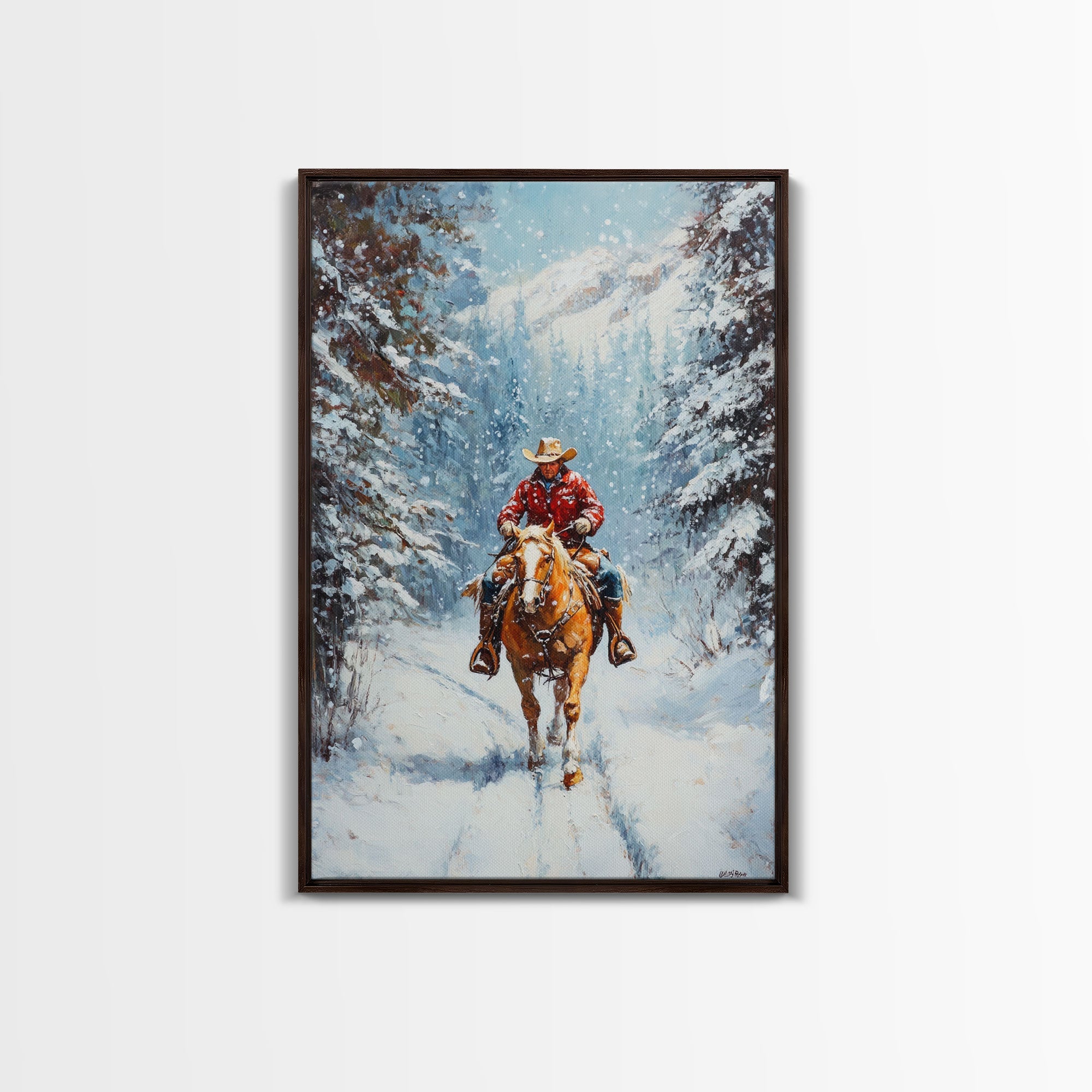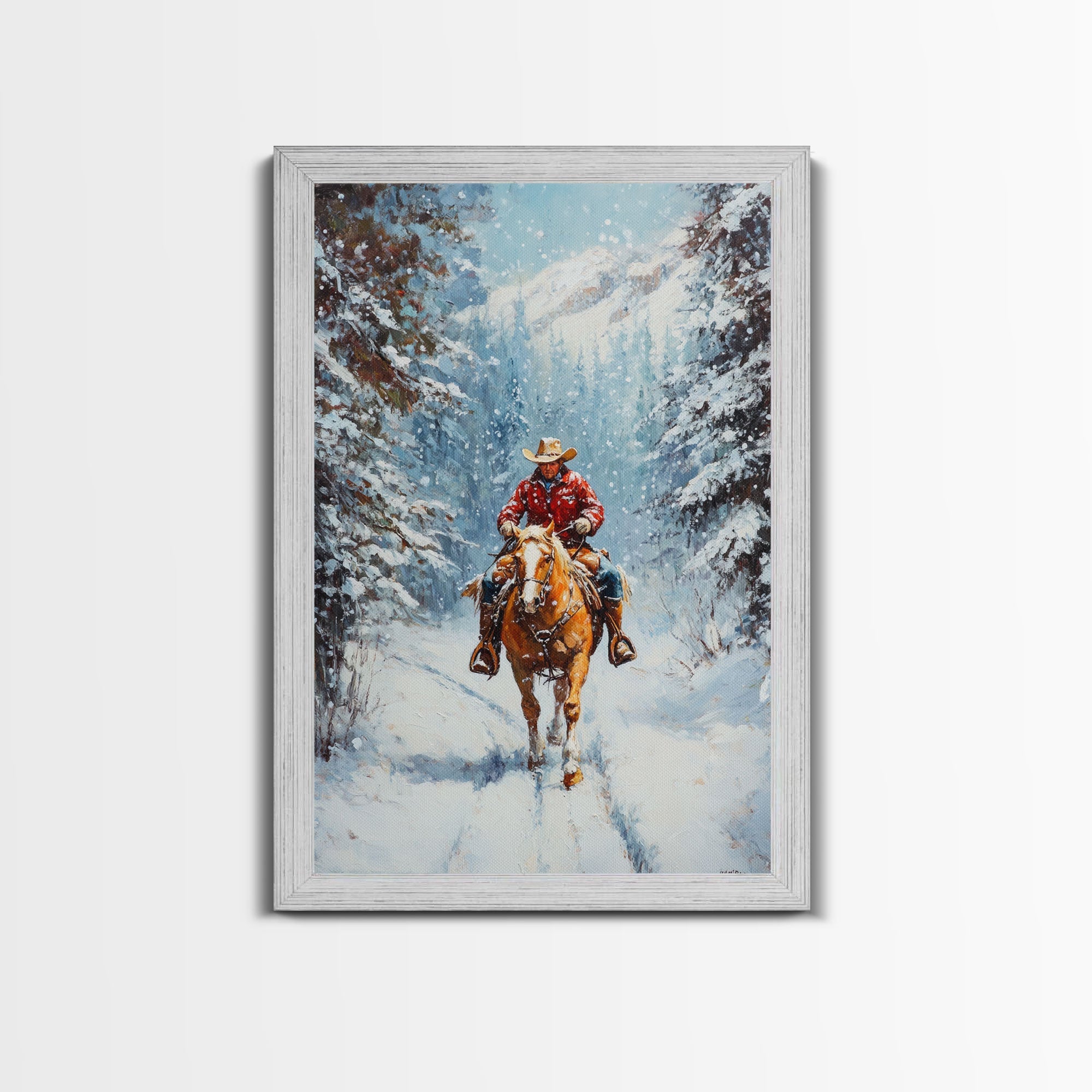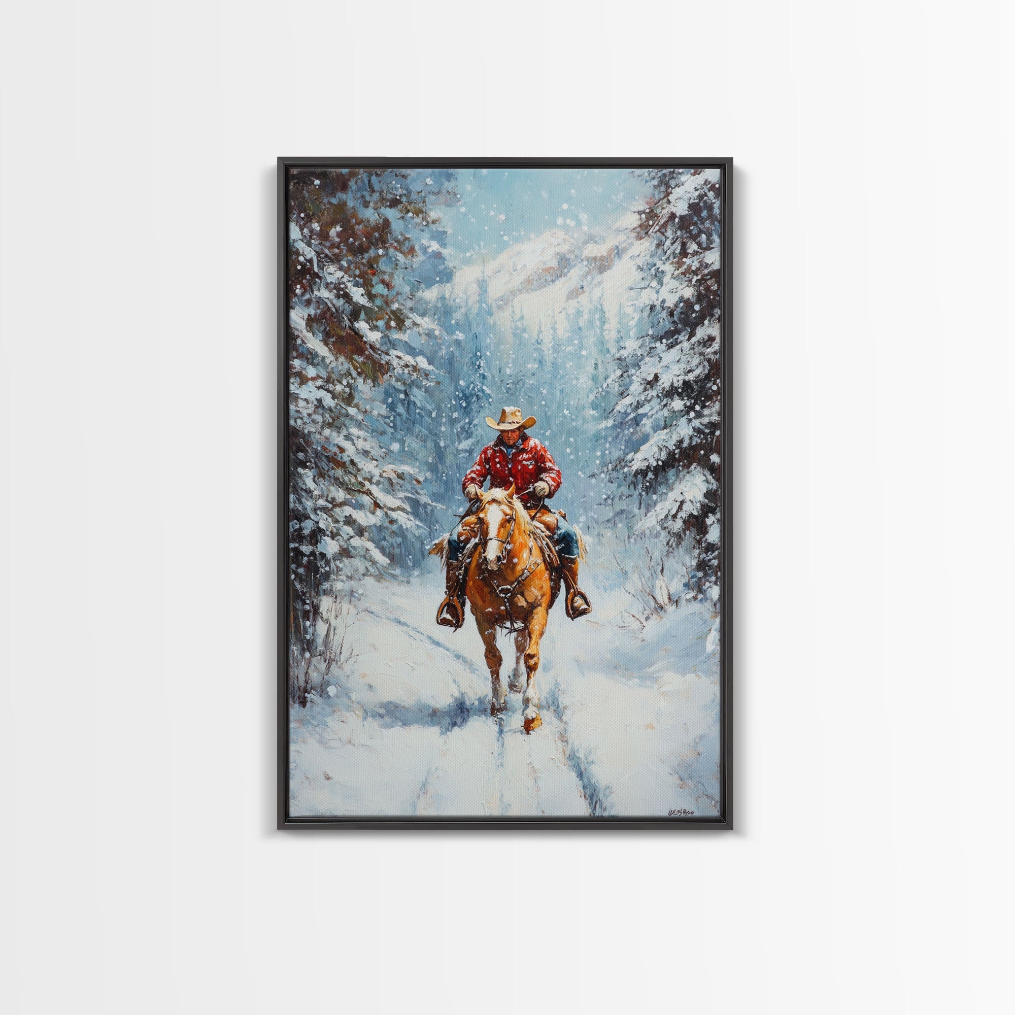 Cowboy Walking Through Snowy Winter Forest Canvas Print, Western Christmas Art Gift, Holiday Wall Decor, Rustic Art, Framed Canvas Print