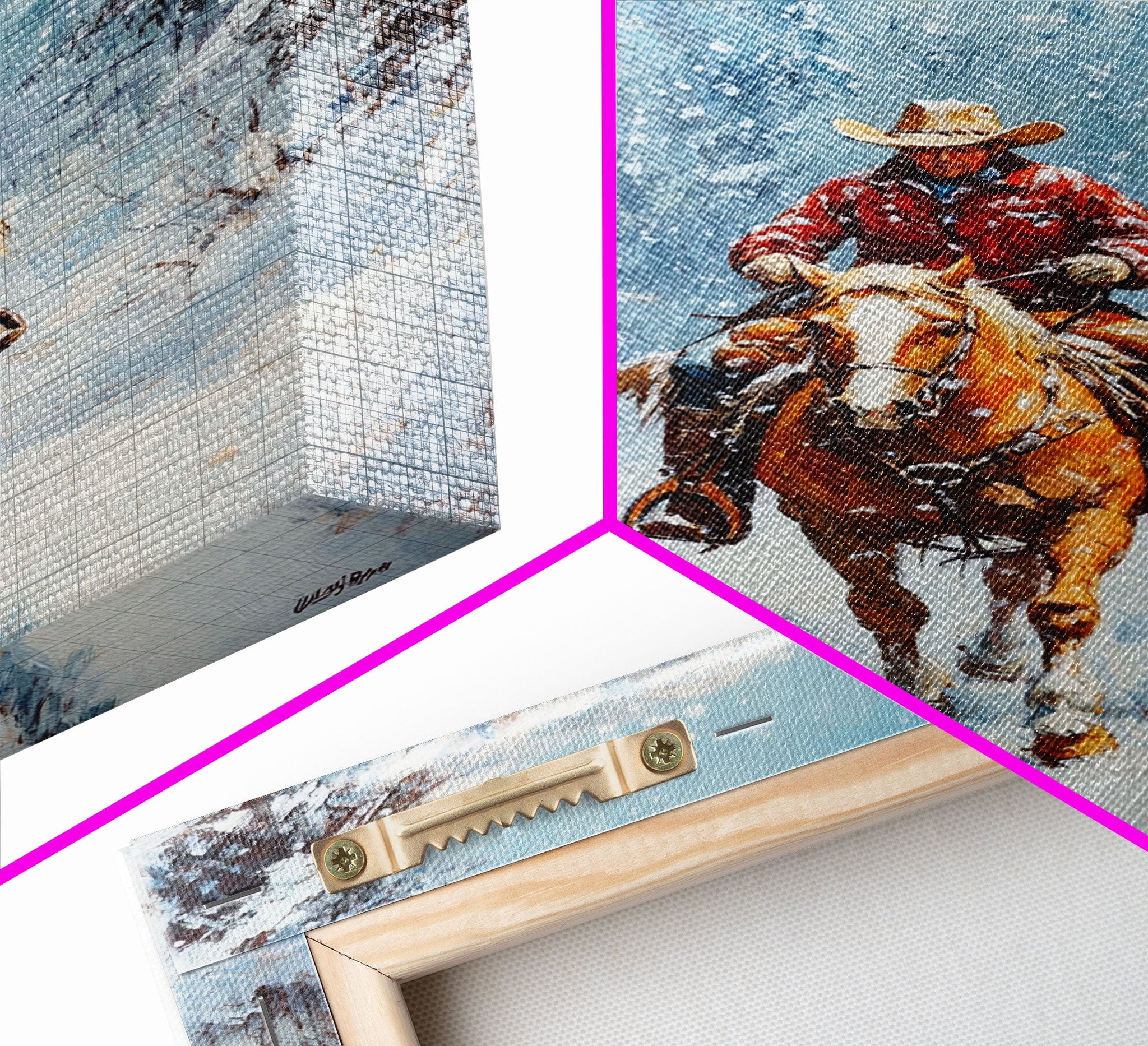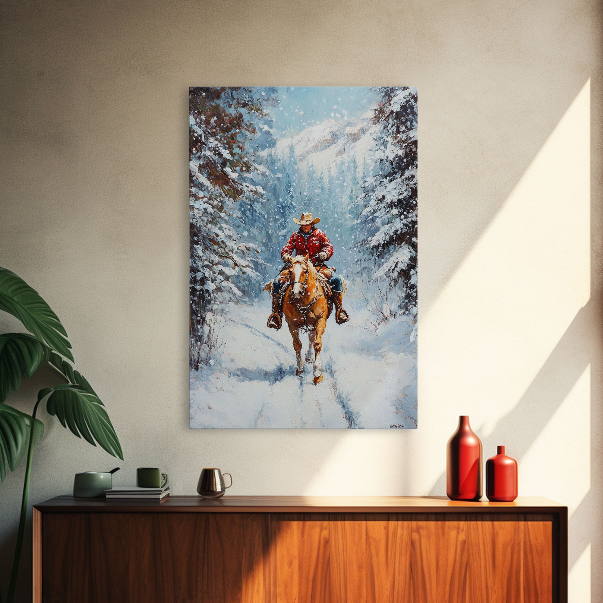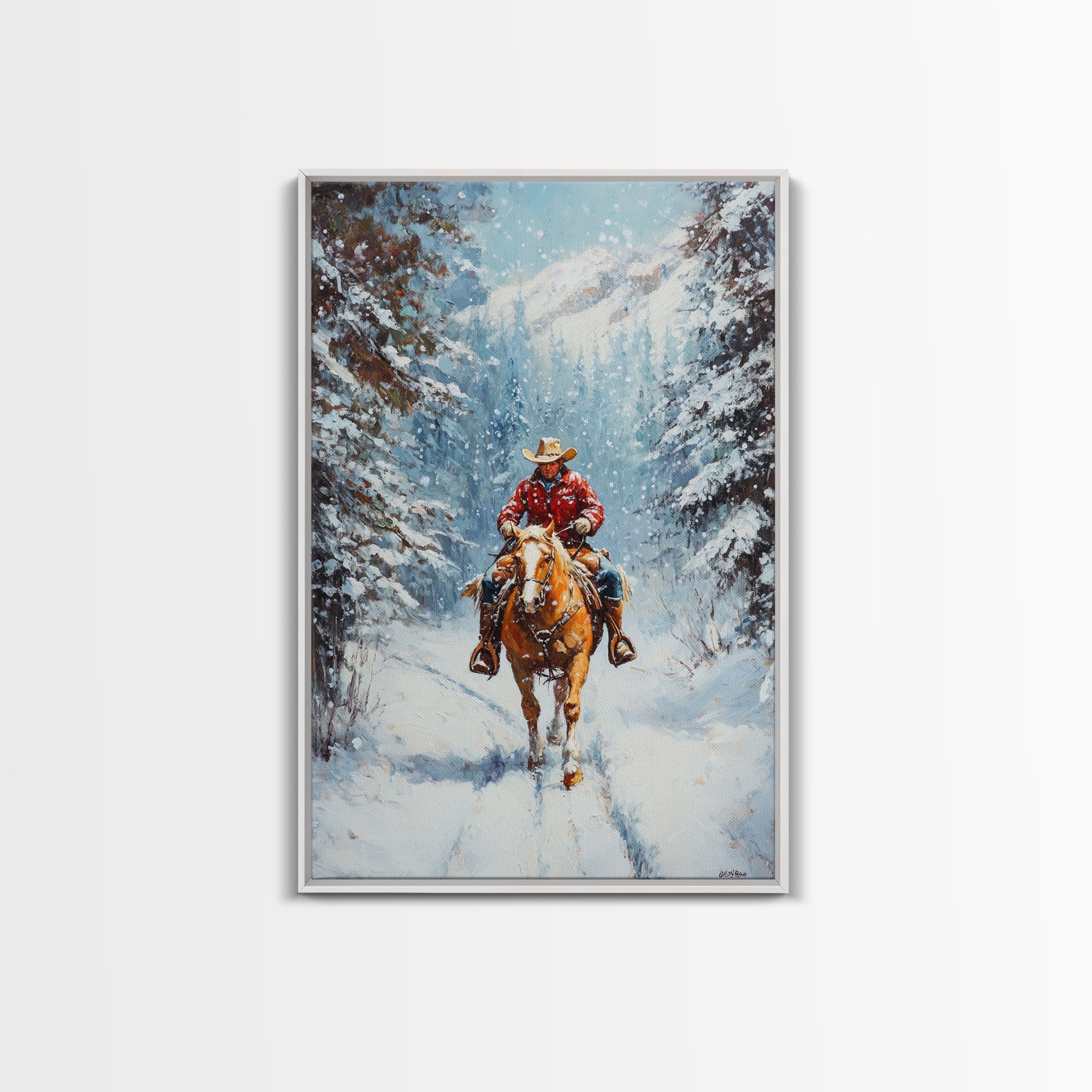 Cowboy Walking Through Snowy Winter Forest Canvas Print, Western Christmas Art Gift, Holiday Wall Decor, Rustic Art, Framed Canvas Print