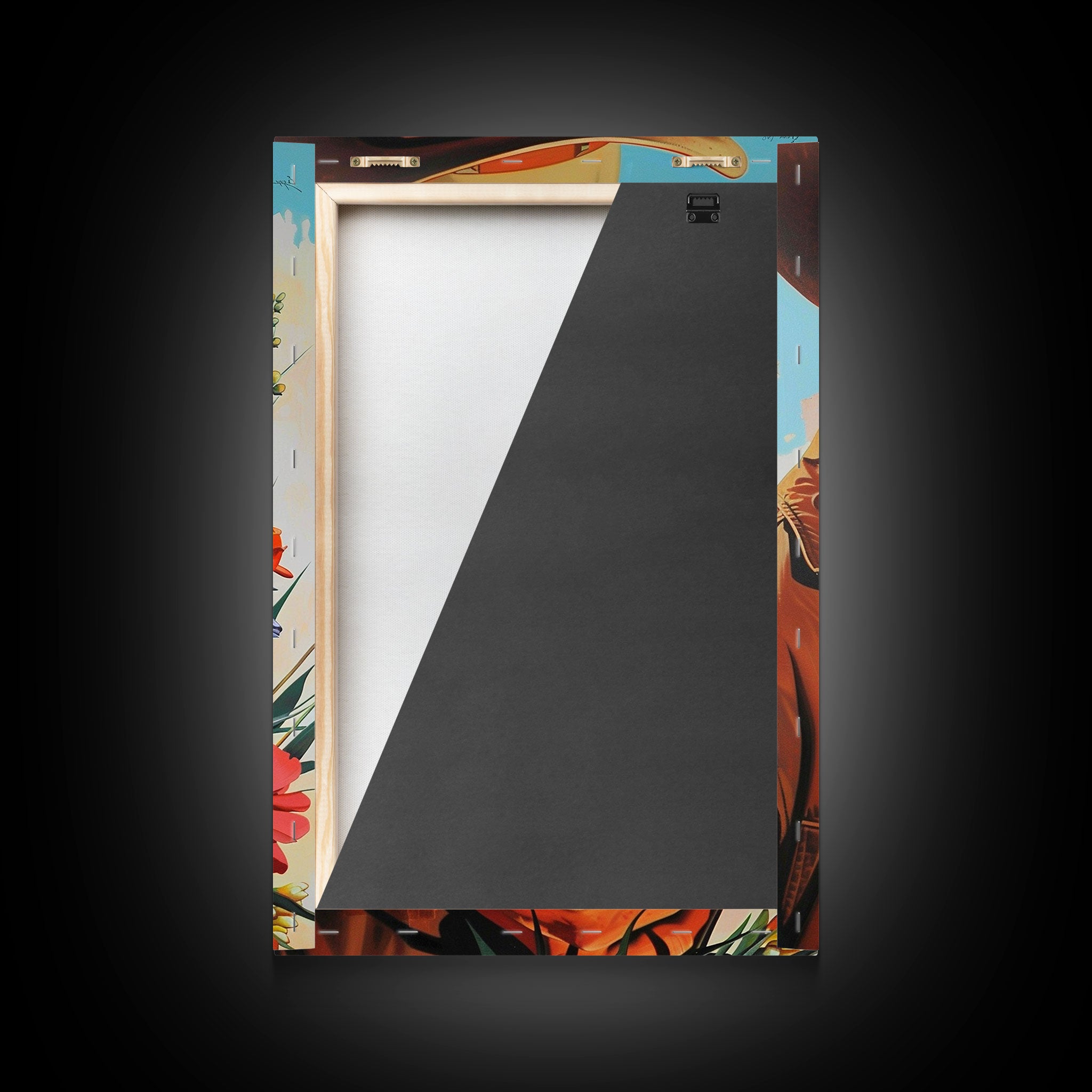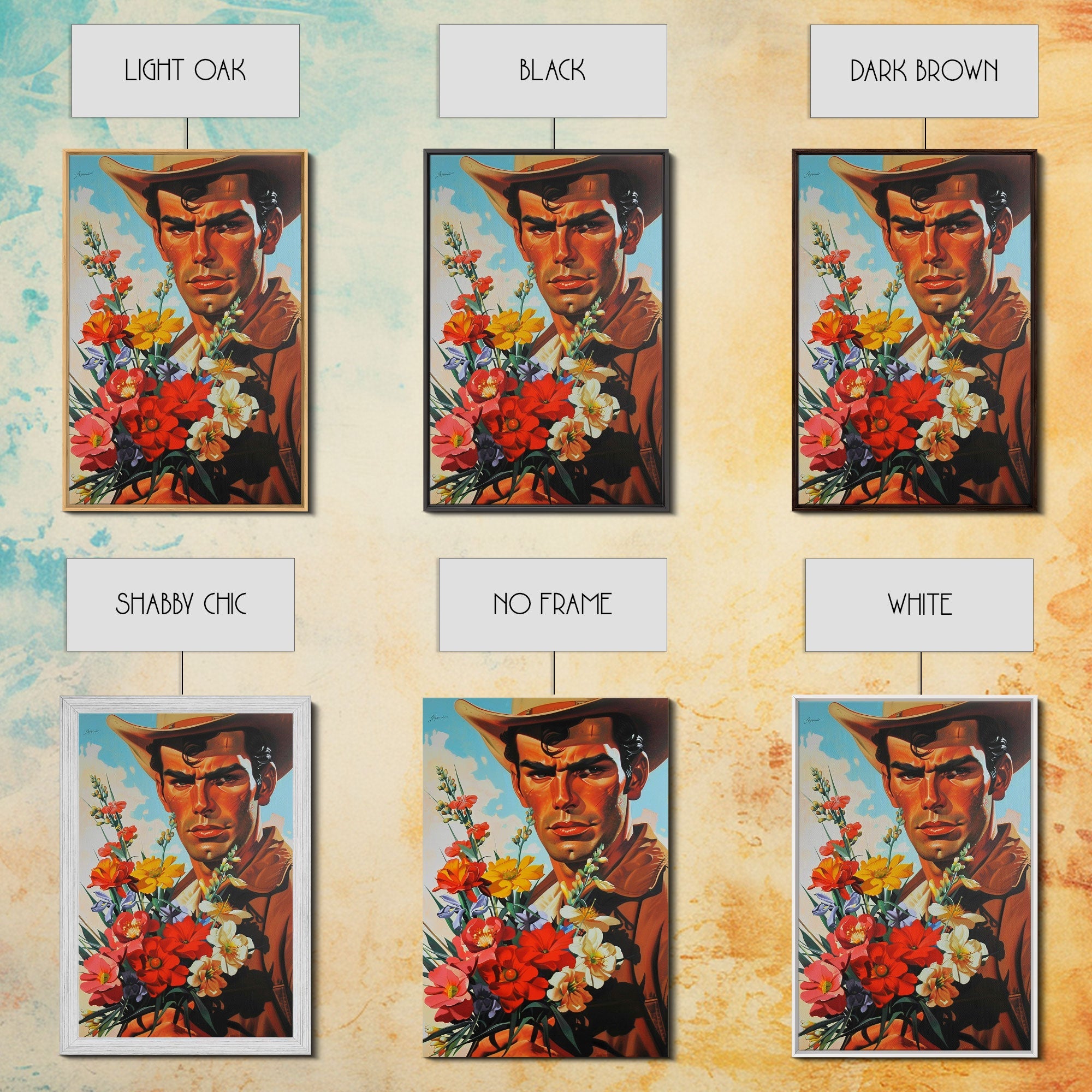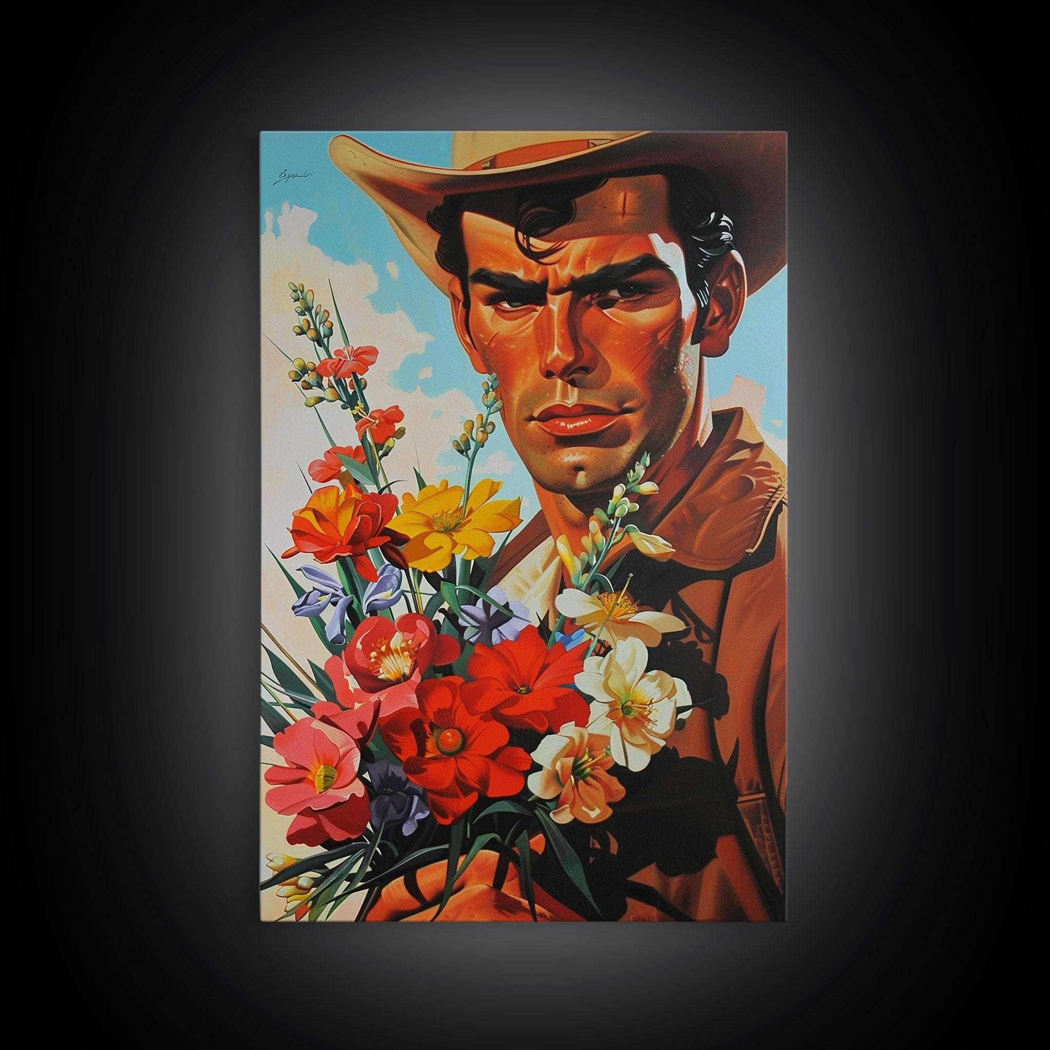 Cowboy with Bouquet of Flowers - Framed Canvas Print, Western Living Room Art, Rustic Bedroom Decor, Americana Art, Wall Art