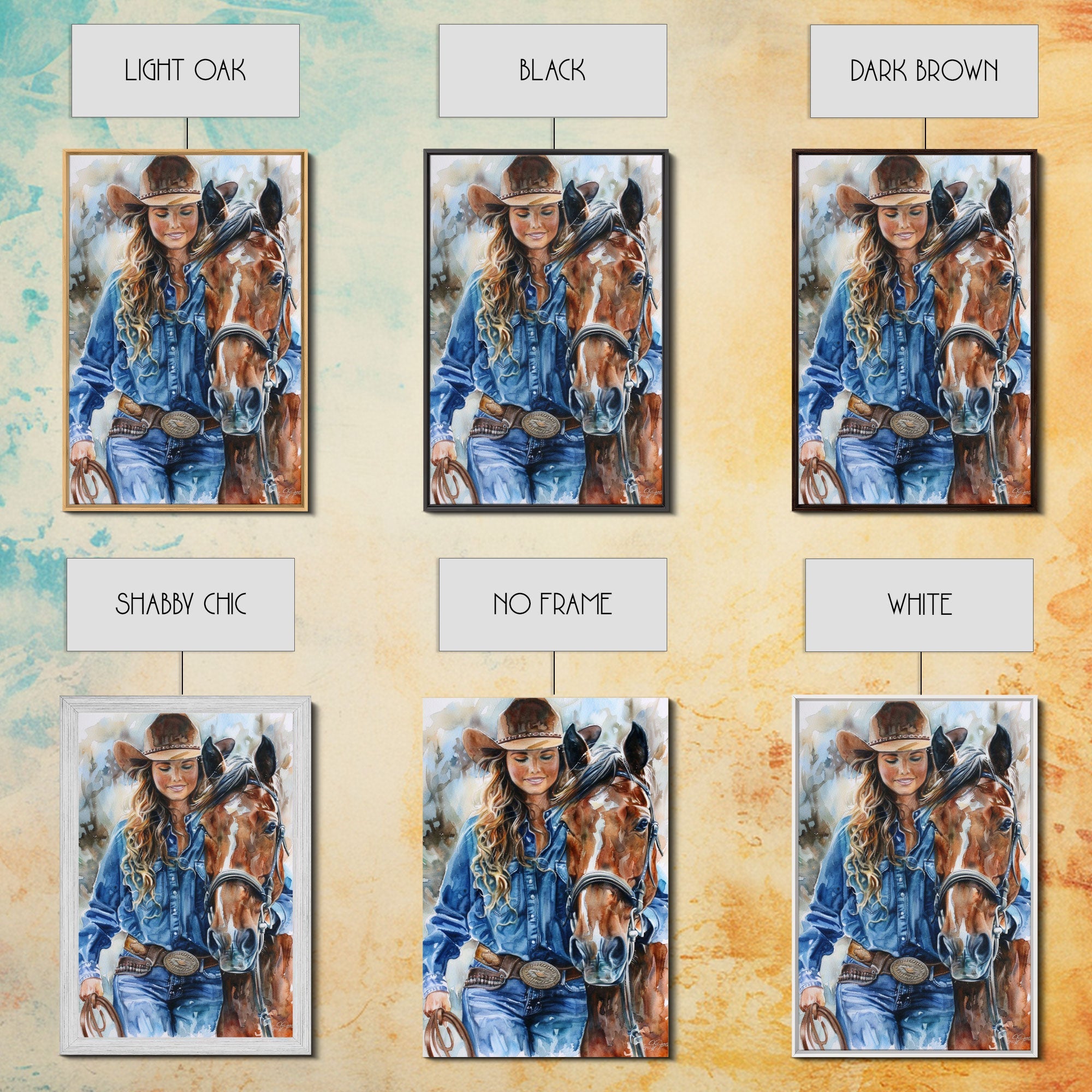 Cowgirl Embracing Horse with Hat - Framed Canvas Print, Western Wall Art, Rustic Decor, Living Room and Bedroom Art Print