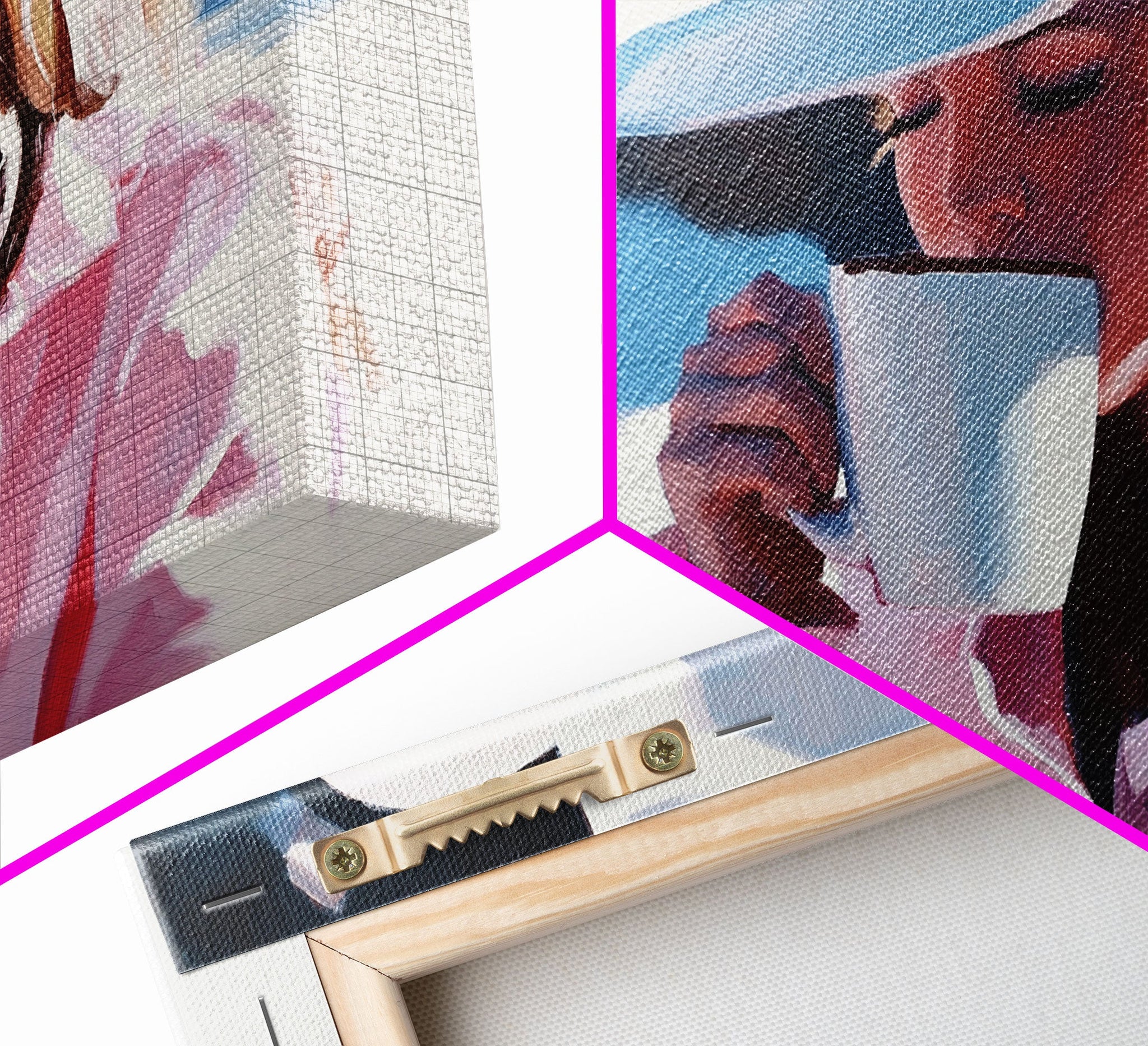 Cowgirl Enjoying A Cup of Coffee, Framed Canvas Print, Winter Wall Art, Pink Decor, Gift For Her, Seasonal Winter Home Decor