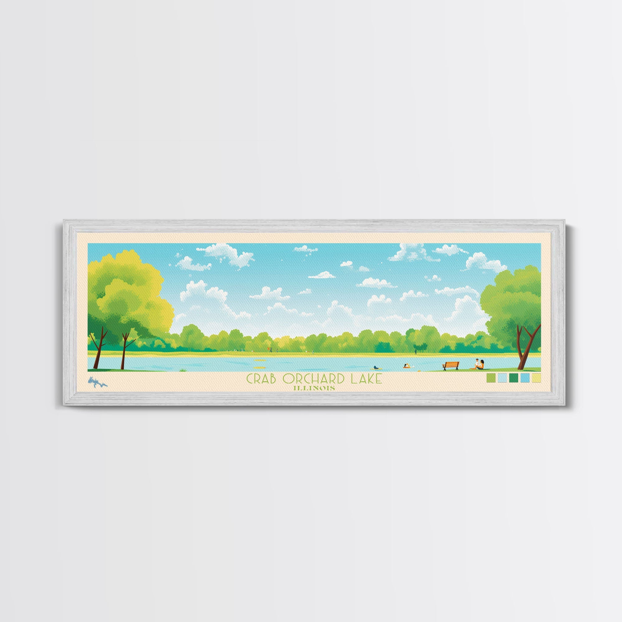 • Load image into Gallery viewer, Crab Orchard Lake Illinois Framed Canvas Print, Midcentury Modern Panoramic Wall Art, Living Room Decor, Pop Art, Travel Poster Art, Scenic Nature Painting, Lake House Decor