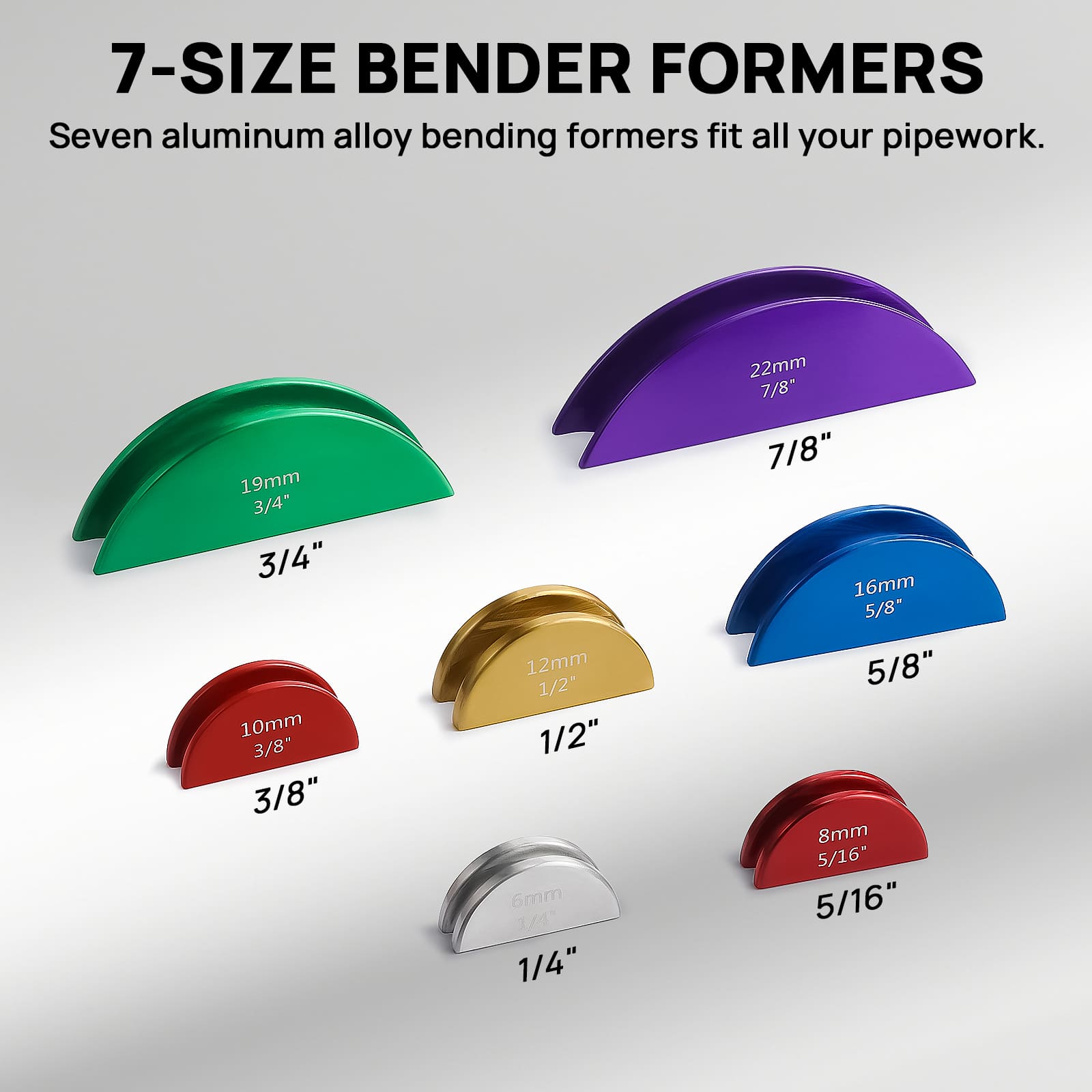 - Color-Coded Bender Heads: Features bending heads in seven colors that fit tube diameters of 1/4 in, 5/16 in, 3/8 in, 1/2 in, 5/8 in, 3/4 in, and 7/8 in; made of aluminum alloy for damage resistance and long-lasting use