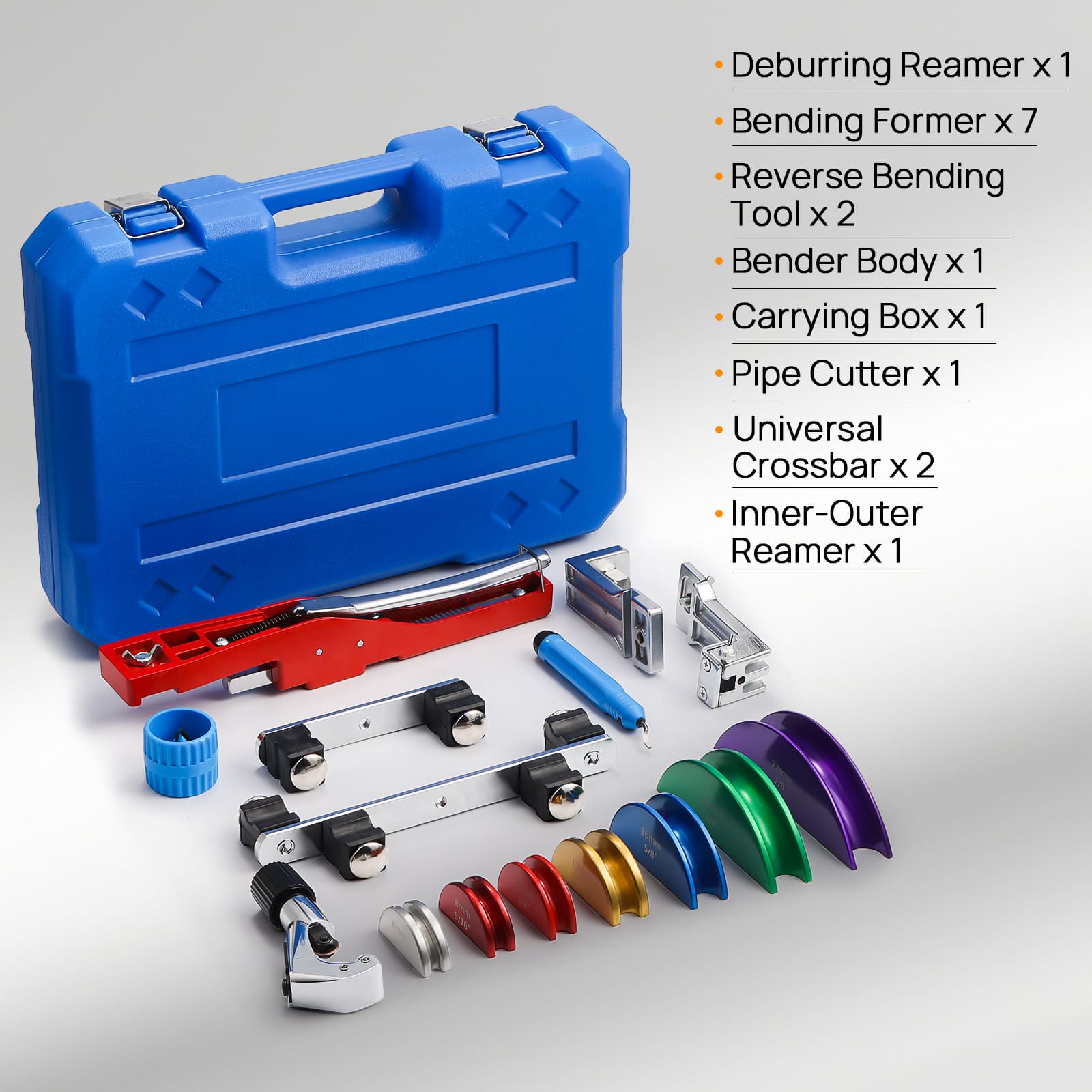 - All-in-One Operation: Comes with a bender body, pipe cutter, deburring reamer, inner-outer reamer, reverse bending tool, fixed supports, and a carrying box for convenient storage and easy transport to various worksites