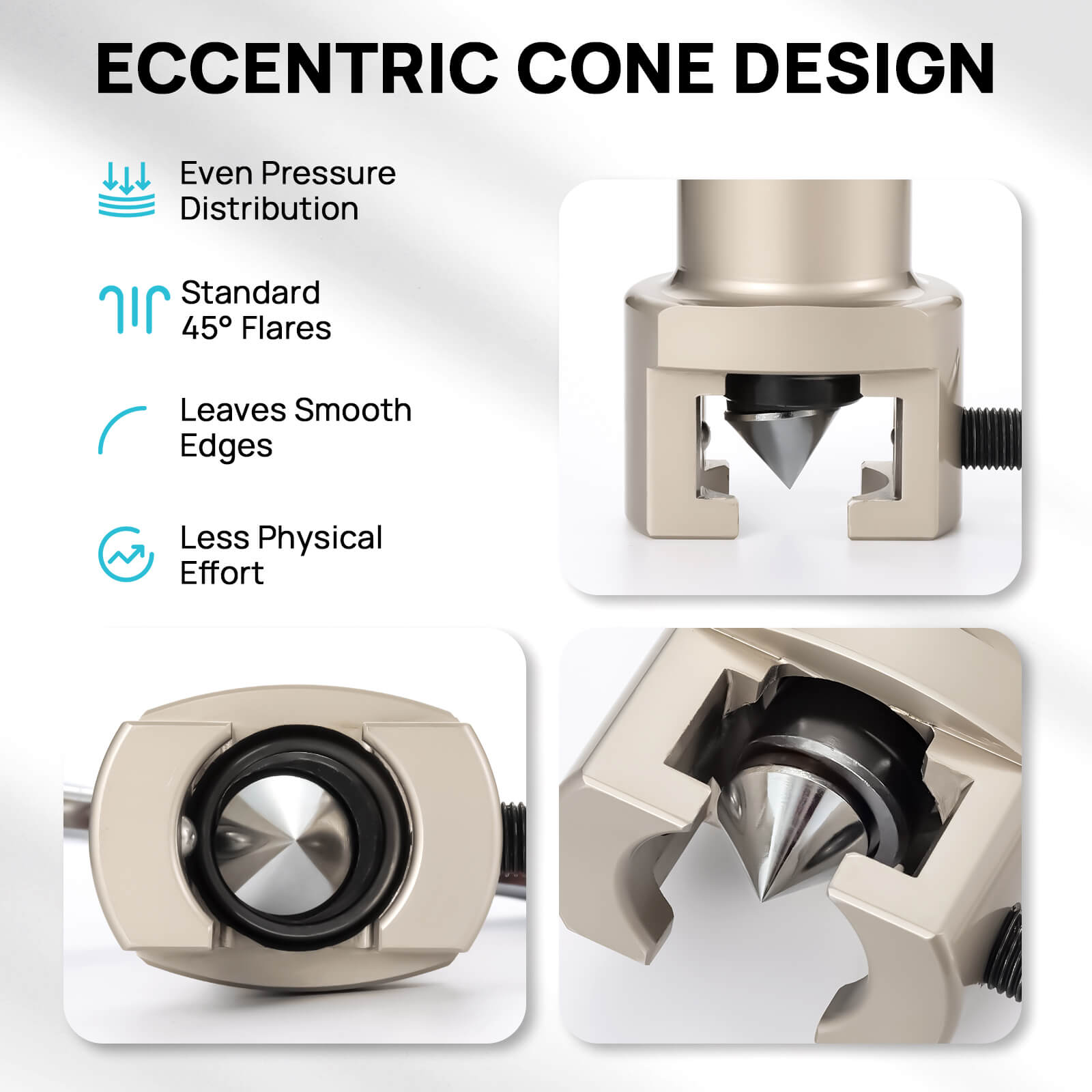 - Eccentric Flaring Design: Provides even pressure for smooth flaring; reduces material damage; helps ensure leak-free connections; requires less effort during operation