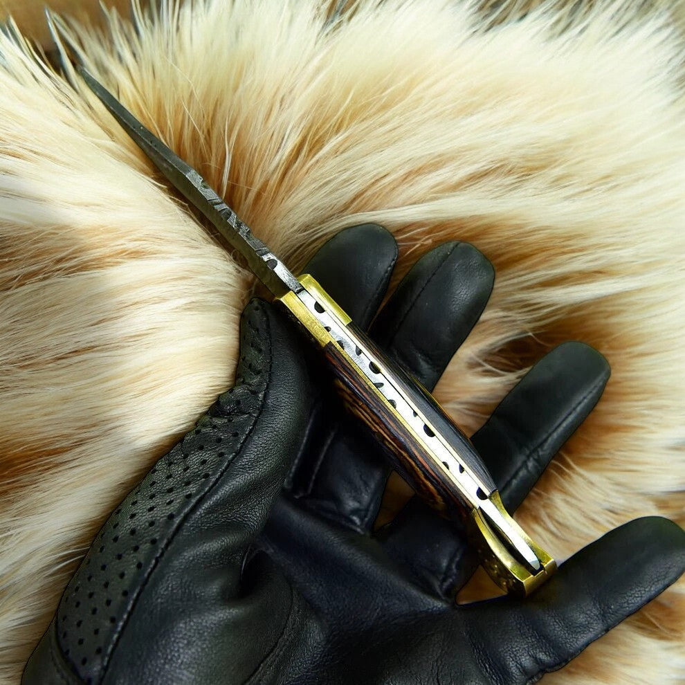 This custom handmade pocket knife features a 3-inch Damascus steel blade known for its sharpness and durability. The exotic wood handle, complemented by an engraved brass bolster, offers a sleek and elegant look. The back lock mechanism ensures secure use, and it comes with a durable leather case for easy carrying and protection. Perfect for collectors or those who value craftsmanship and functionality in their pocket knives.