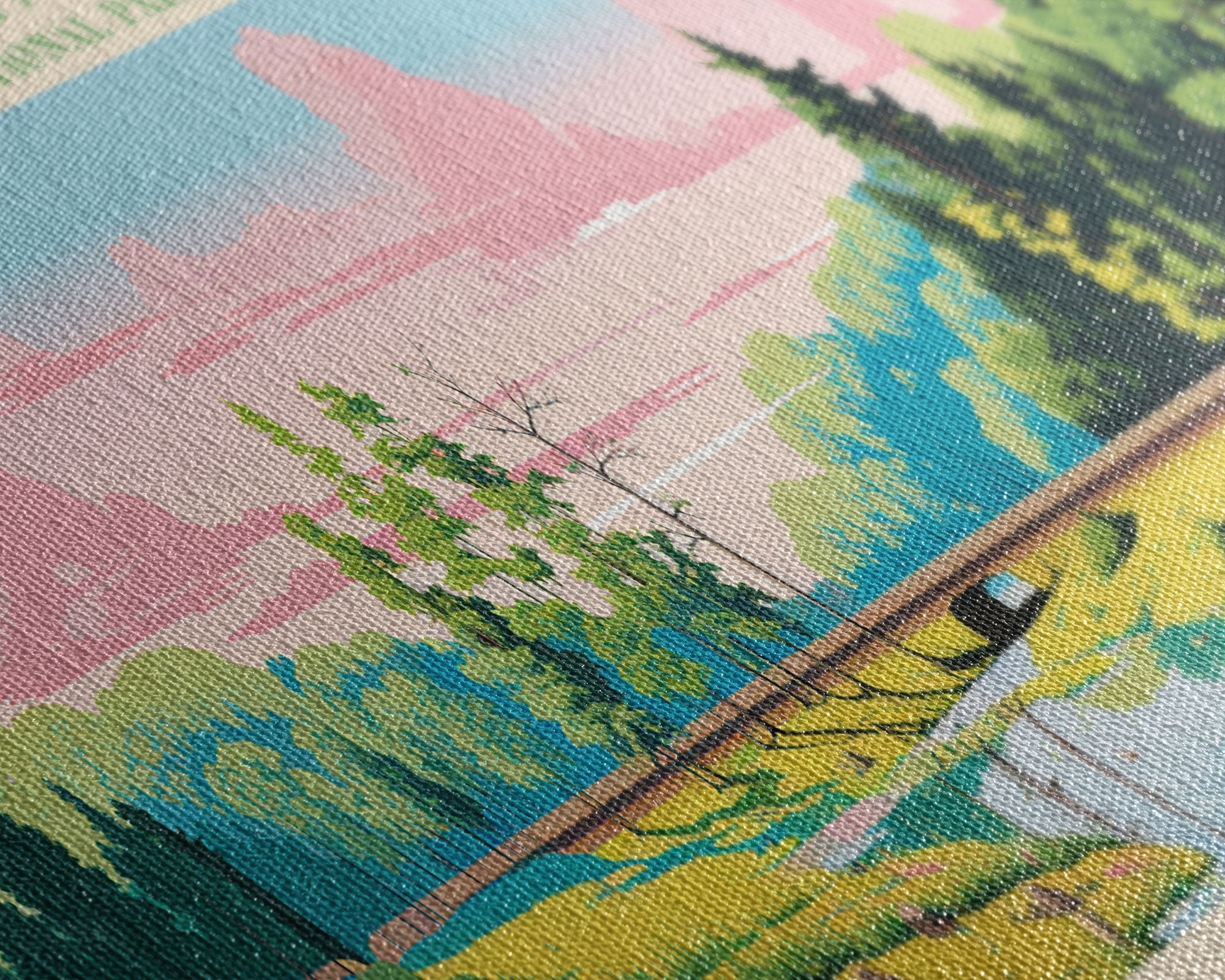 Most of our canvases are made in the USA, with the exception of canvases ordered with the light oak unstained frames, and any large canvases (24x48, 30x60, 16x48 and 20x60) ordered WITH a frame. These are temporarily made in and shipped from Europe, while we try to find a more consistent supplier in the USA.