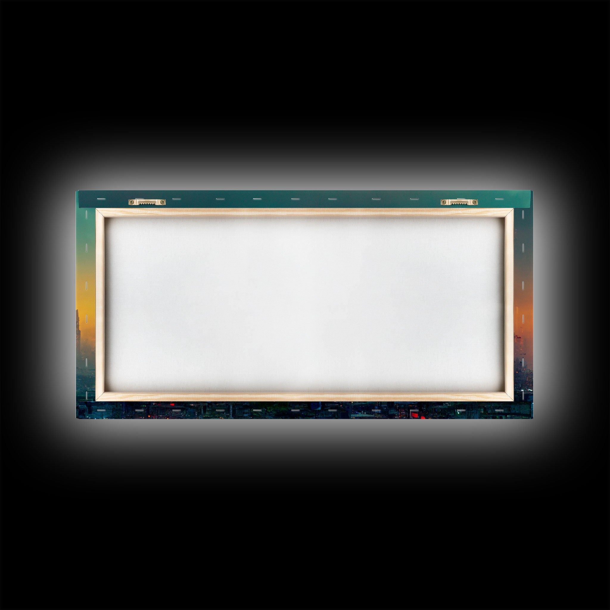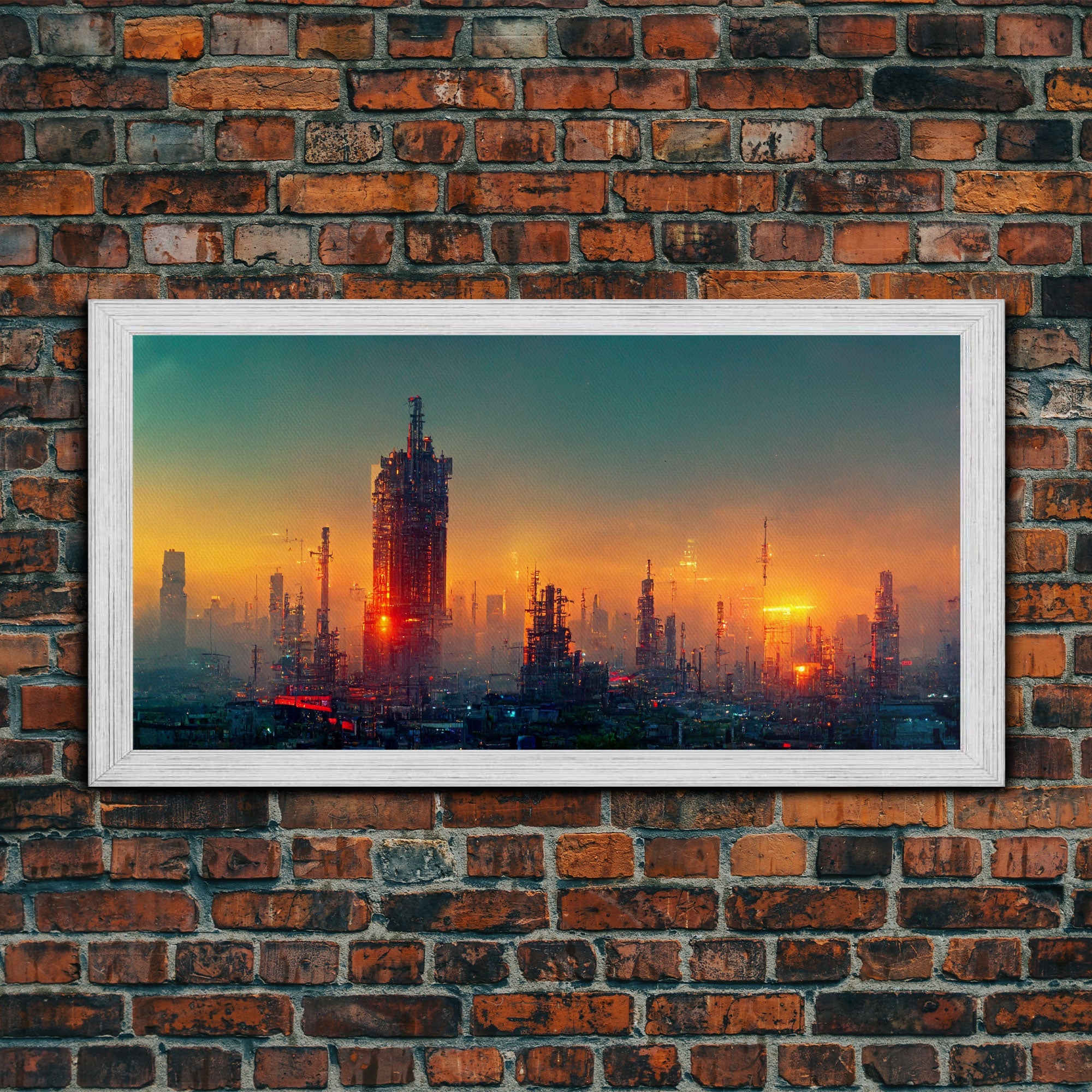 Cyberpunk city canvas art, video game concept art, living room wall art, dystopian art, outrun style city at sunset, man cave wall art