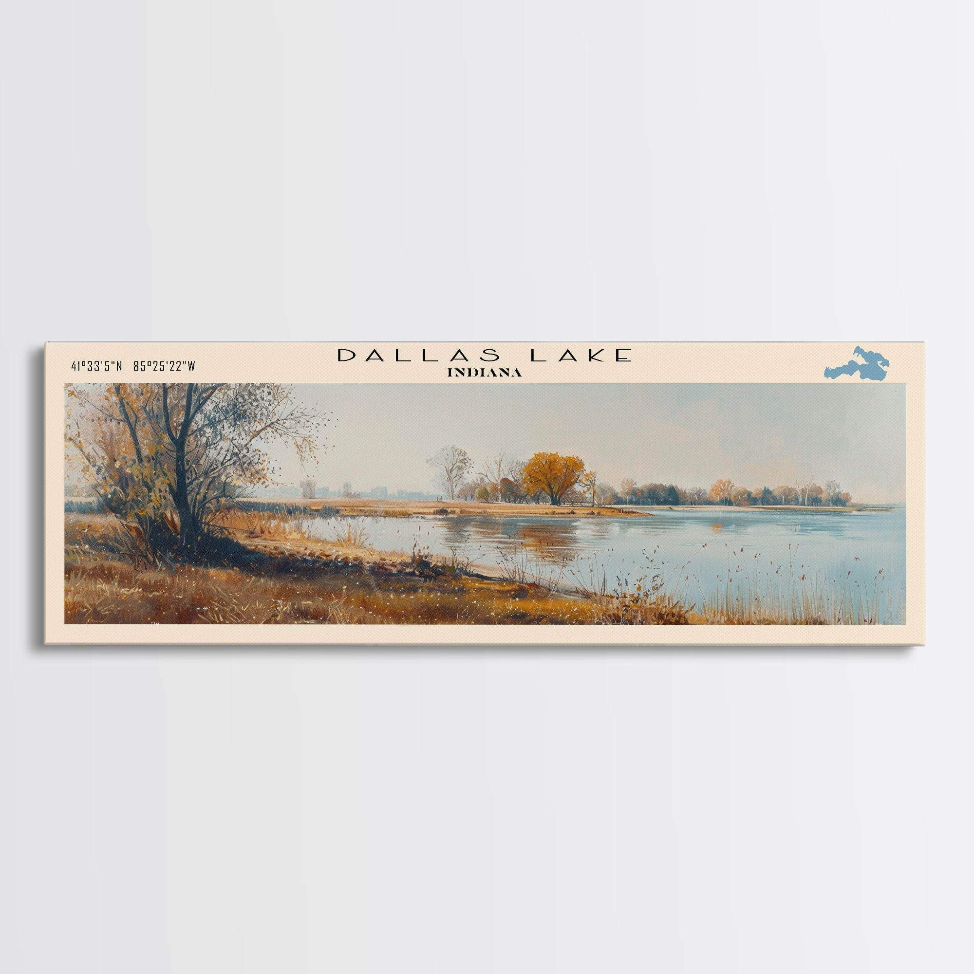 Dallas Lake Indiana Framed Canvas Print, Lake House Decor, Panoramic Wall Art, Travel Poster, Rustic Lake Painting, Home Decor
