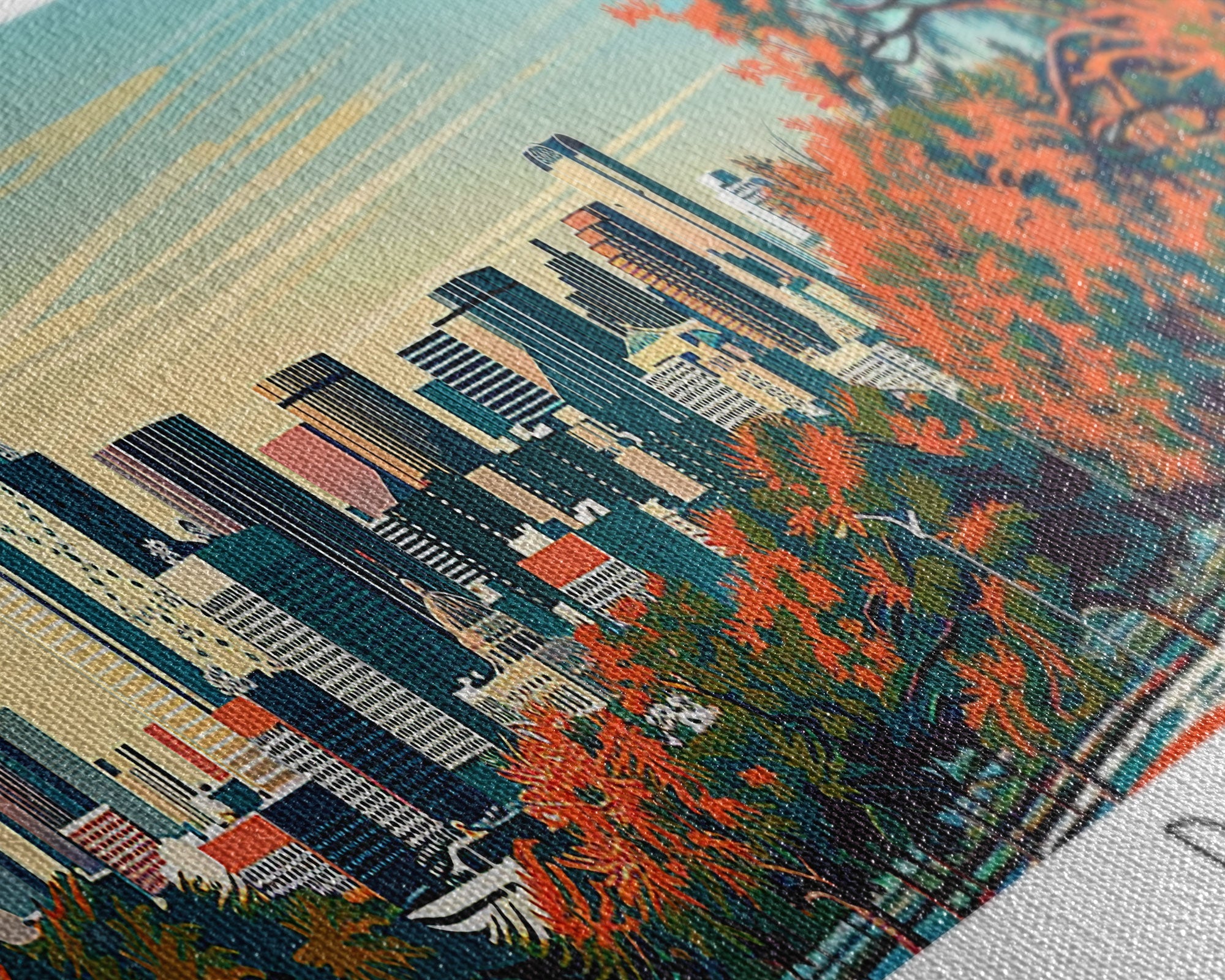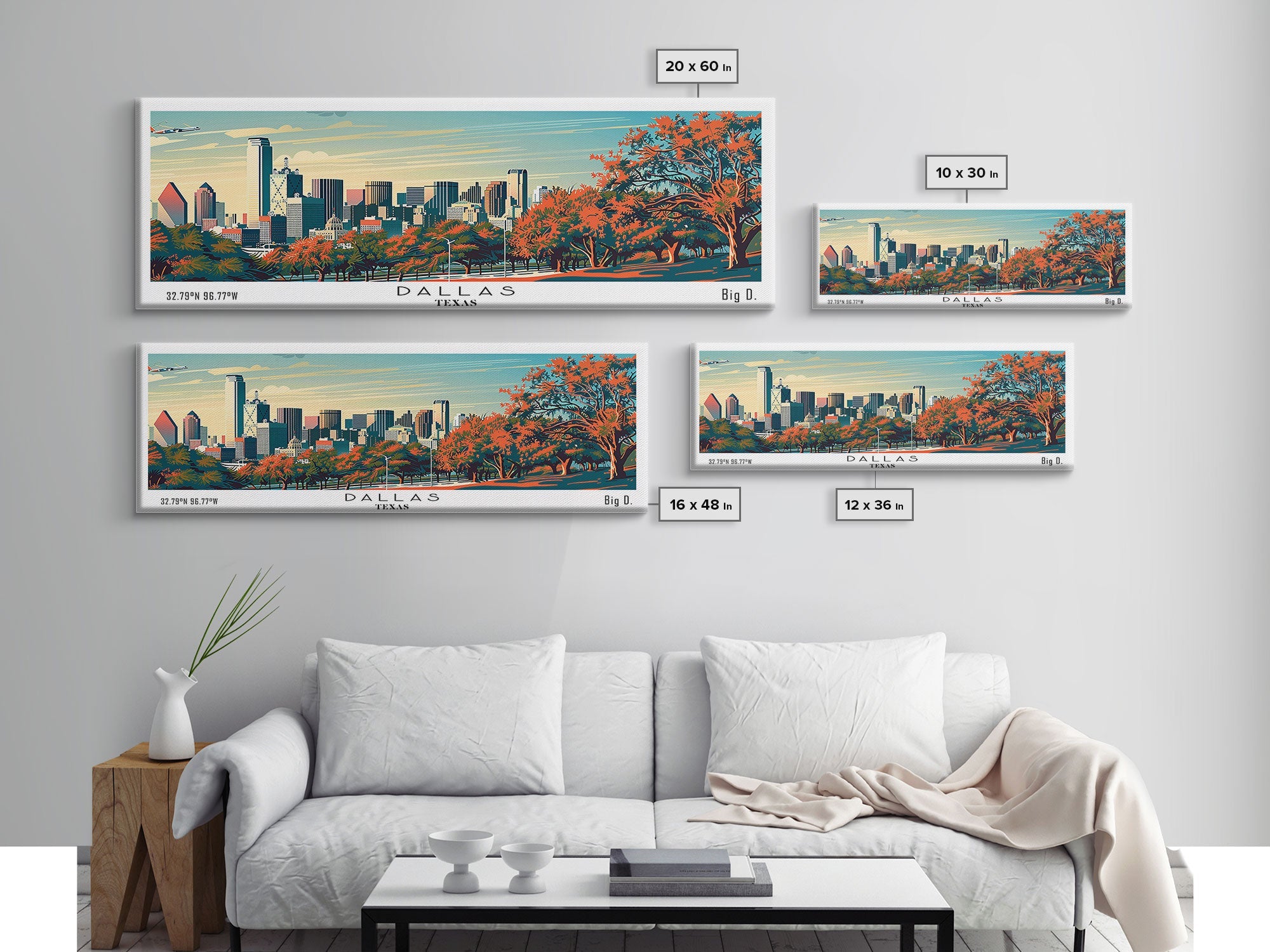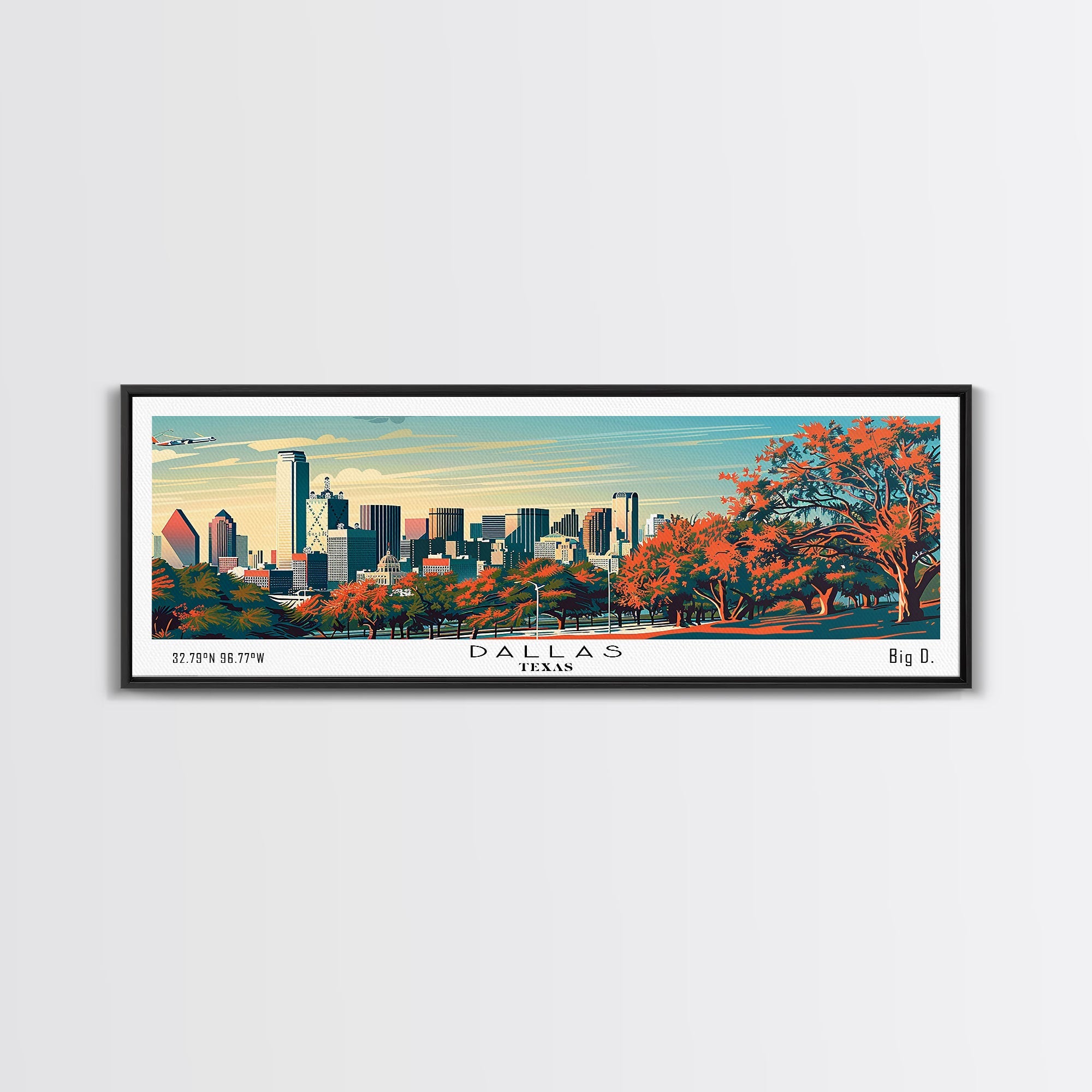Dallas Texas Panoramic Painting, Framed Canvas Print, Mid Century Modern Wall Art, Retro Pop Art Travel Poster, Home Decor, City Art