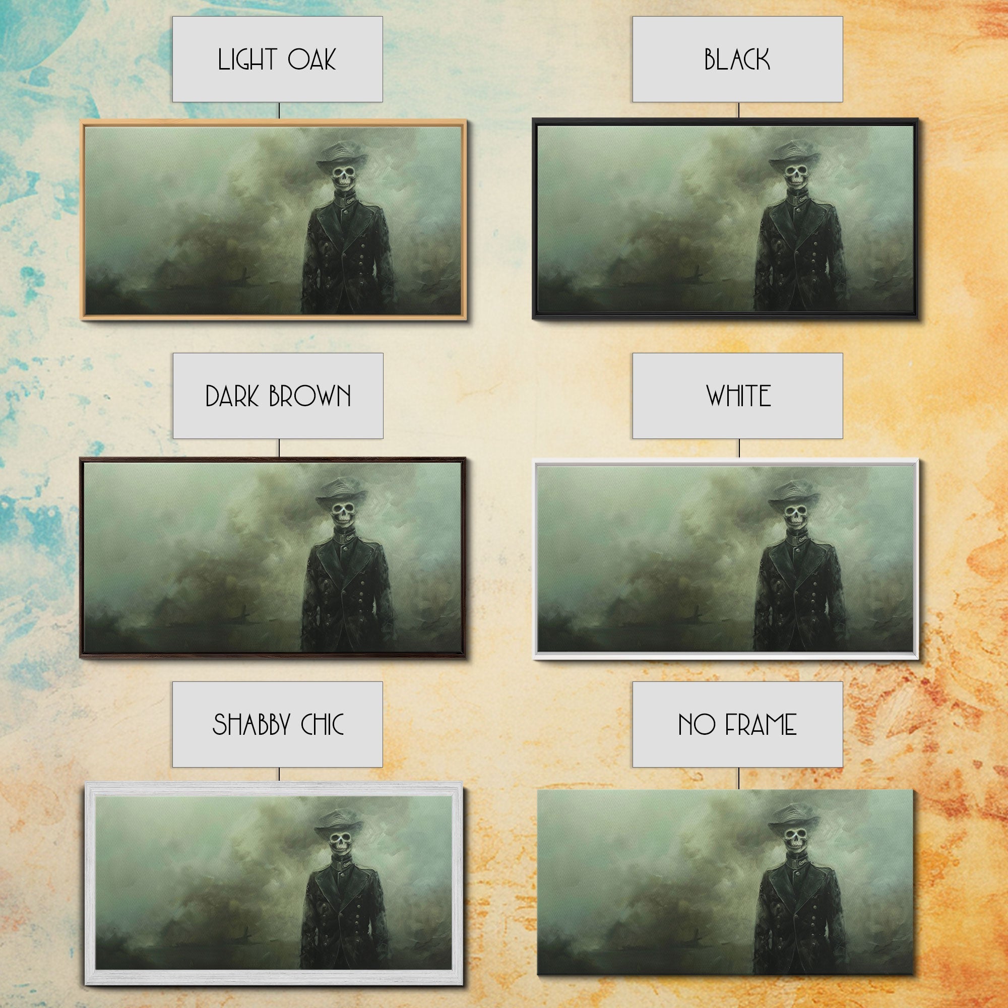 Dapper Skeleton In The Fog, Framed Canvas Print, Halloween Decor, Macabre Dark Academia Wall Art