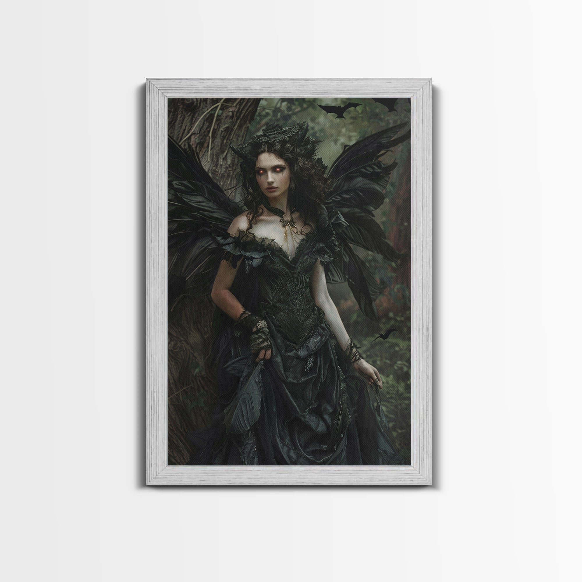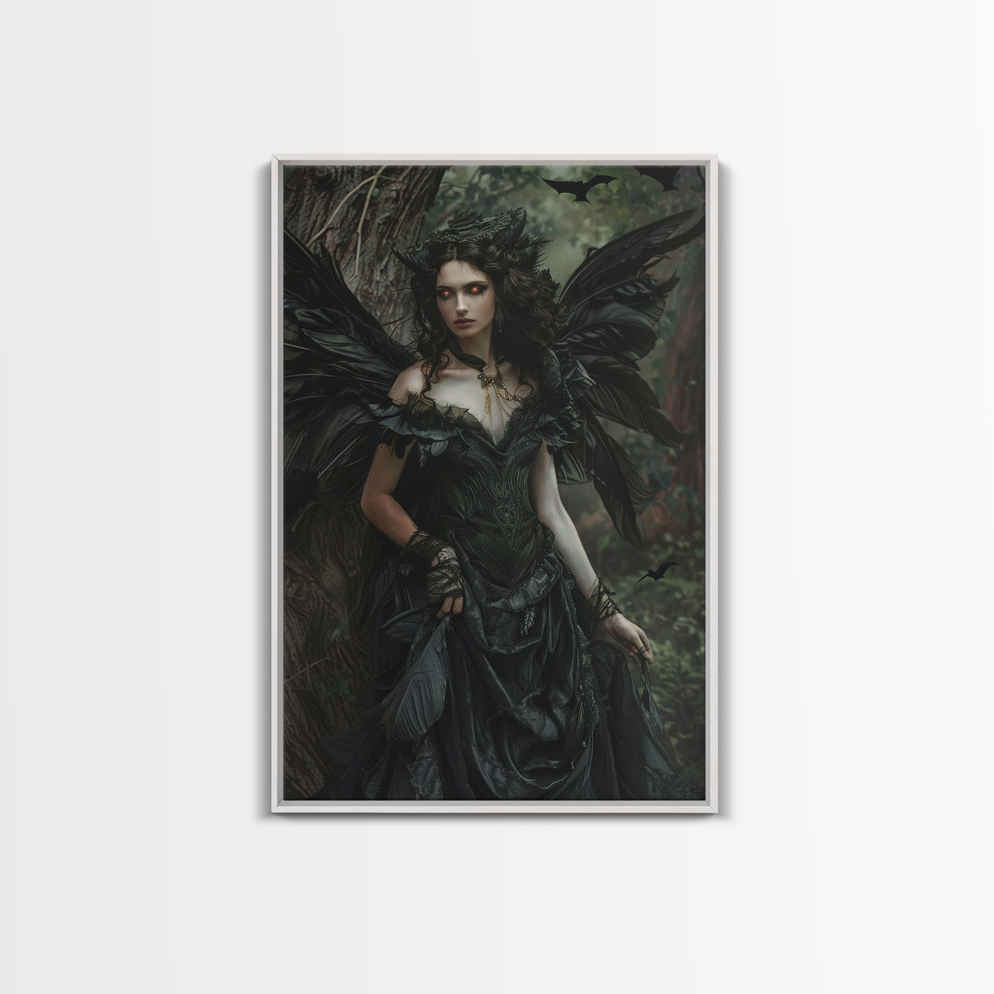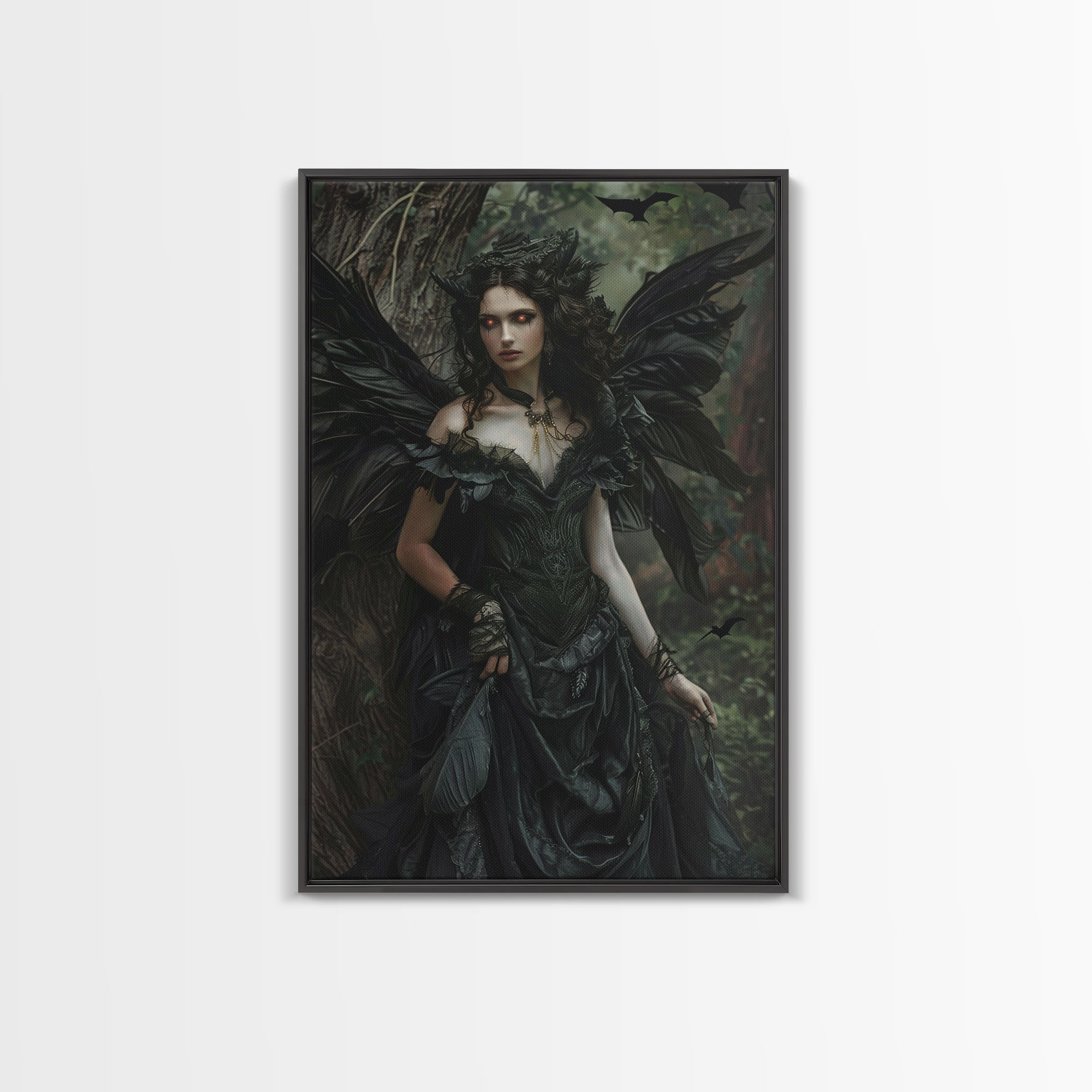 Dark Angel with Glowing Eyes in Haunted Forest - Mysterious Gothic Framed Canvas Print, Halloween Wall Art Decor