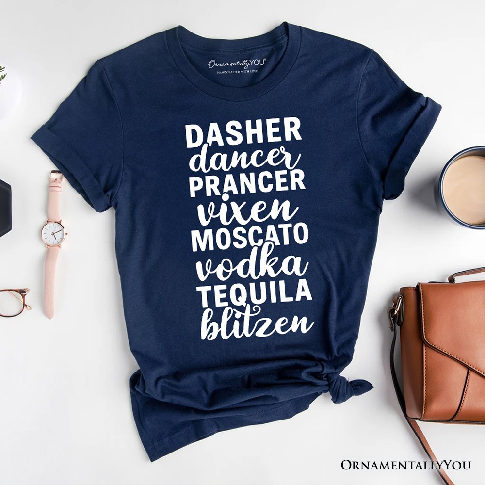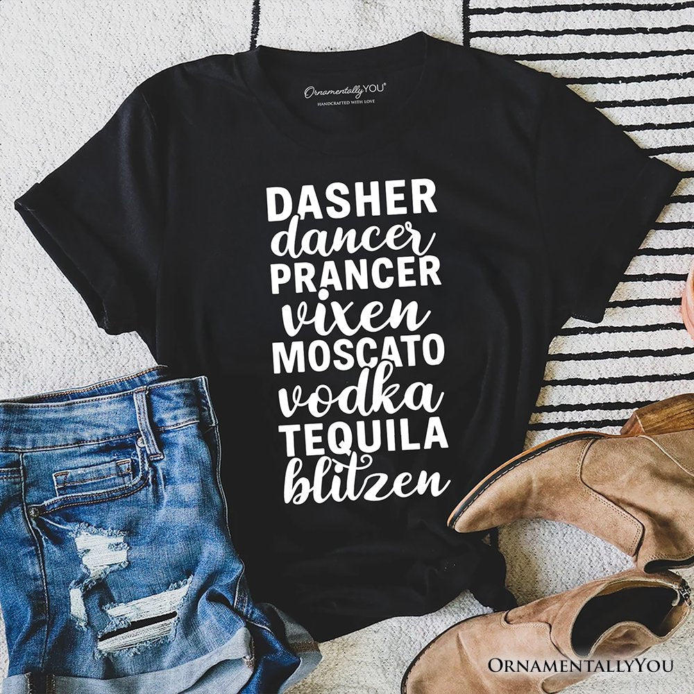 Get into the holiday spirit with this hilarious Christmas drinking shirt that blends festive cheer with your favorite boozy lineup! Perfect for holiday parties, ugly sweater events, or casual December gatherings, this tee adds a fun twist to the classic reindeer roll call—swapping sleigh-pullers for sips like Moscato, Vodka, and Tequila. With bold lettering and a playful design, it’s a great gift for wine lovers, cocktail queens, and merry mischief-makers alike. Whether you’re hosting or just here for the drinks, this comfy cotton tee is the ultimate conversation starter! 🍷🦌🥂