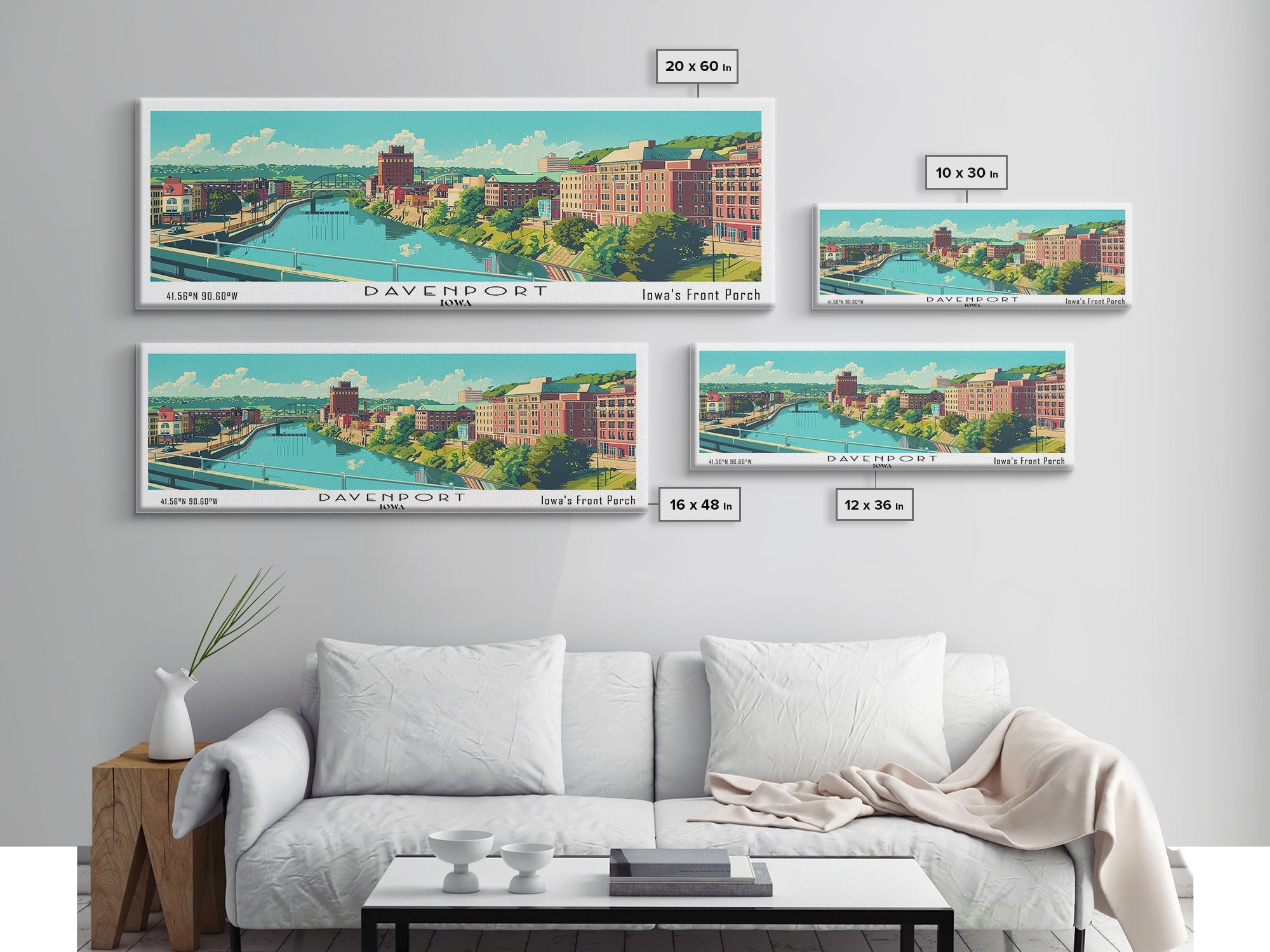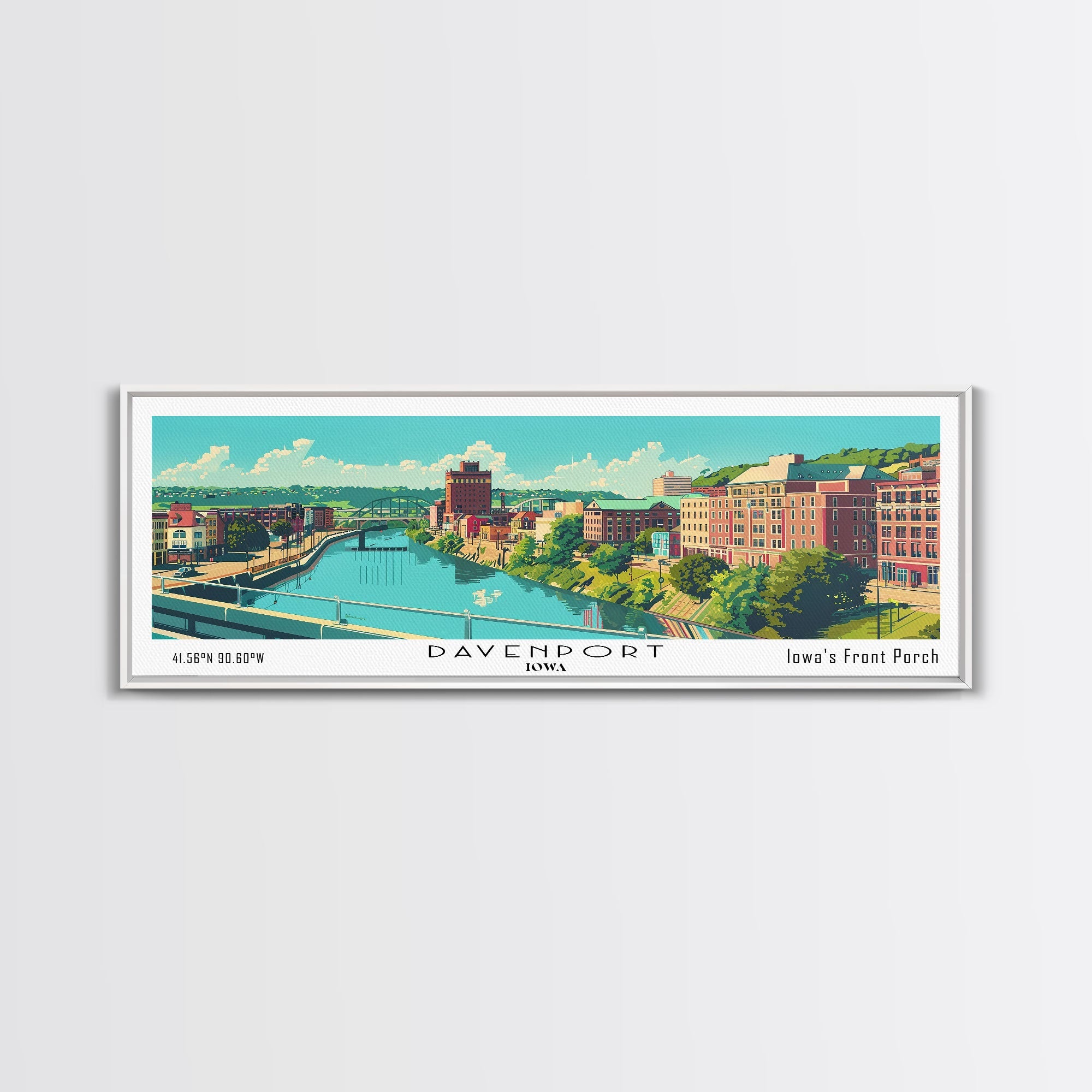 Davenport Iowa Panoramic Wall Art, Mid Century Modern Framed Canvas Print, Retro Pop Art Travel Poster, City Art Gift, Home Decor