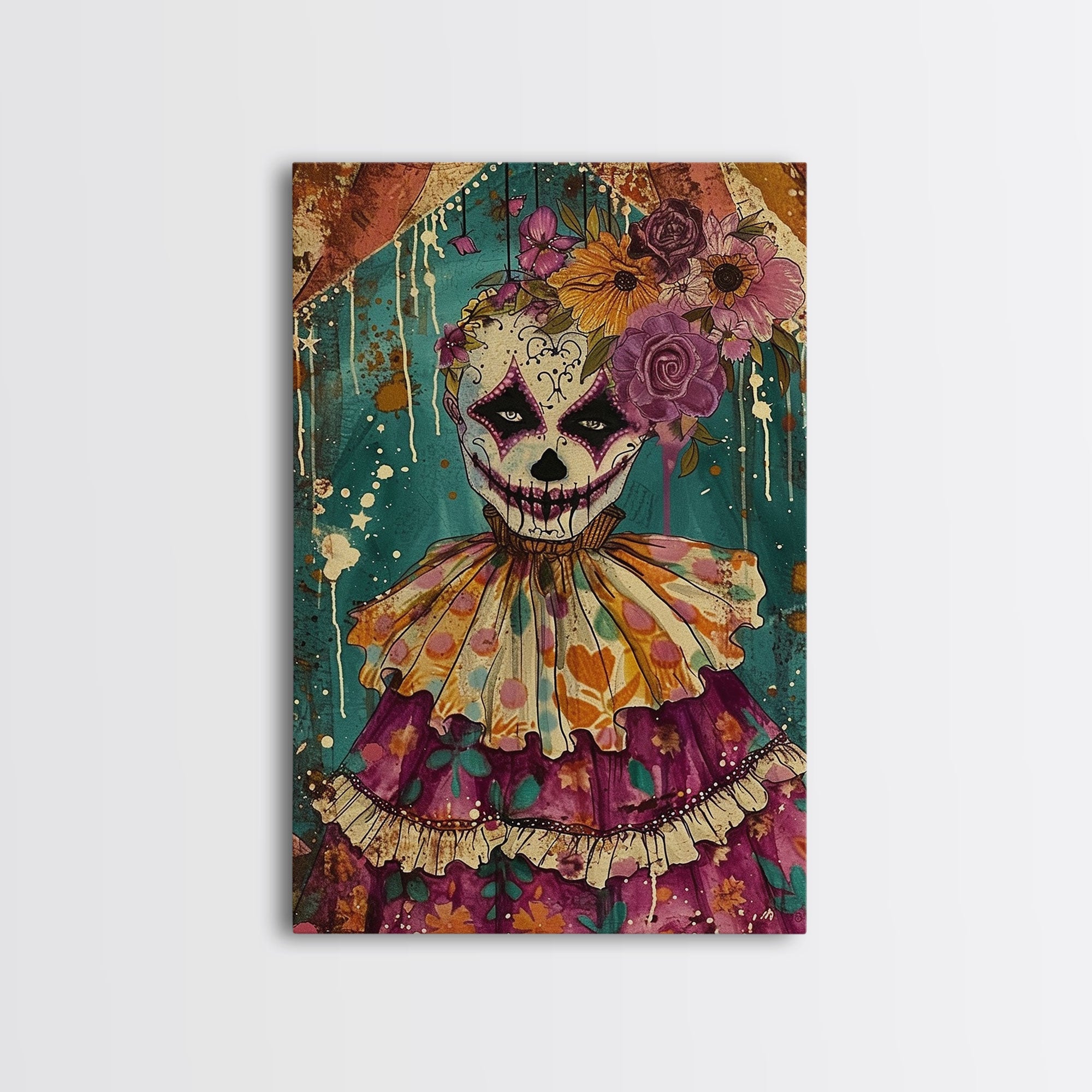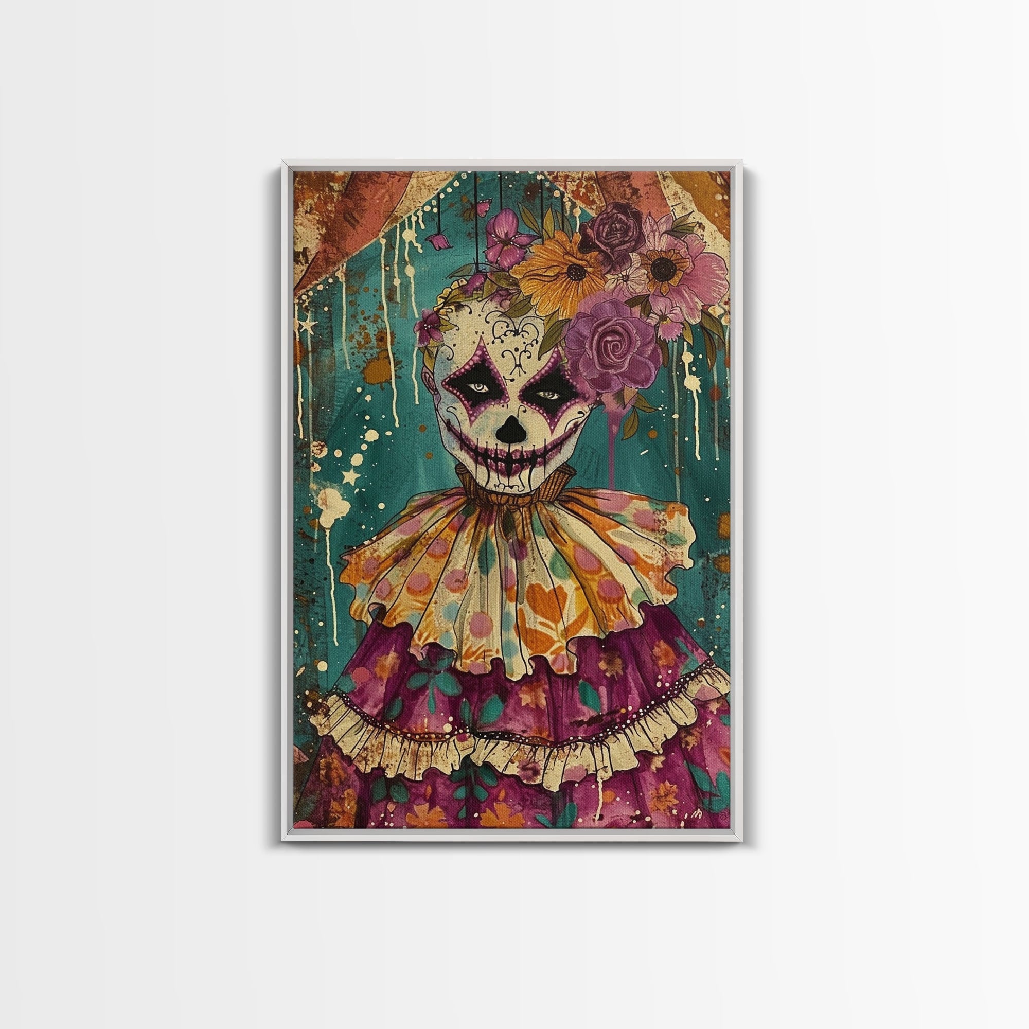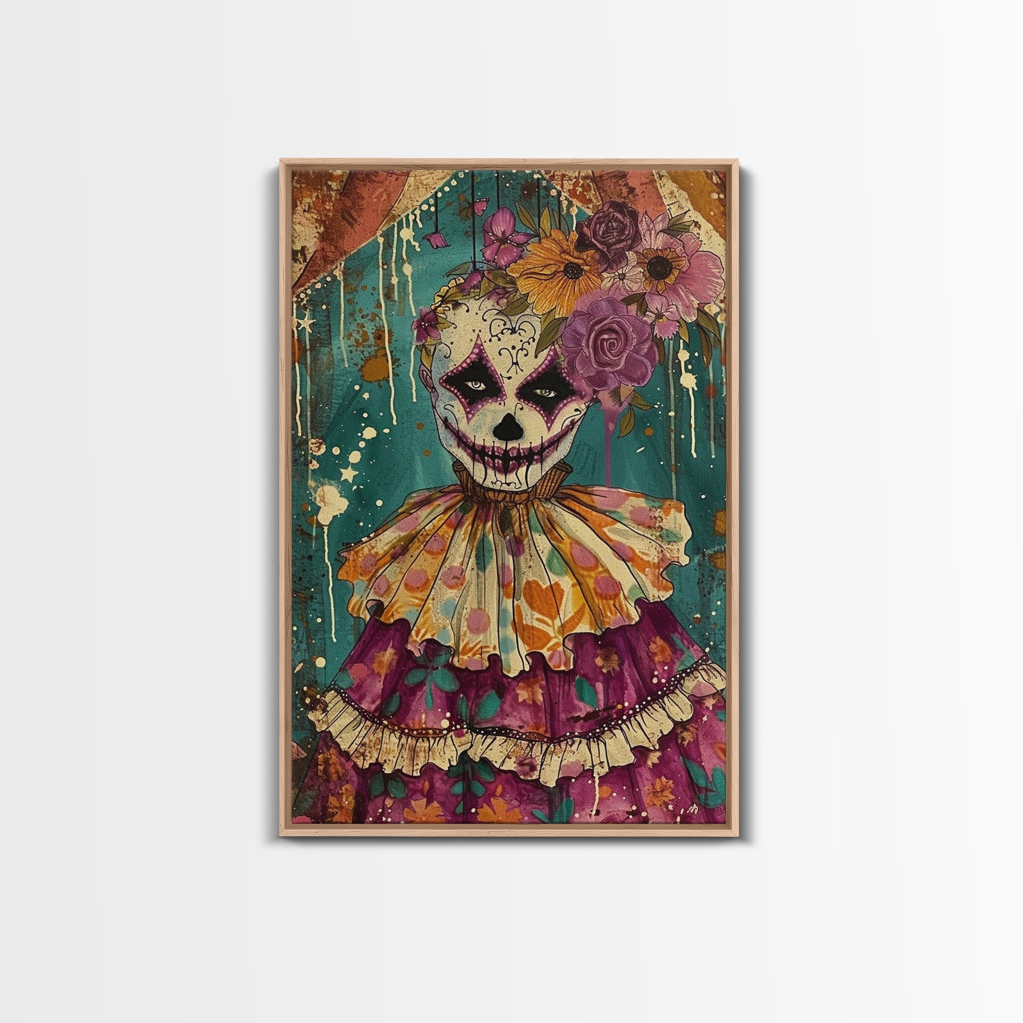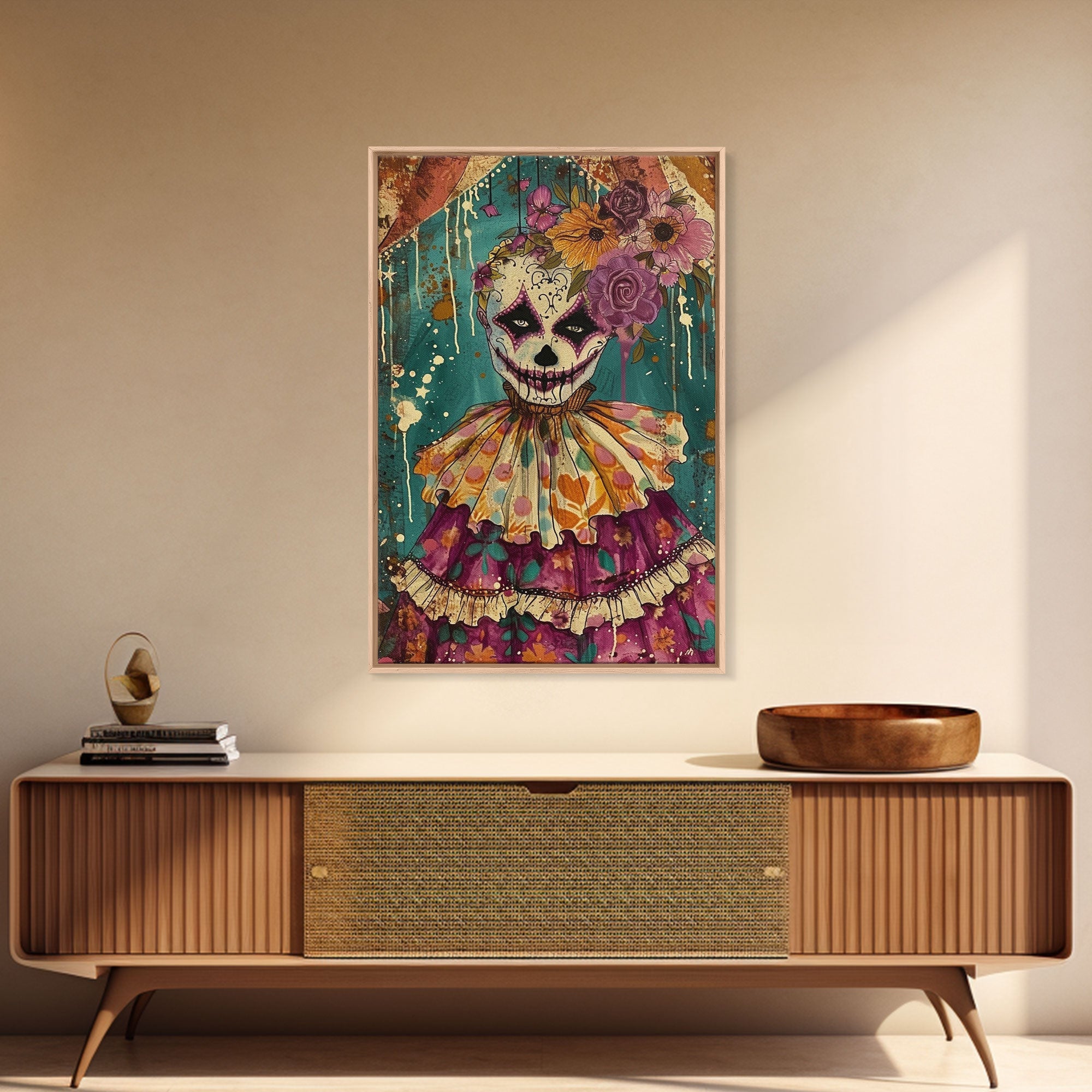 Day of the Dead Doll with Floral Crown Framed Canvas Print, Halloween Art, Creepy Wall Art, Spooky Home Decor, Scary Art, Unique Wall Decor
