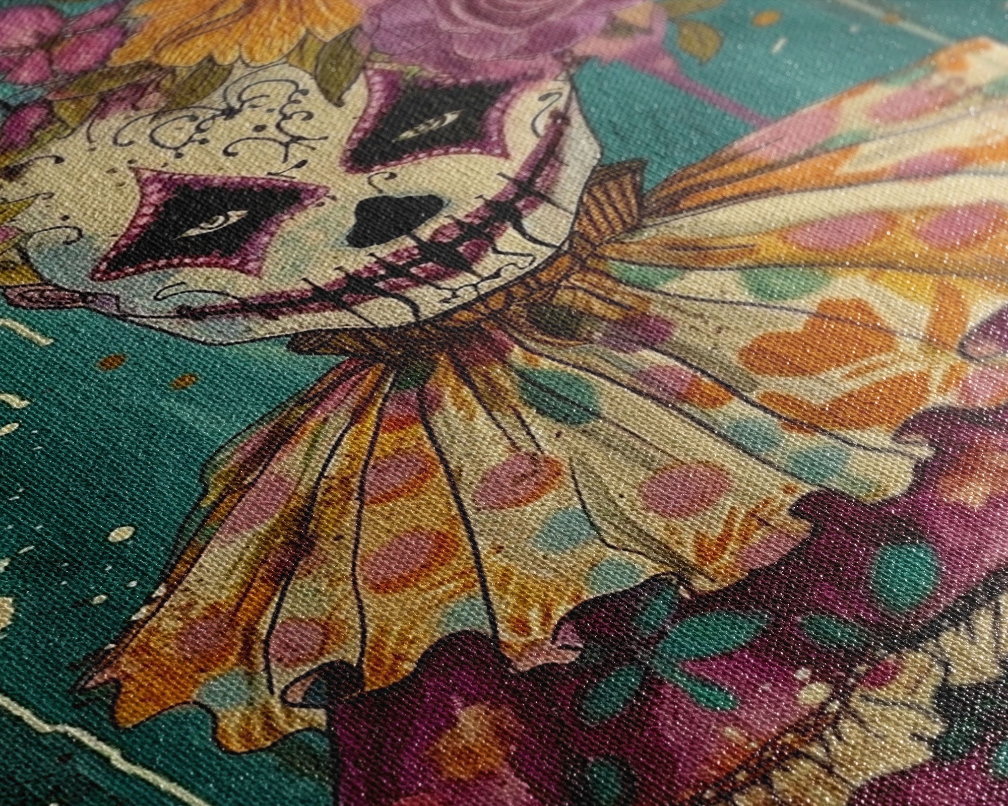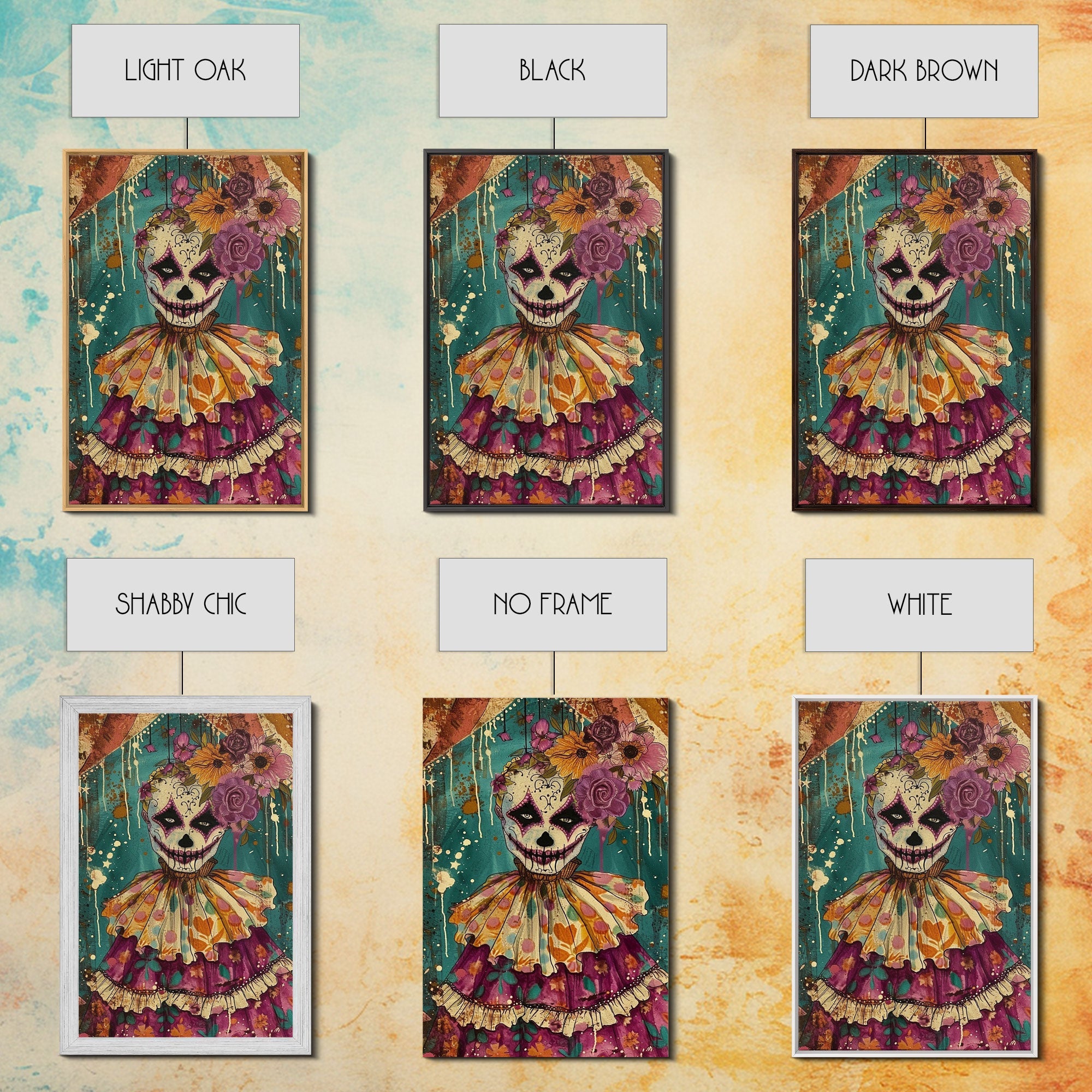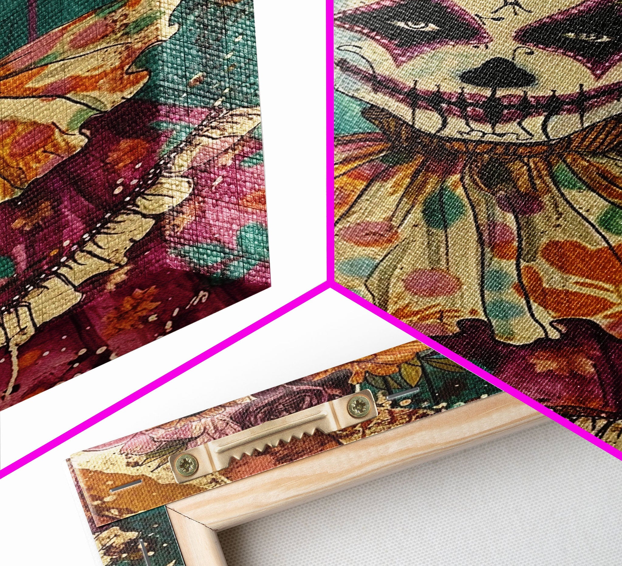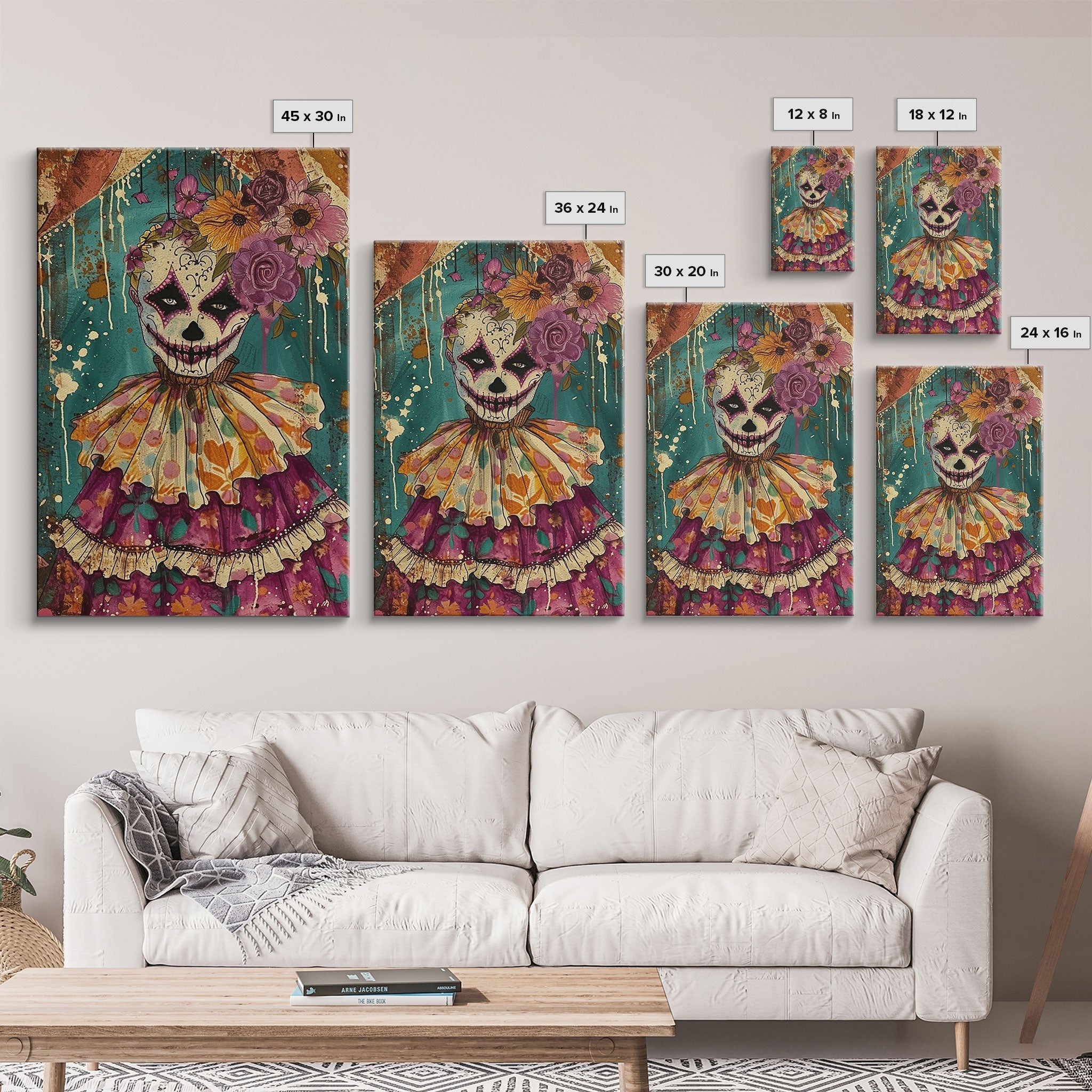 Day of the Dead Doll with Floral Crown Framed Canvas Print, Halloween Art, Creepy Wall Art, Spooky Home Decor, Scary Art, Unique Wall Decor