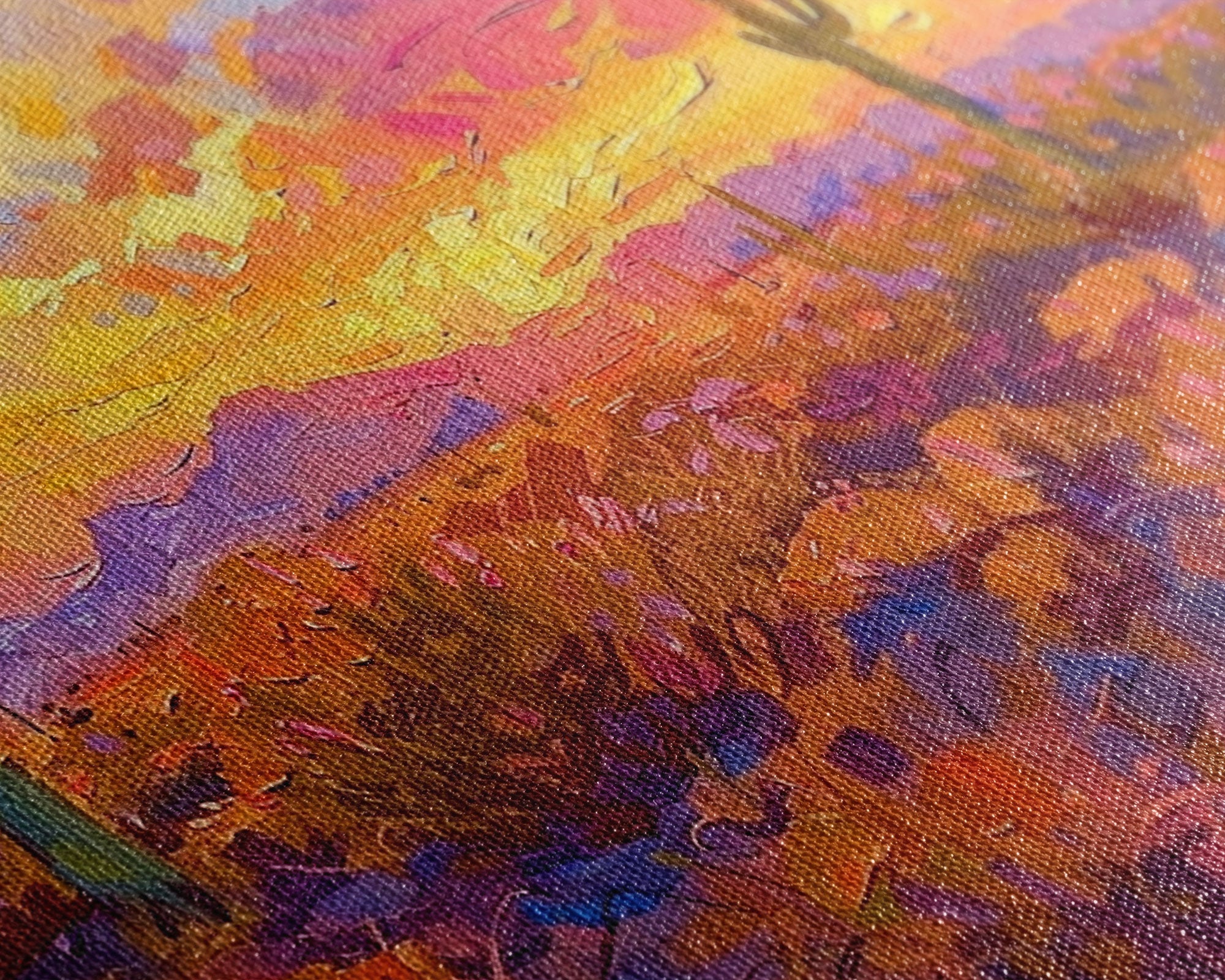 Most of our canvases are made in the USA, with the exception of canvases ordered with the light oak unstained frames, and any large canvases (24x48, 30x60, 16x48 and 20x60) ordered WITH a frame. These are temporarily made in and shipped from Europe, while we try to find a more consistent supplier in the USA.