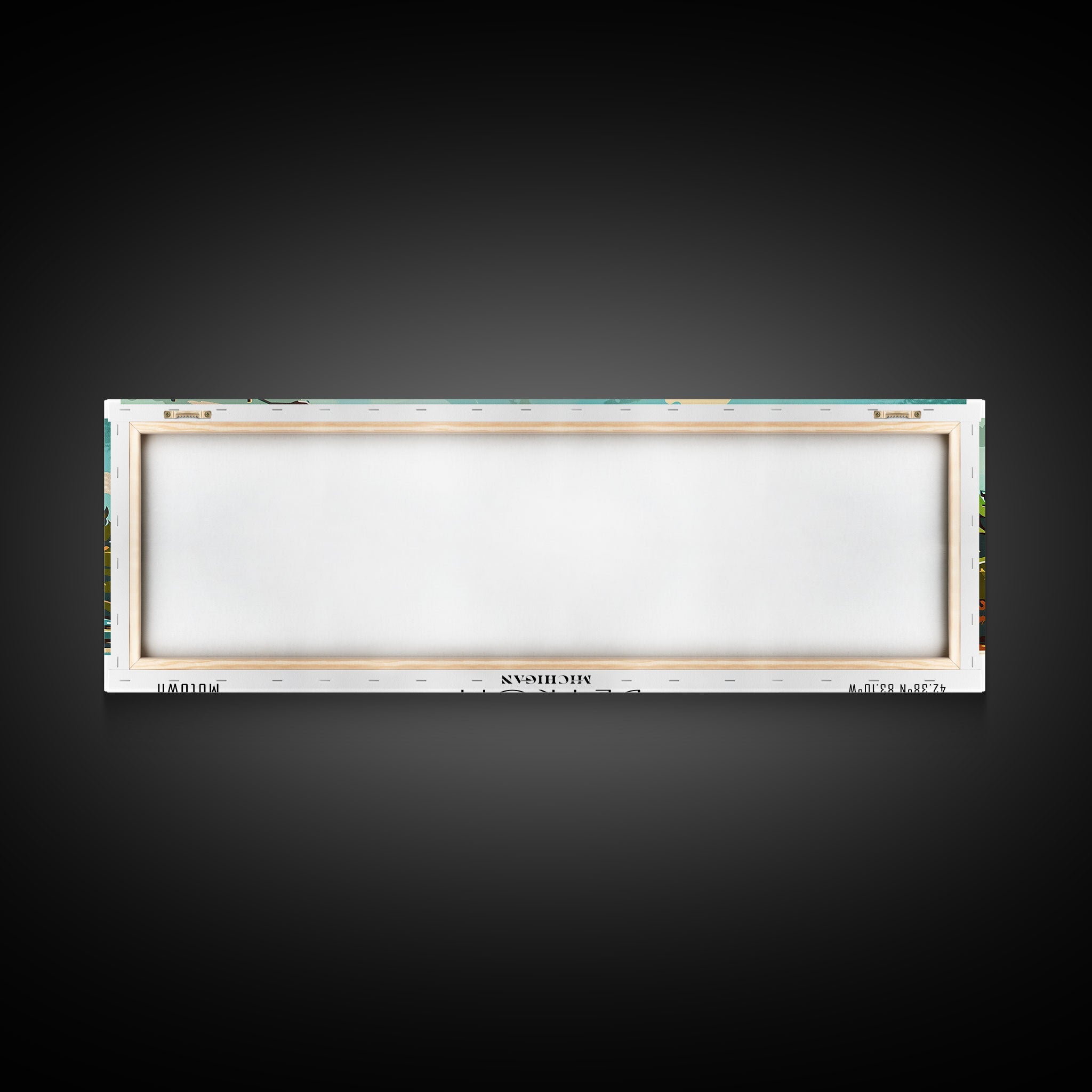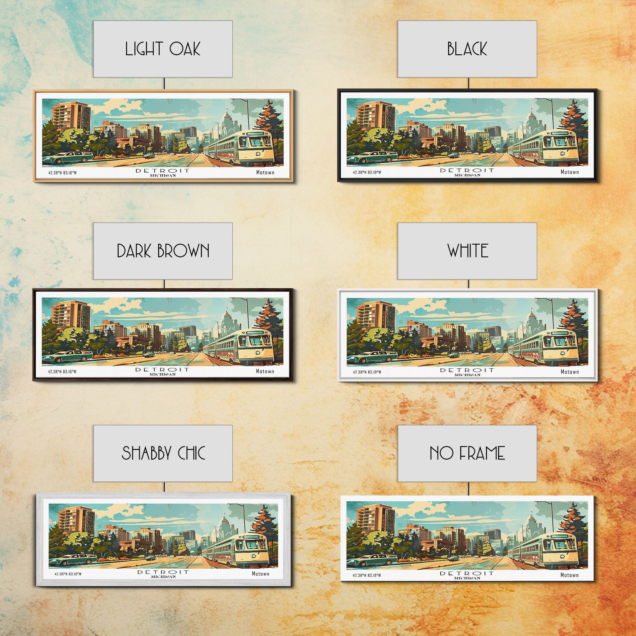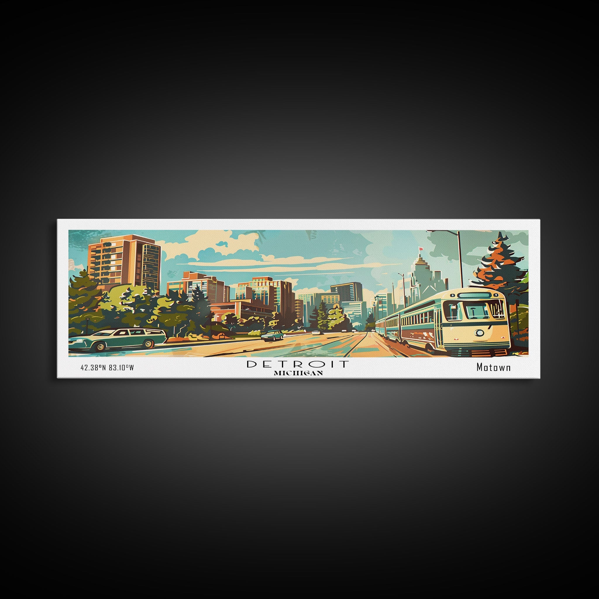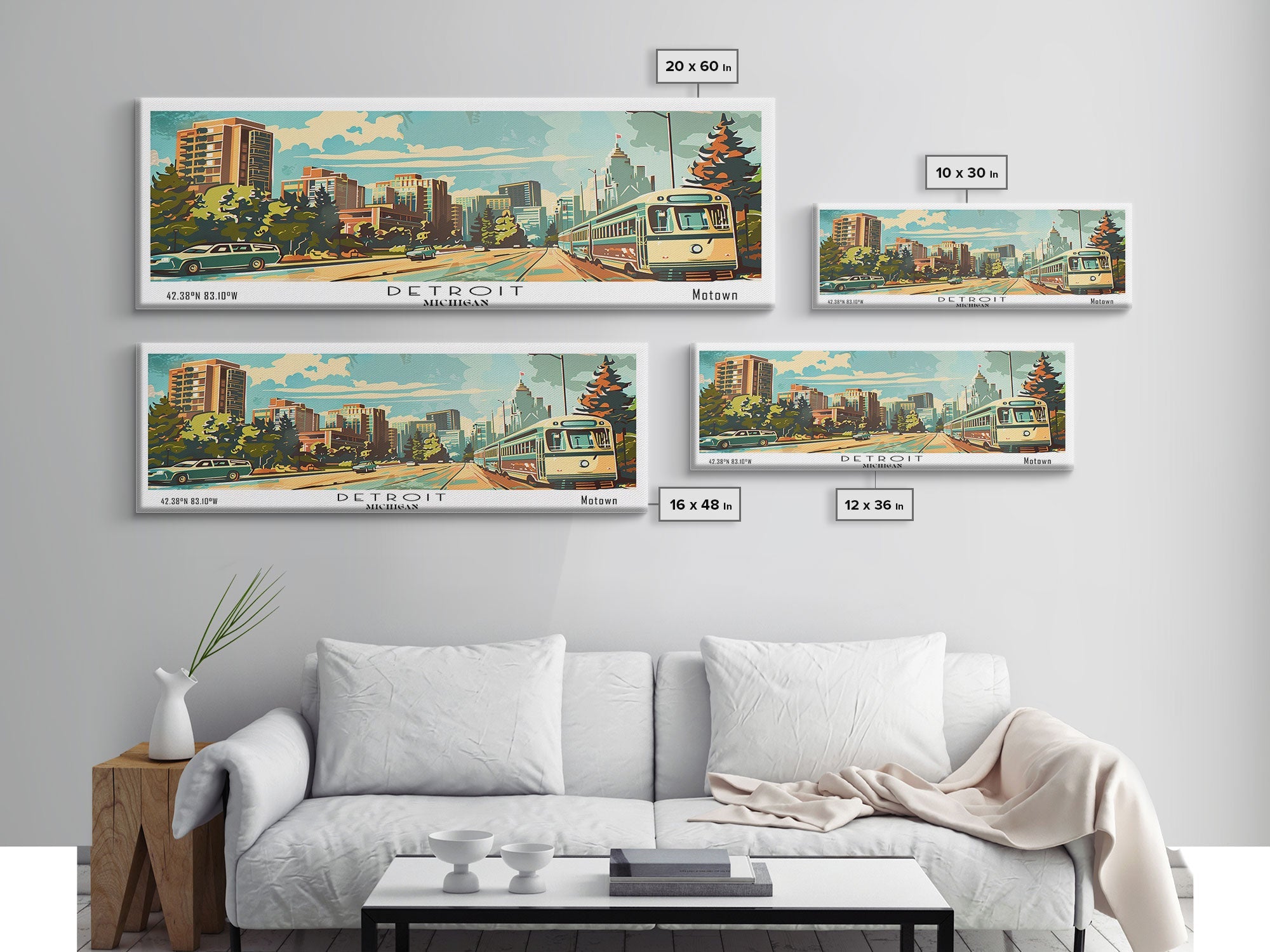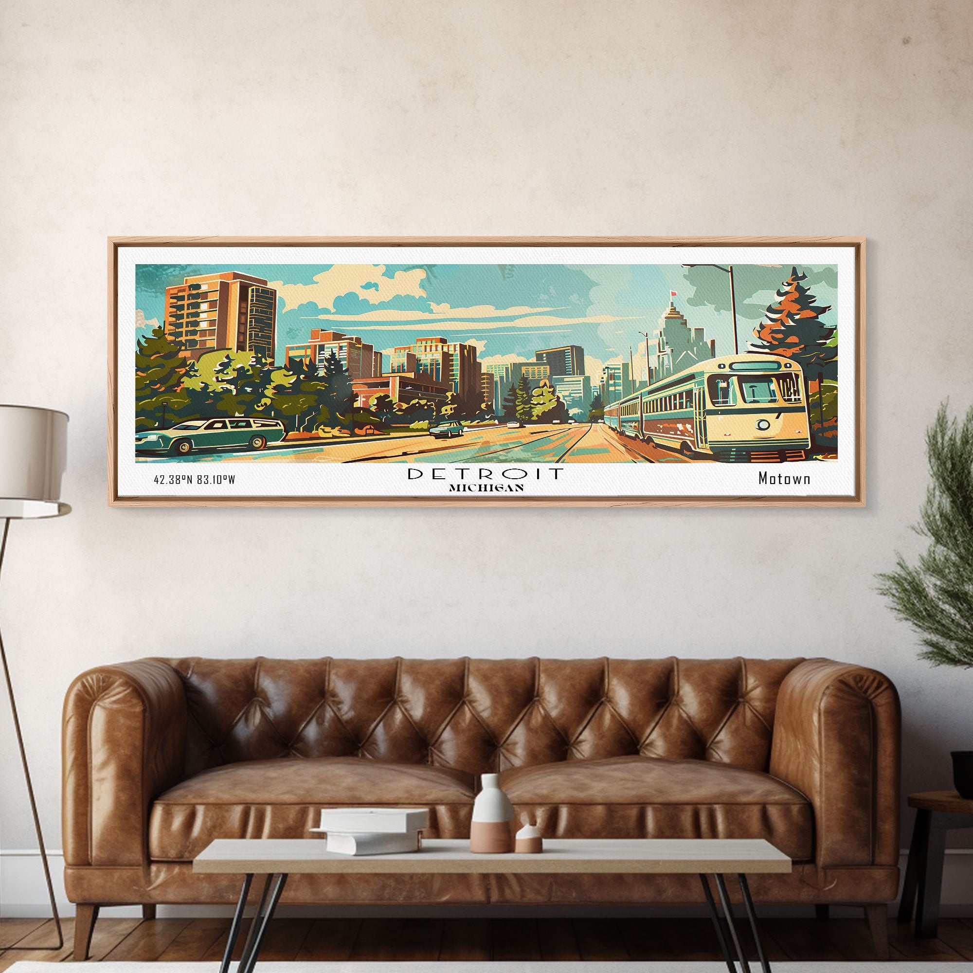 Detroit Michigan Panoramic Wall Art, Mid Century Modern Framed Canvas Print, Retro Pop Art Travel Poster, Office Art, Living Room Decor