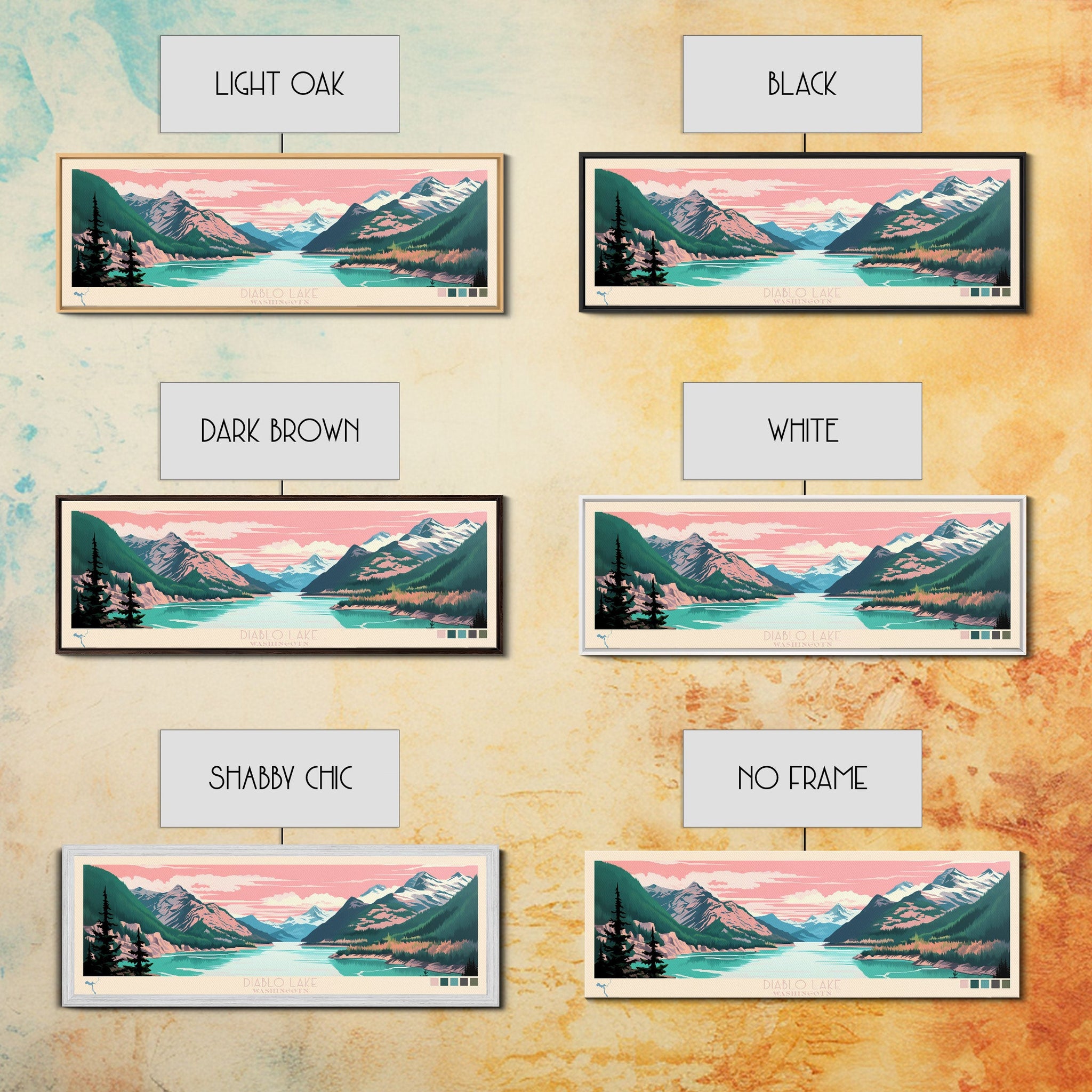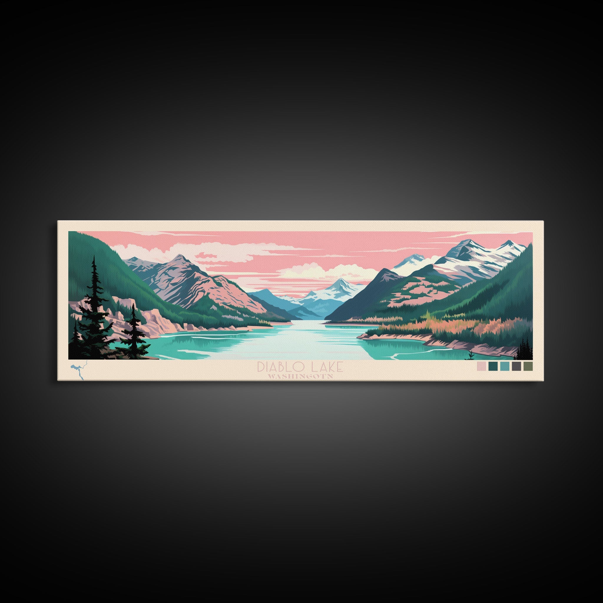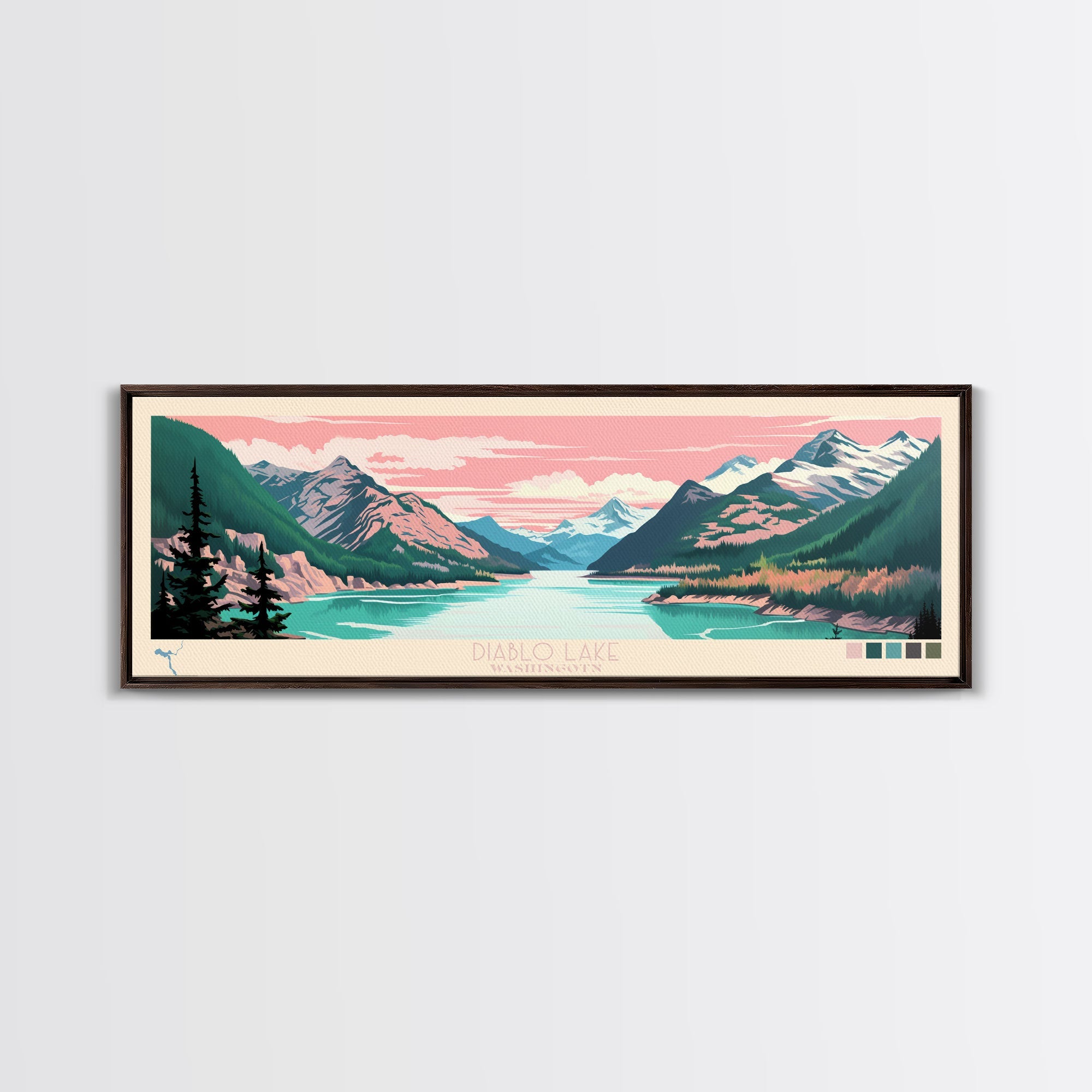 Diablo Lake Washington Framed Canvas Print, Midcentury Modern Panoramic Wall Art, Bedroom Decor, Pop Art, Travel Poster Art, Scenic Nature Painting