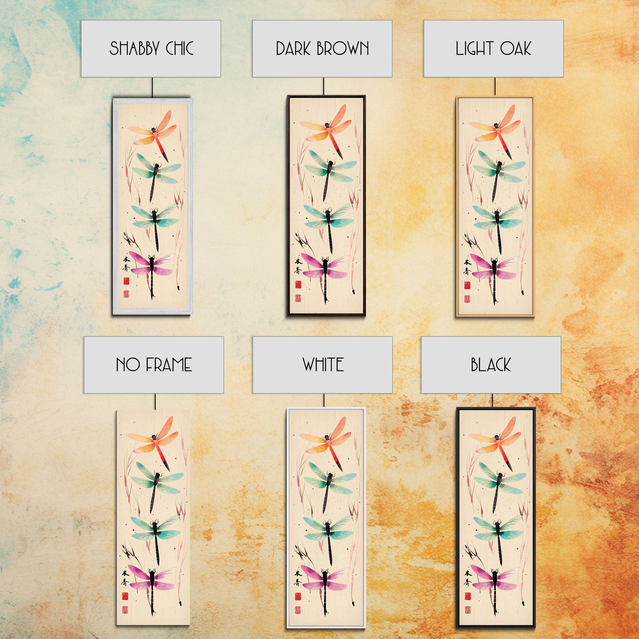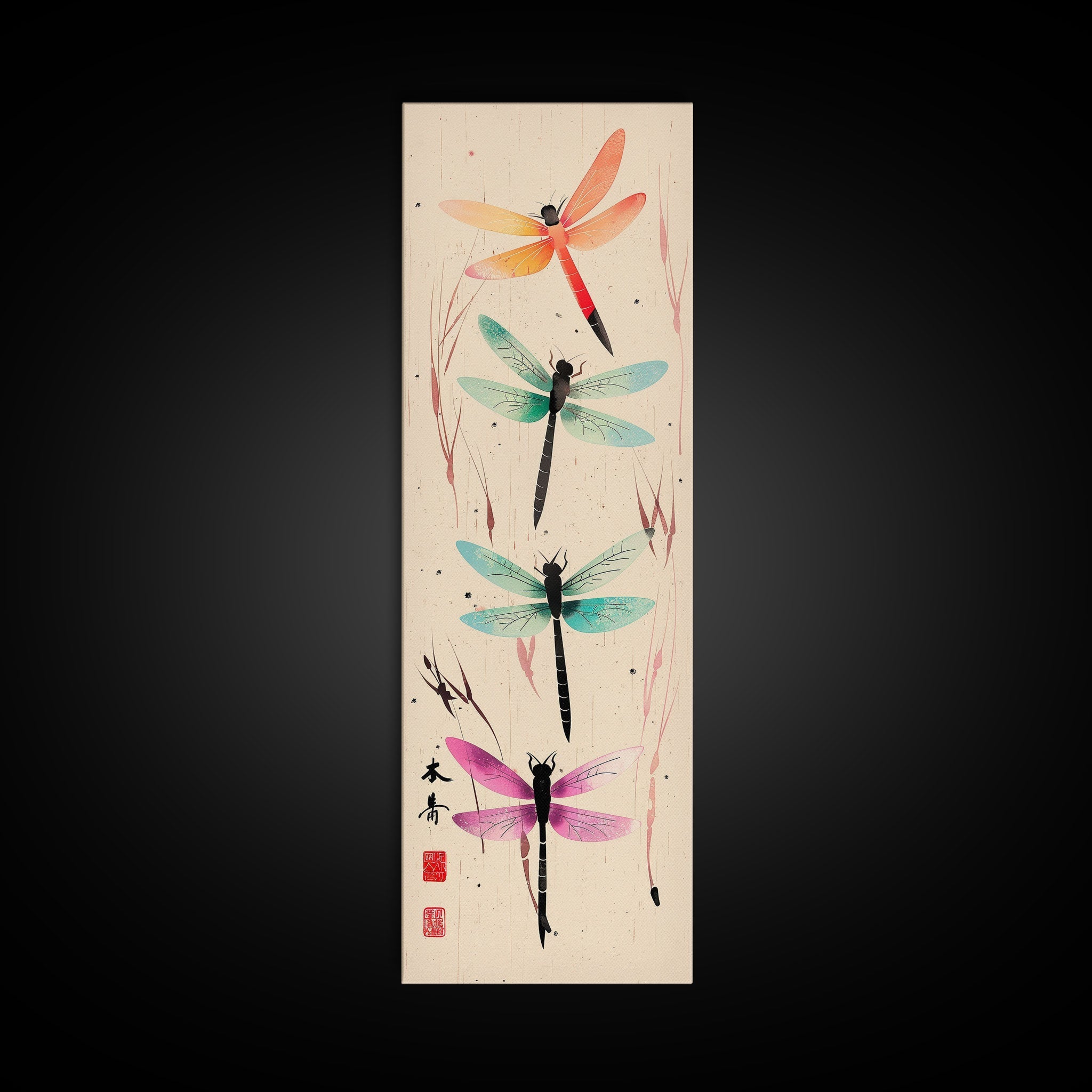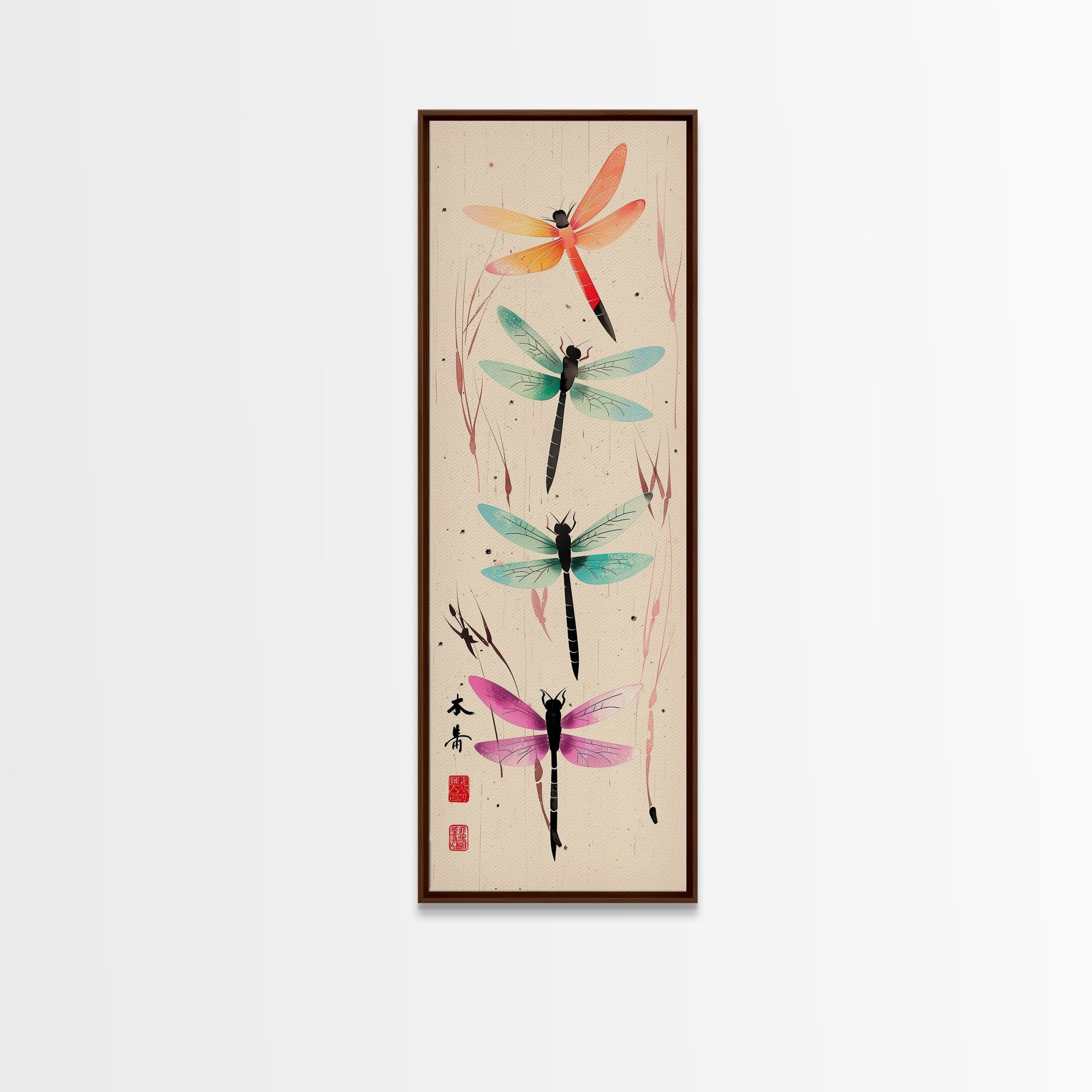 Dragonflies In Flight With Delicate Details Japanese Style Framed Canvas Print, Wall Art Ready To Hang For Nature Lovers