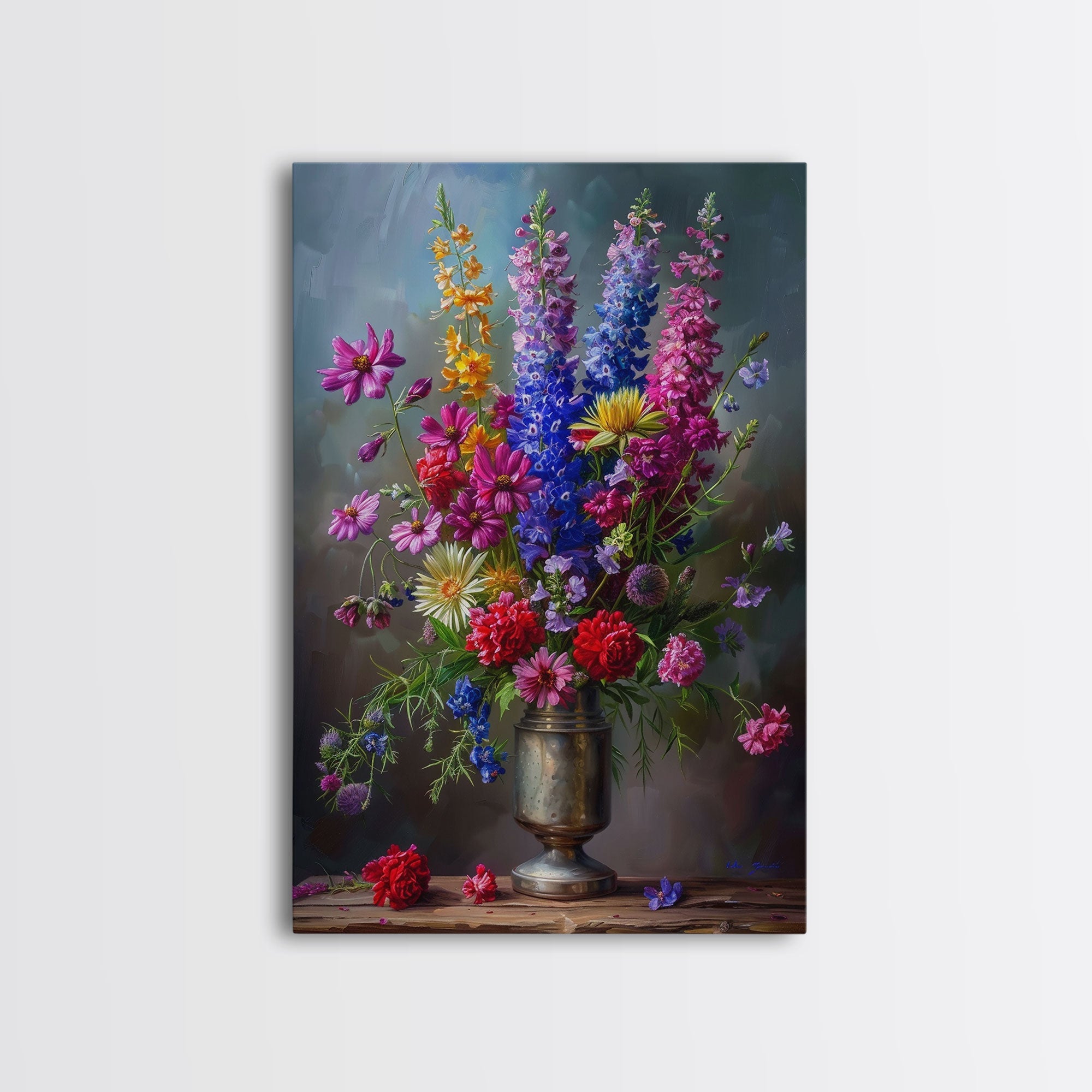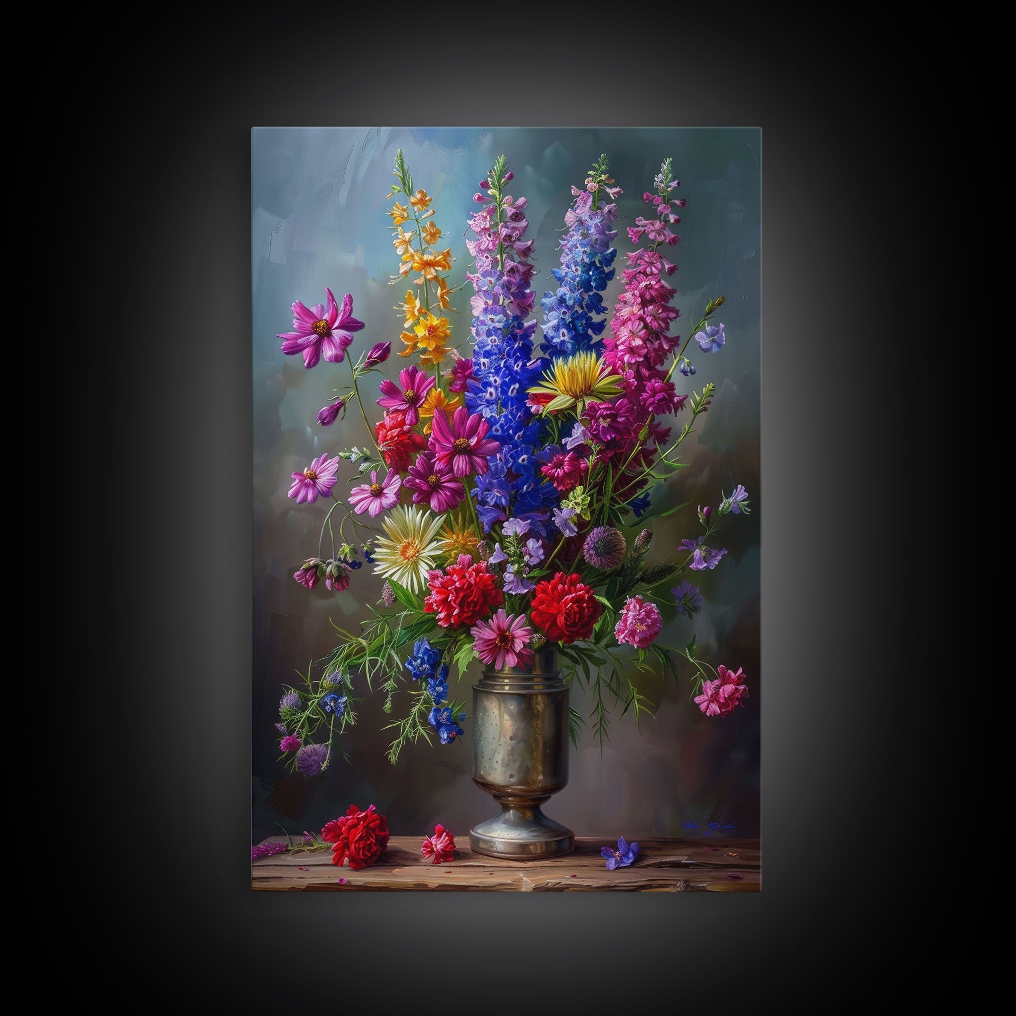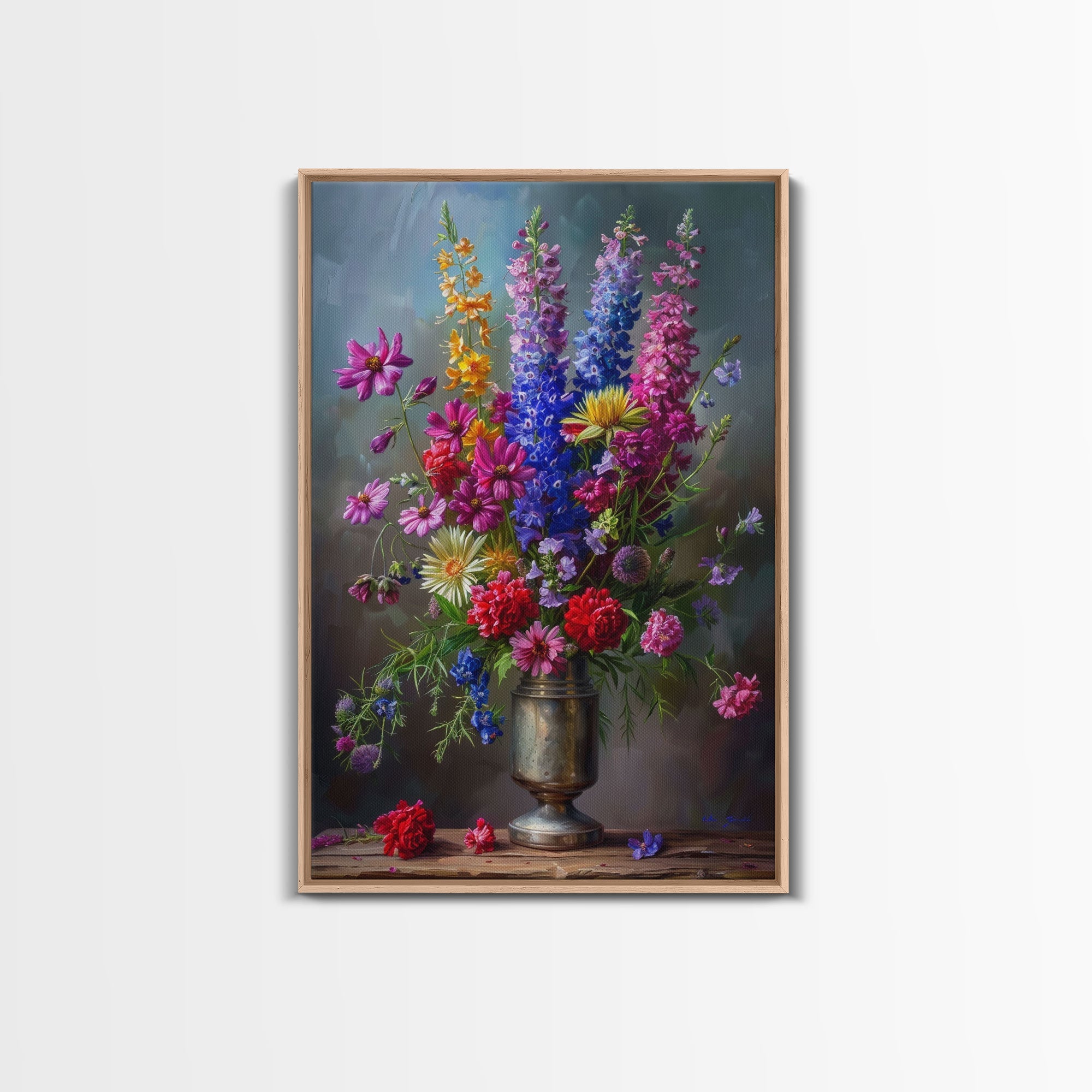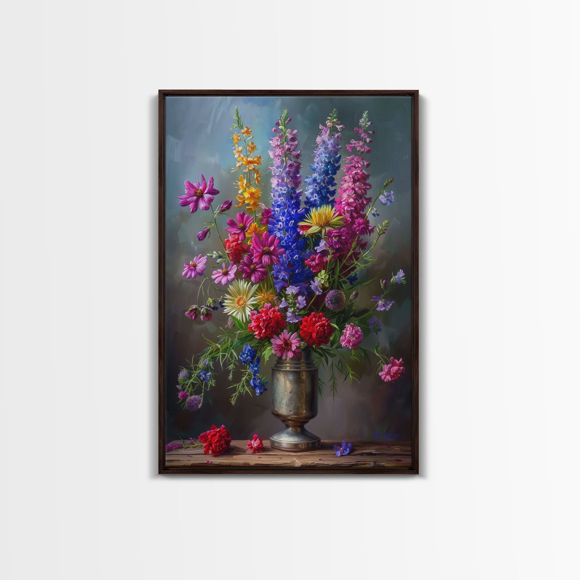 Dramatic Floral Vase Art on Rich Background - Framed Canvas Print, Bold Flower Decor for Living Room, Botanical Artwork, Floral Wall Art