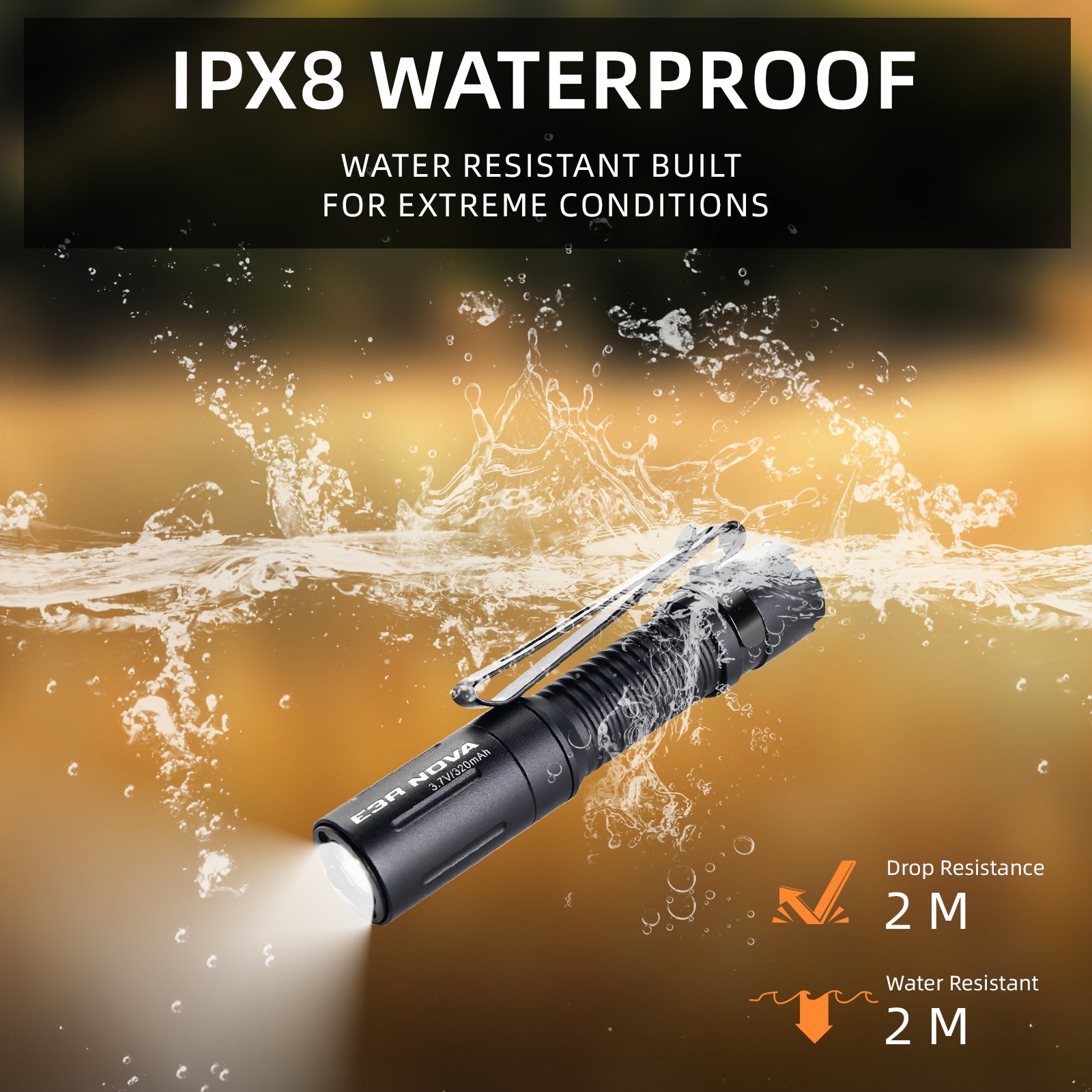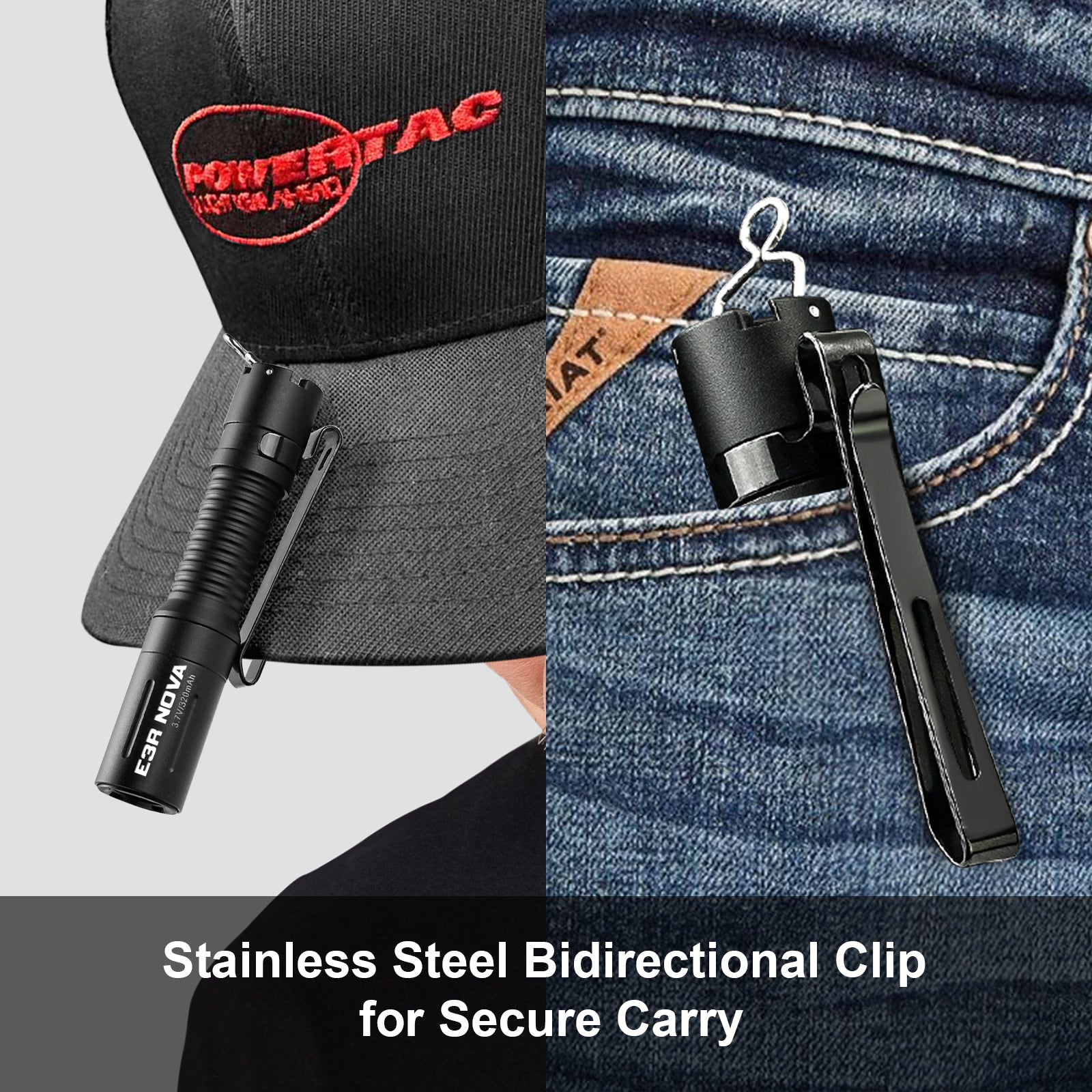 Built for enthusiasts, security professionals, and outdoorsmen alike, the Powertac E3R Nova is extremely easy to operate with all features accessible via a dedicated tail switch  Even with a sub-compact frame measuring in just under 3.25", the E3R Nova is has all the design features one would expect from a Powertac light. The E3R Nova is machined from aero-grade aluminum alloy with a military grade hard-anodized finish, making it very lightweight, durable, and able to withstand any weather conditions. Being IPX-8 rated waterproof, the E3R Nova is the best sub-compact option for both EDC and tactical utility, and it comes with a removable bidirectional clip for hands-free transport and a handy attachment ring to clip on to anything.