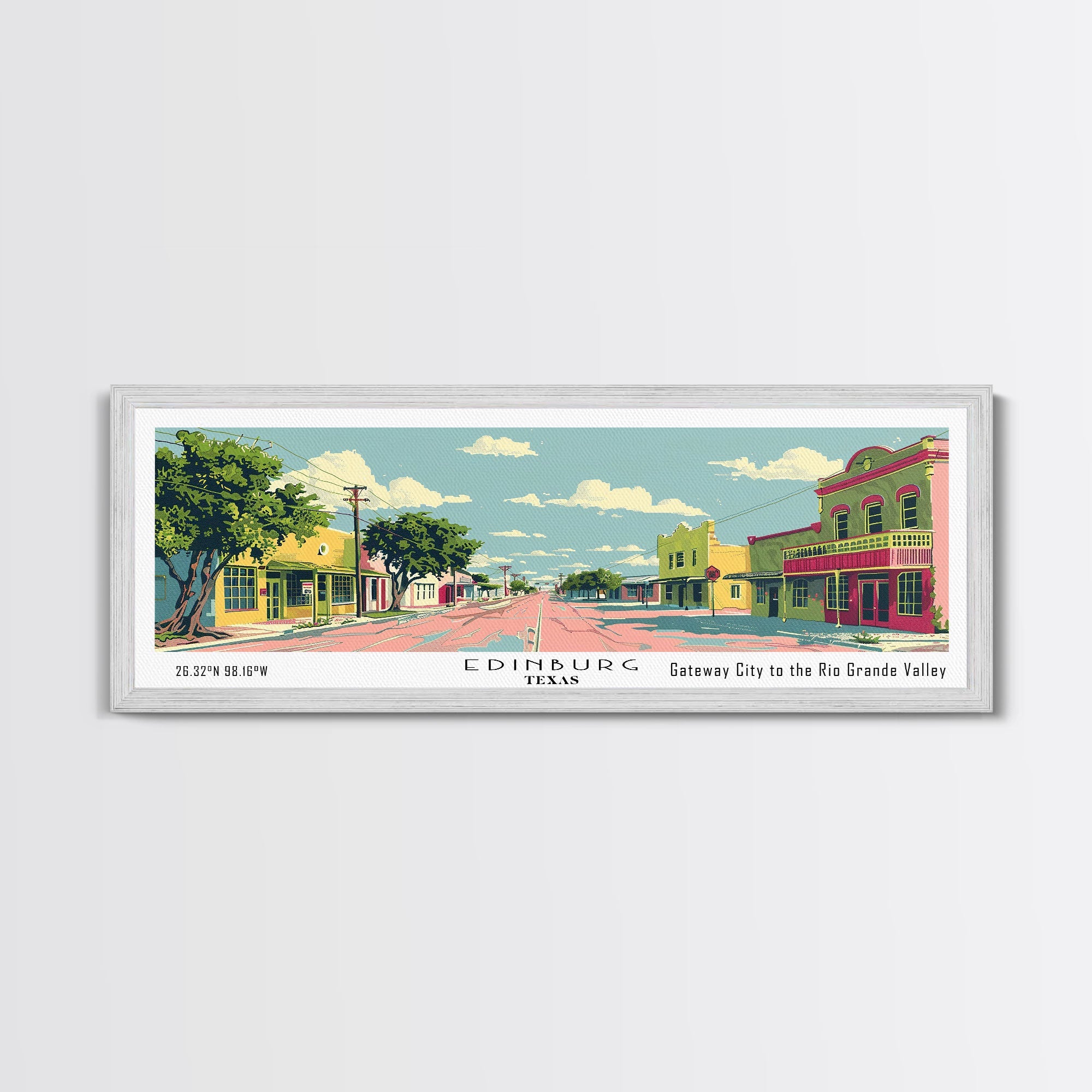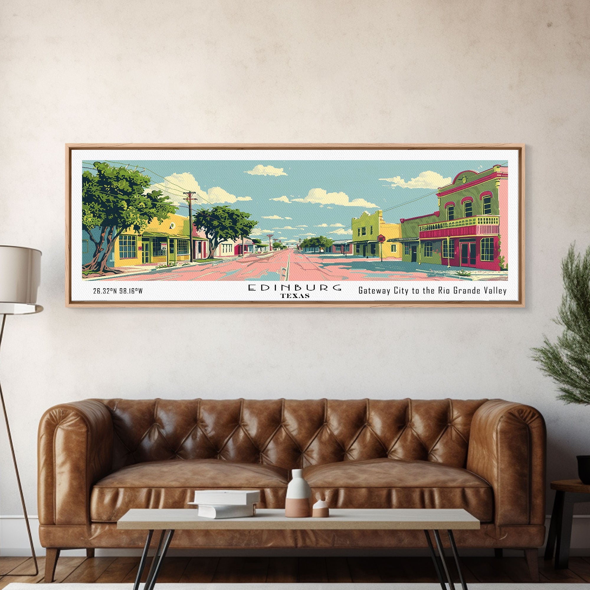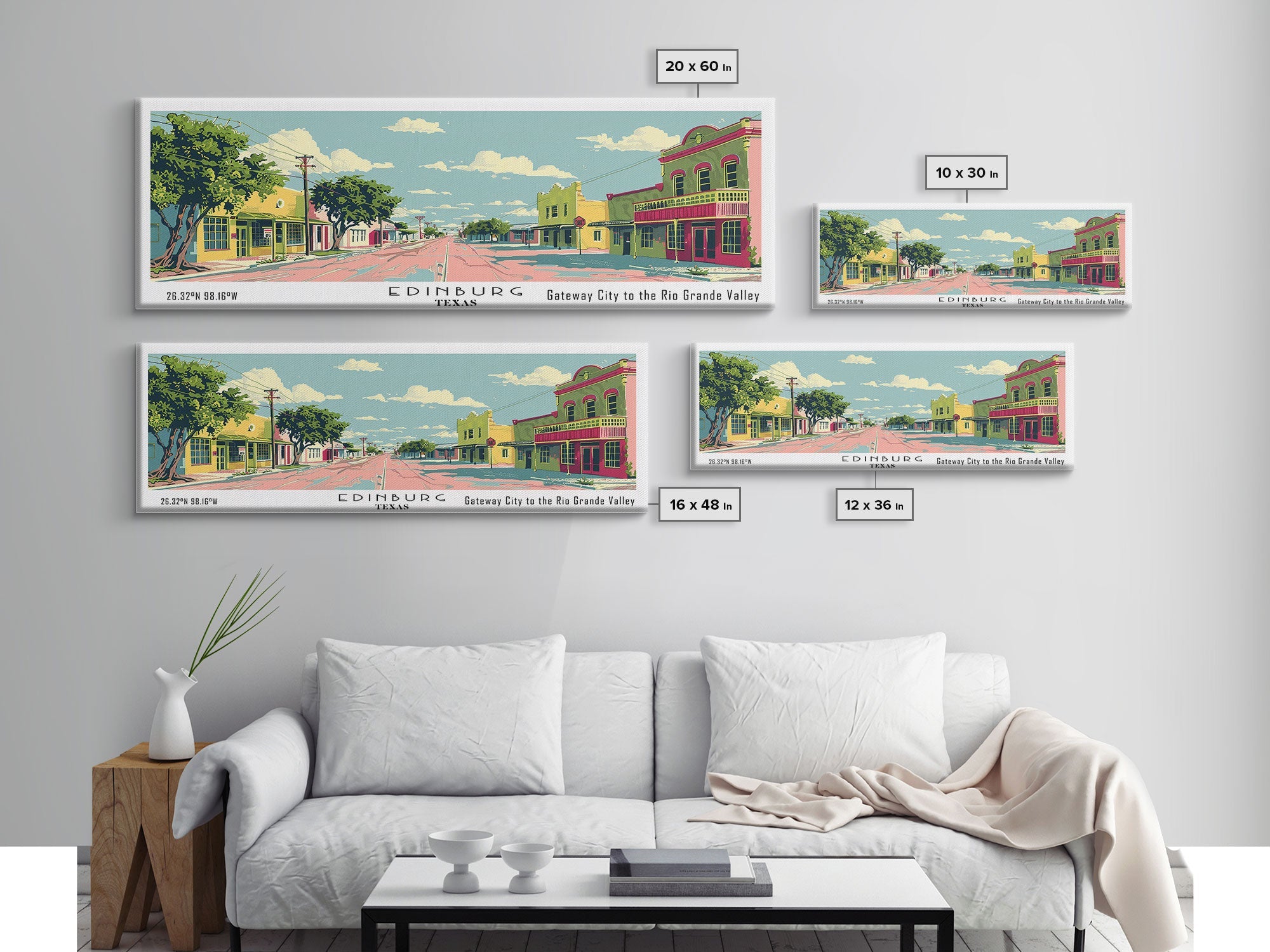 Edinburg Texas Panoramic Wall Art, Mid Century Modern Framed Canvas Print, Retro Pop Art Travel Poster, City Office Art, Living Room Decor