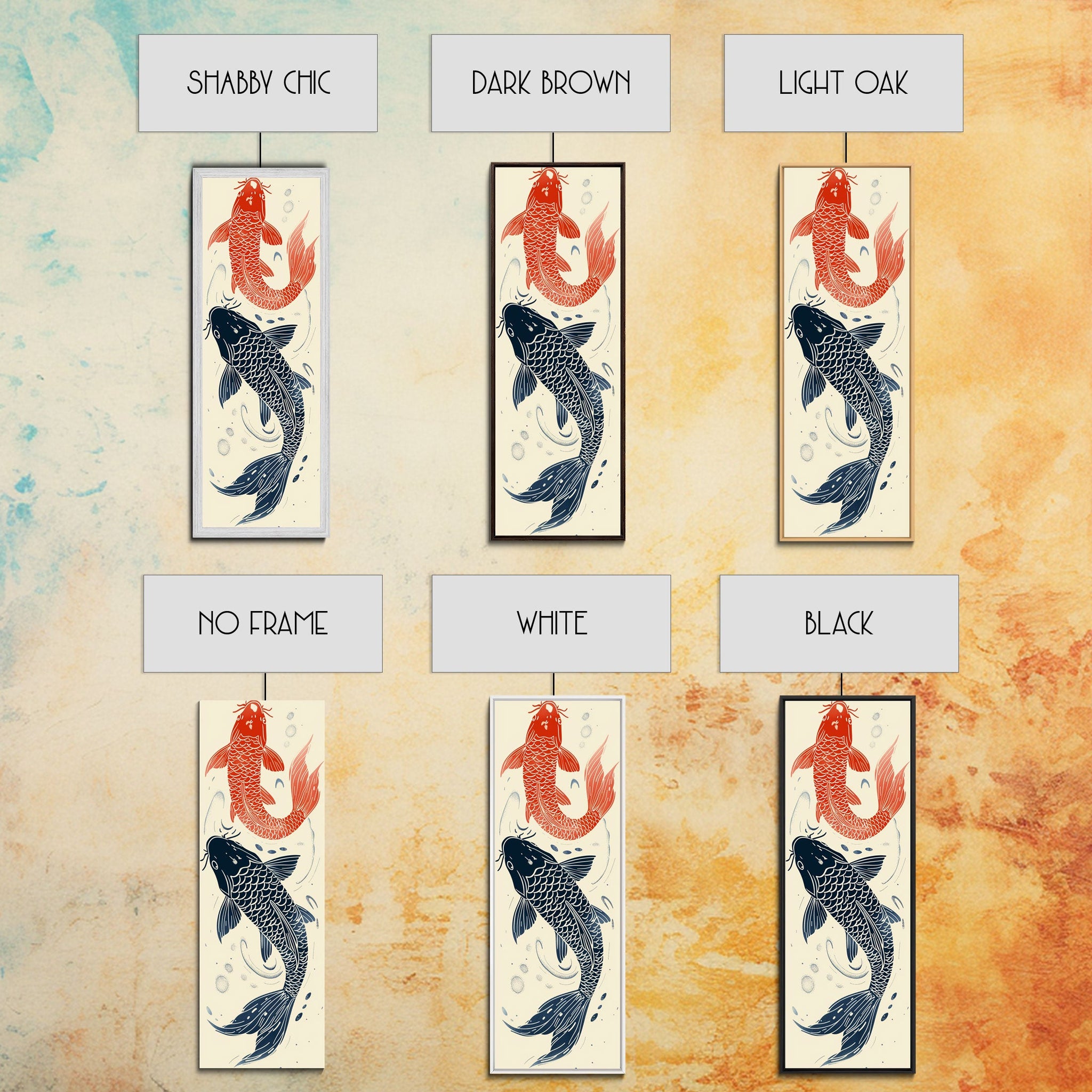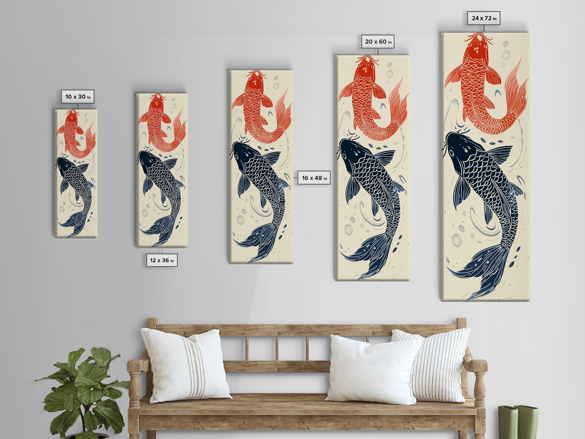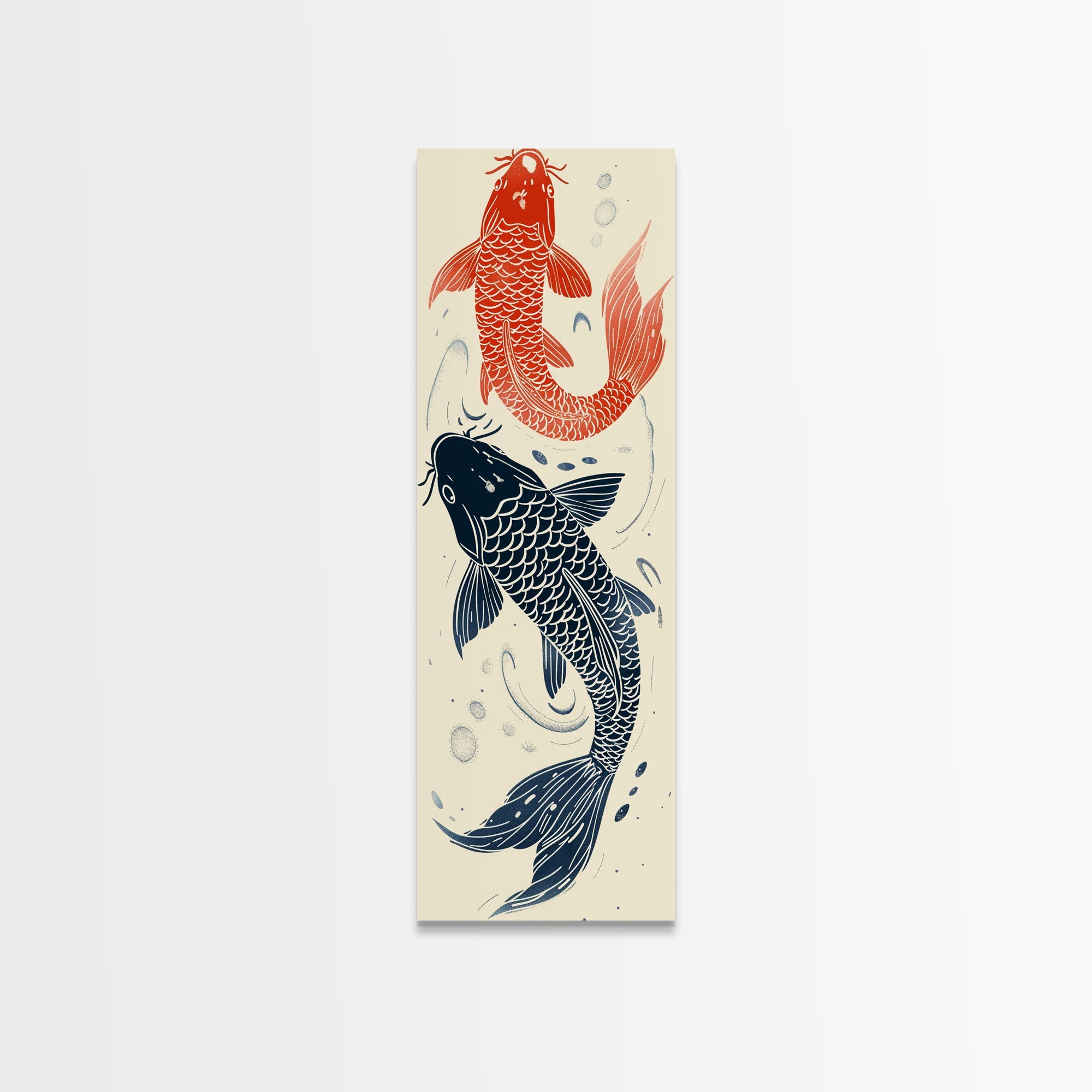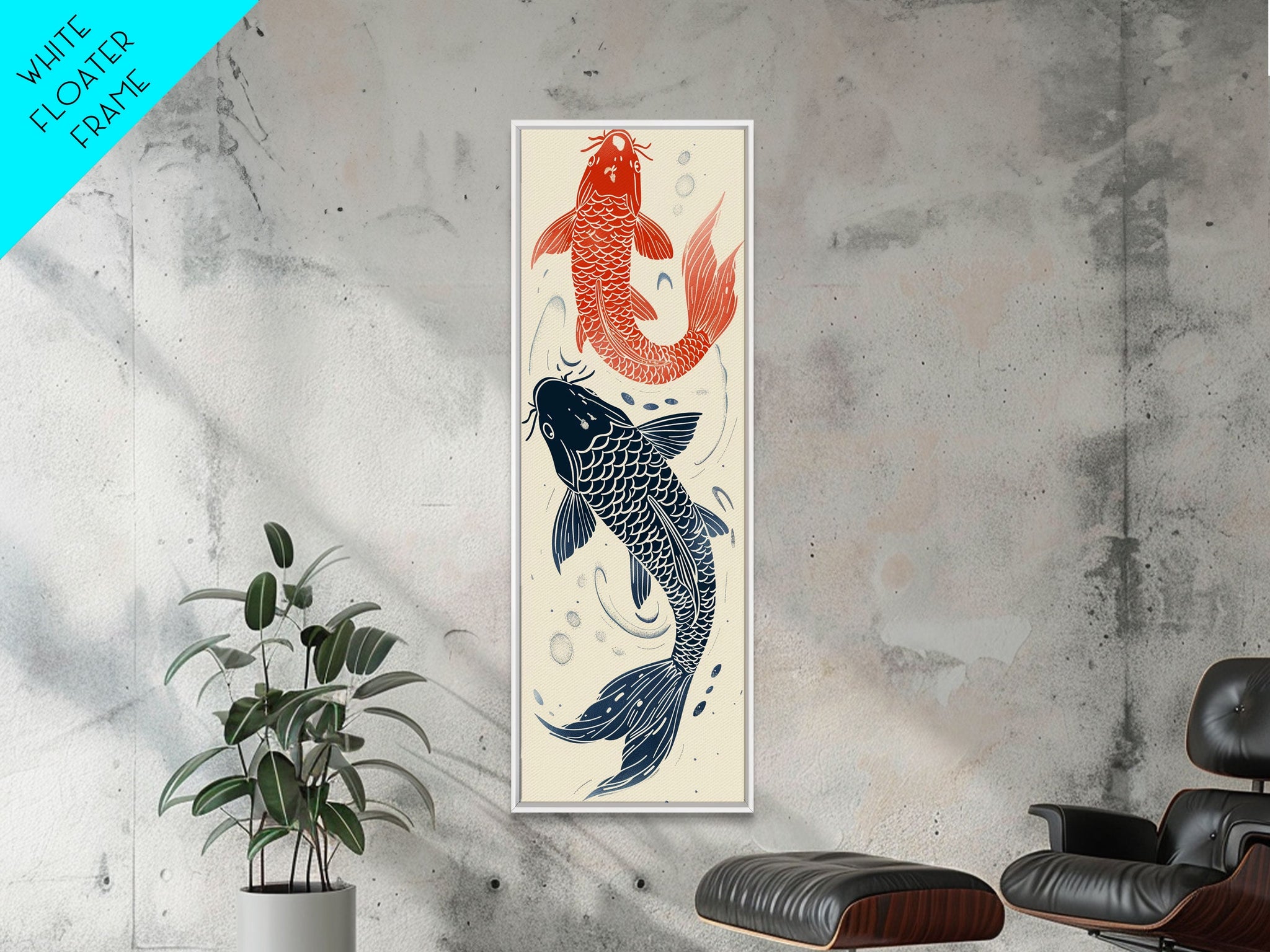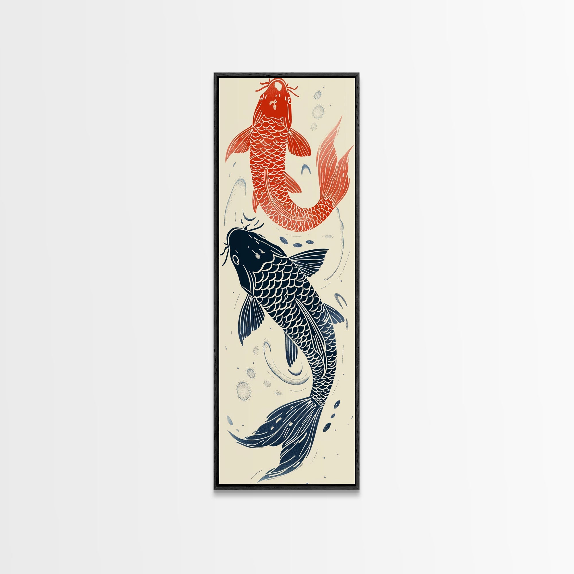 Elegant Koi Fish in Minimalist Japanese Art Style, Tall and Skinny Framed Canvas Print for Ukiyo-e Art Lovers