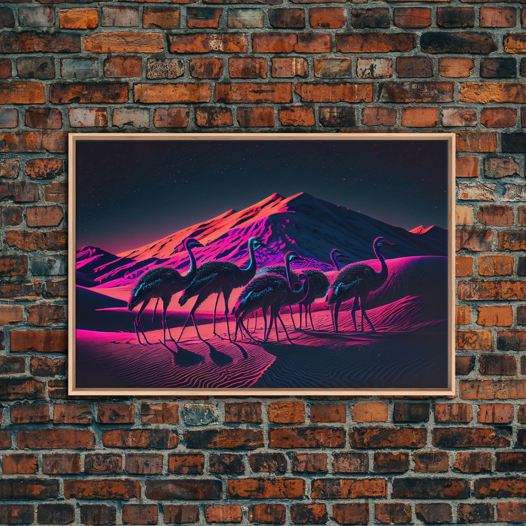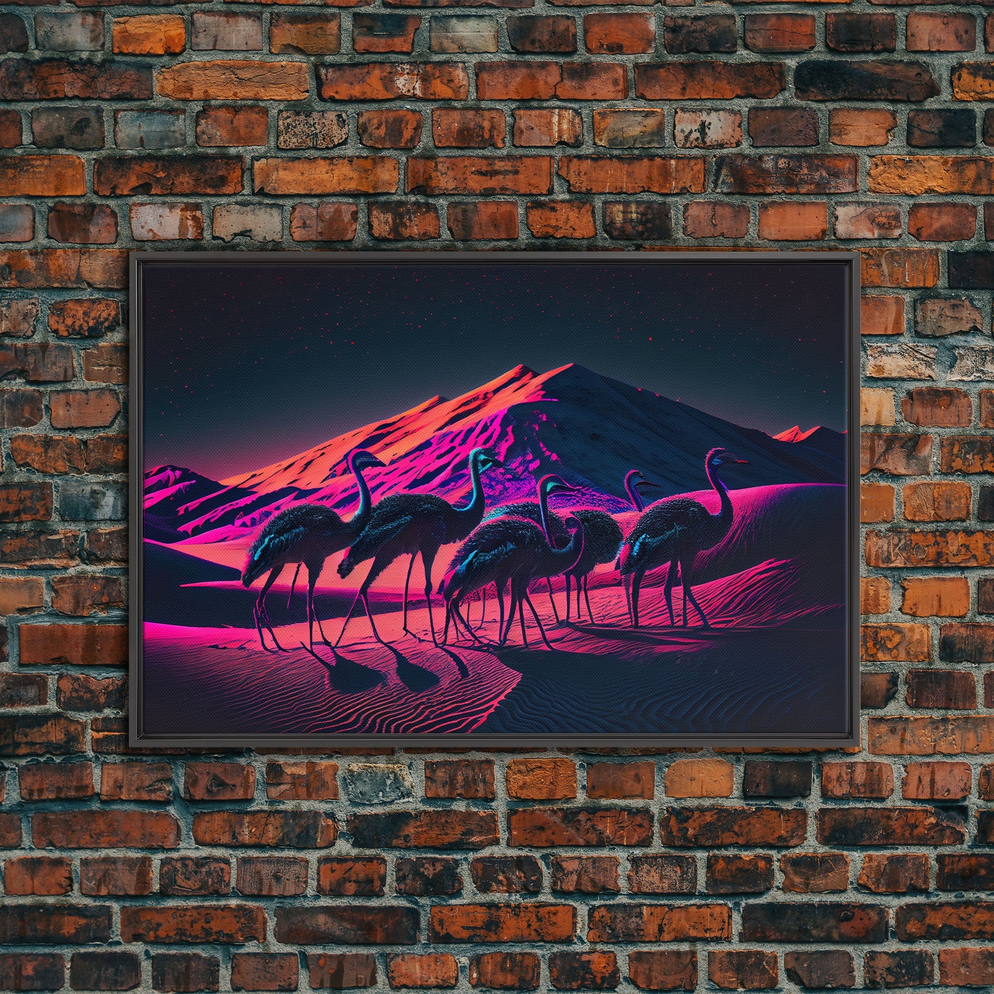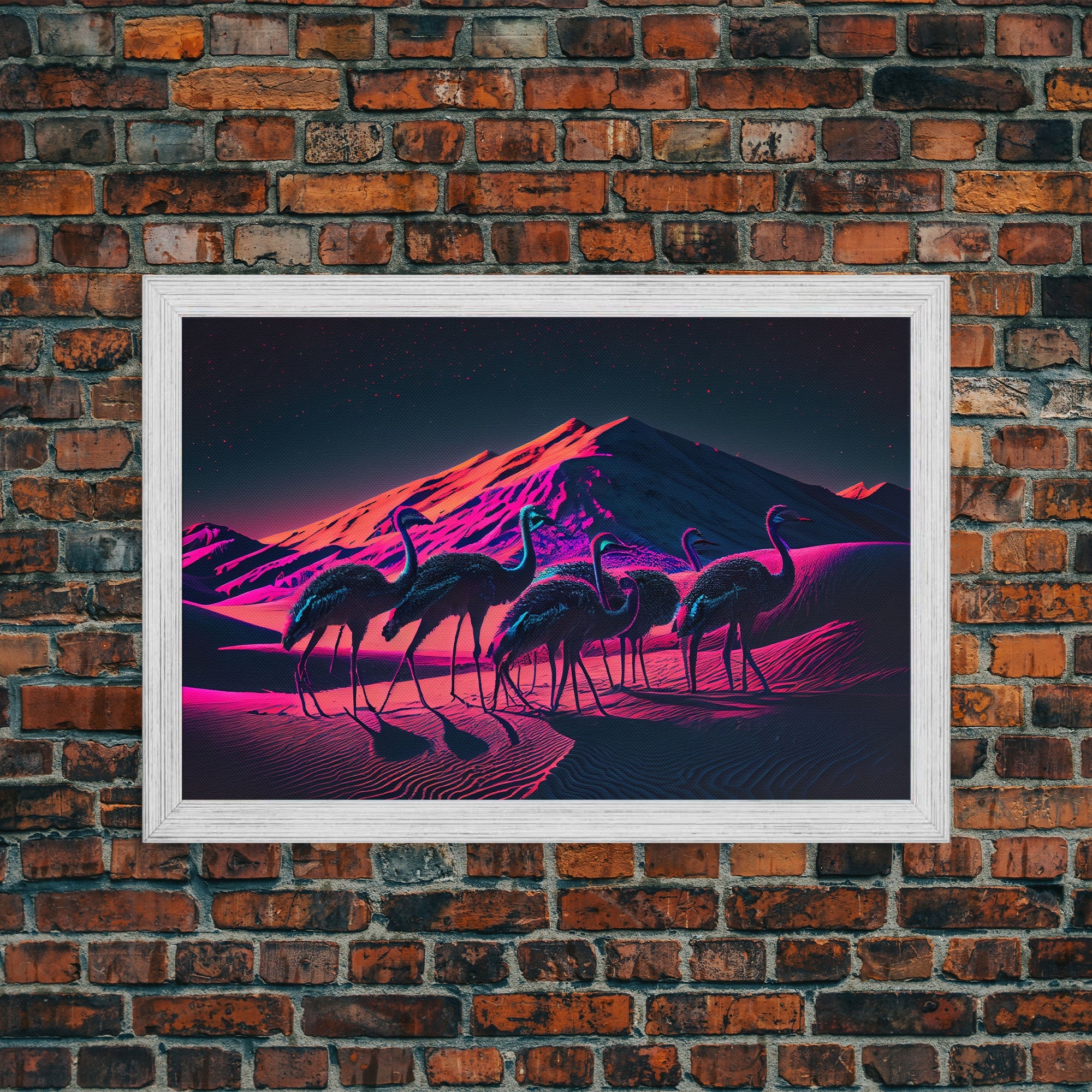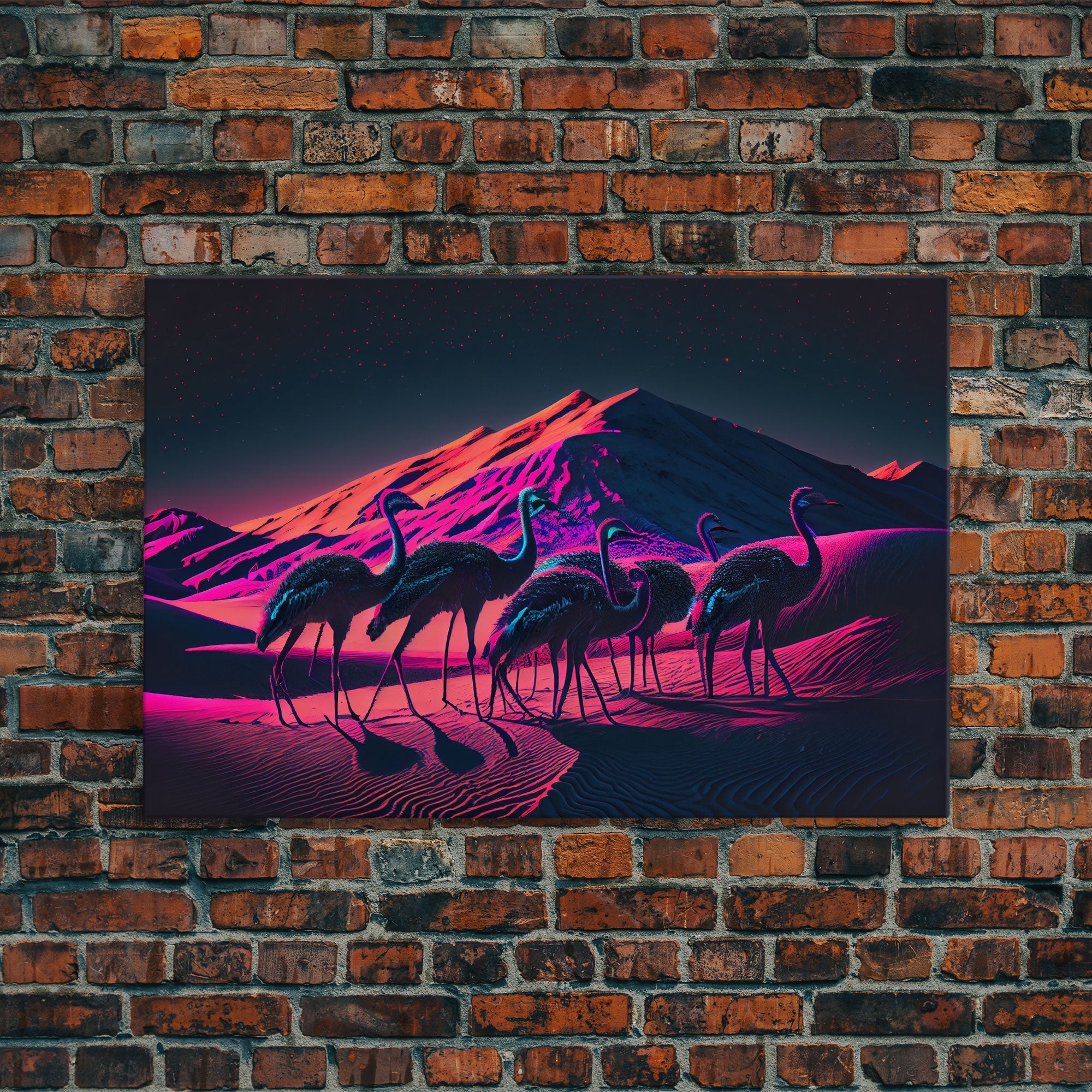 Emus in the desert, animal prints, animal art, framed canvas print, vapor wave synthwave animal art