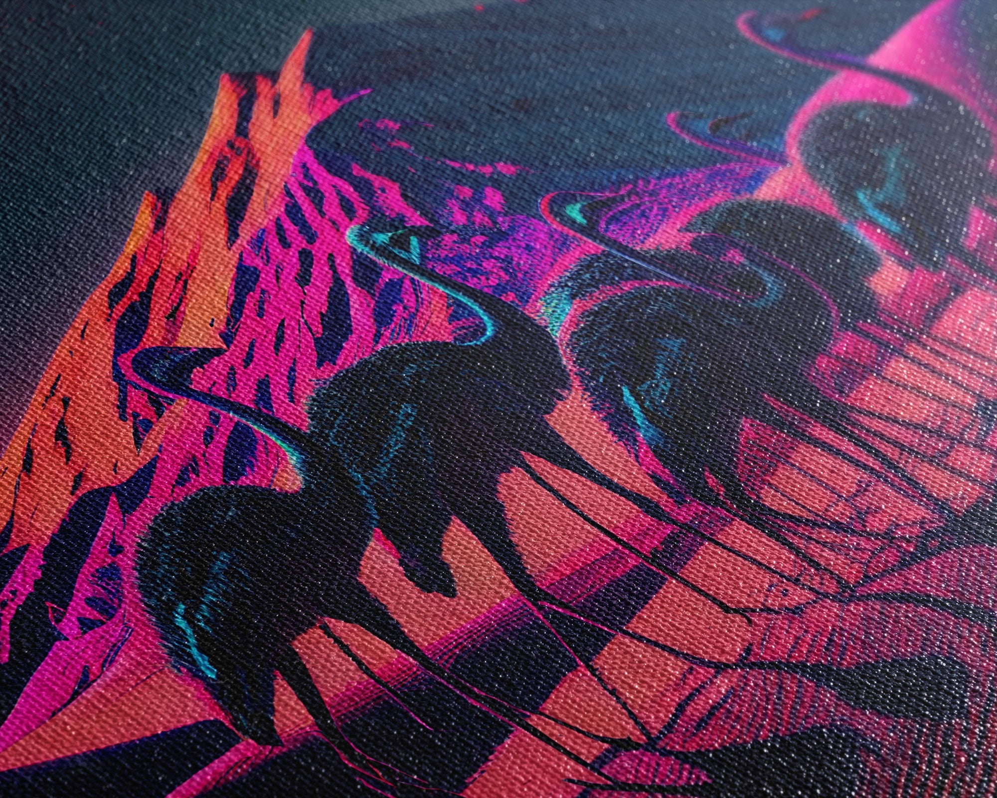 • Load image into Gallery viewer, Emus in the desert, animal prints, animal art, framed canvas print, vapor wave synthwave animal art