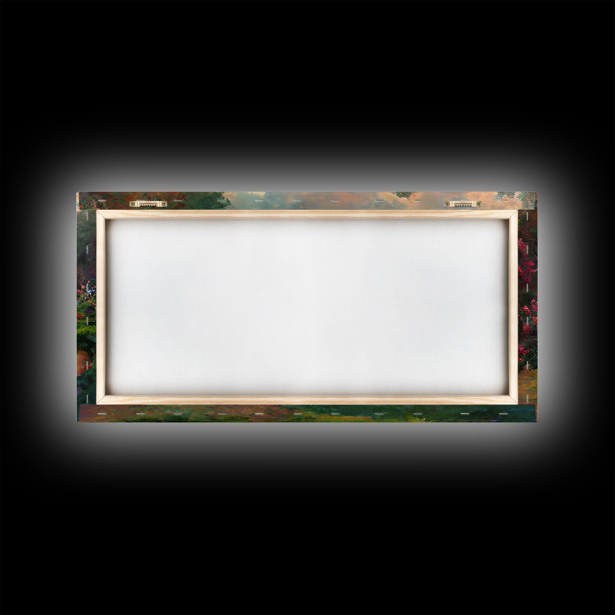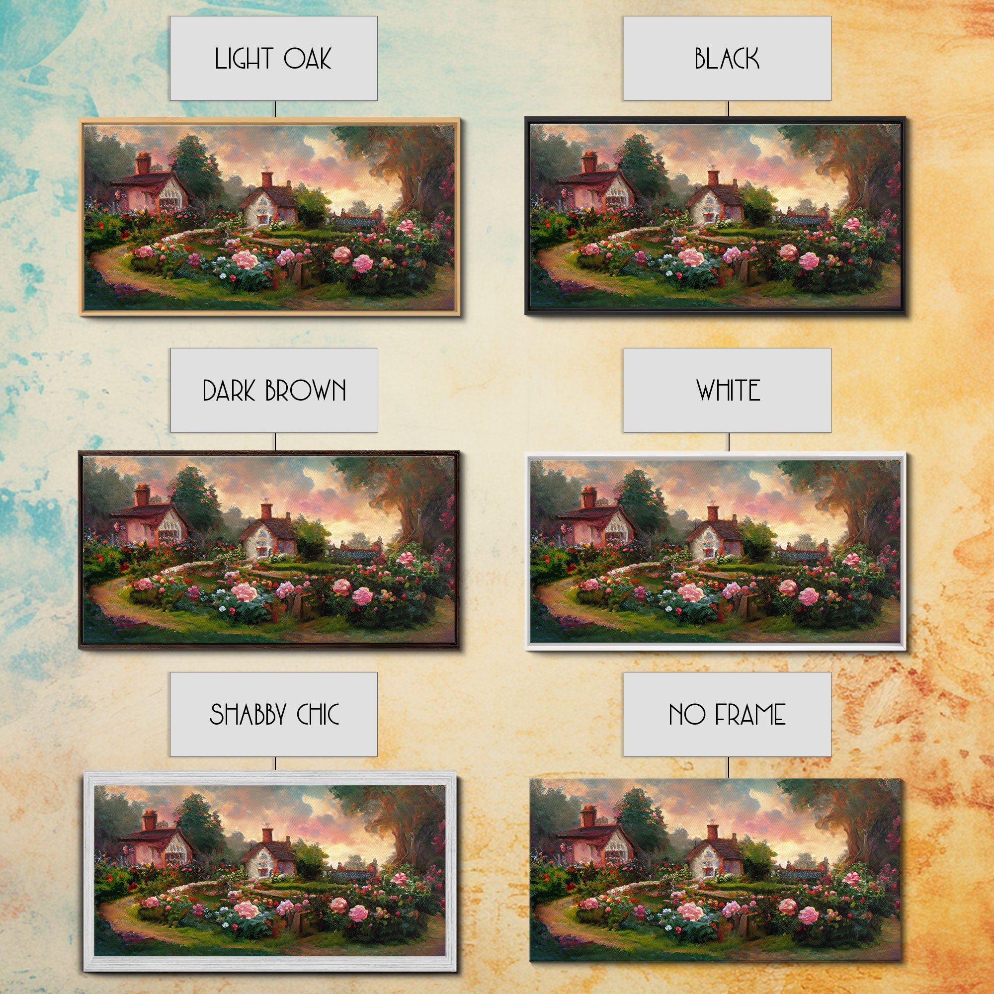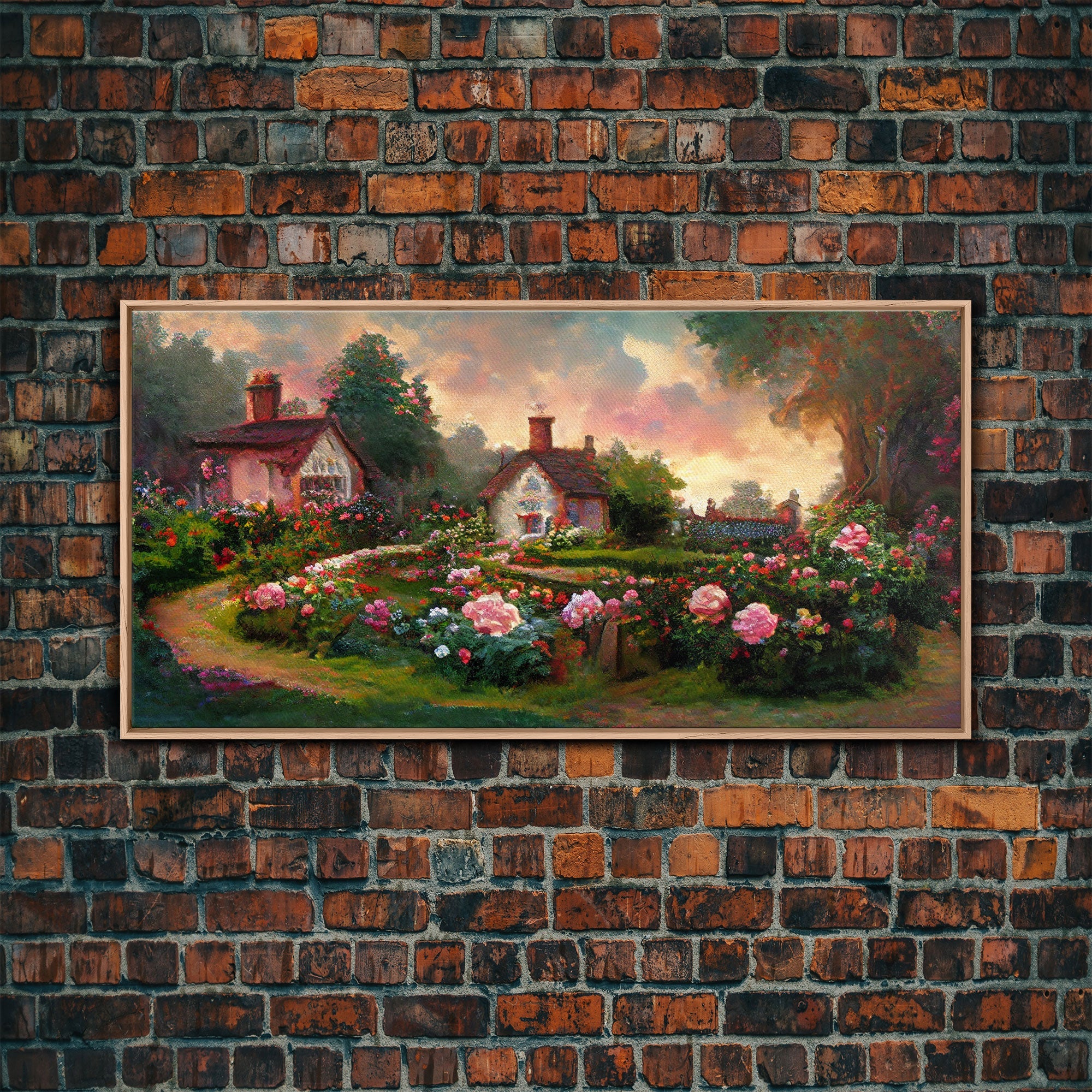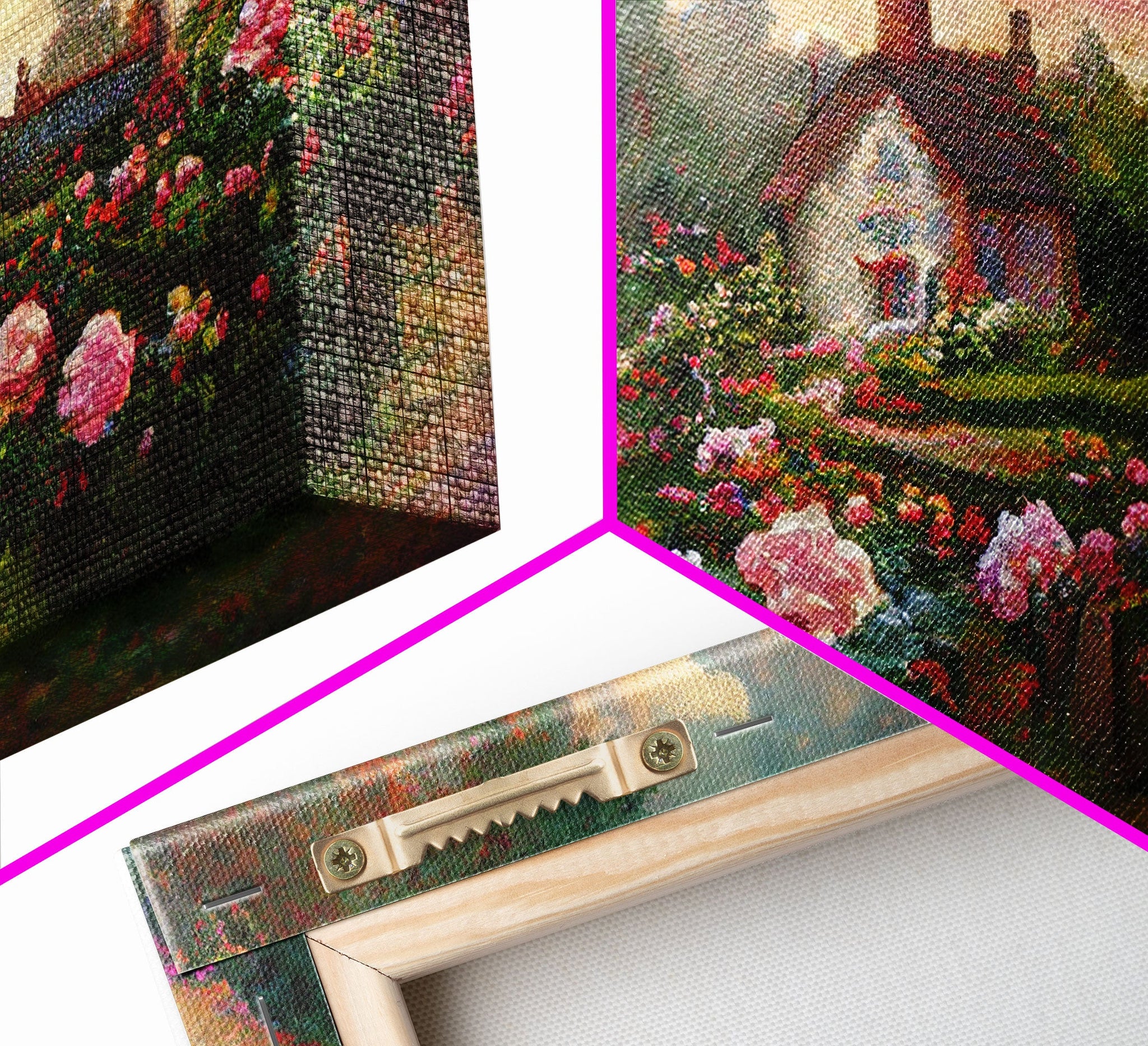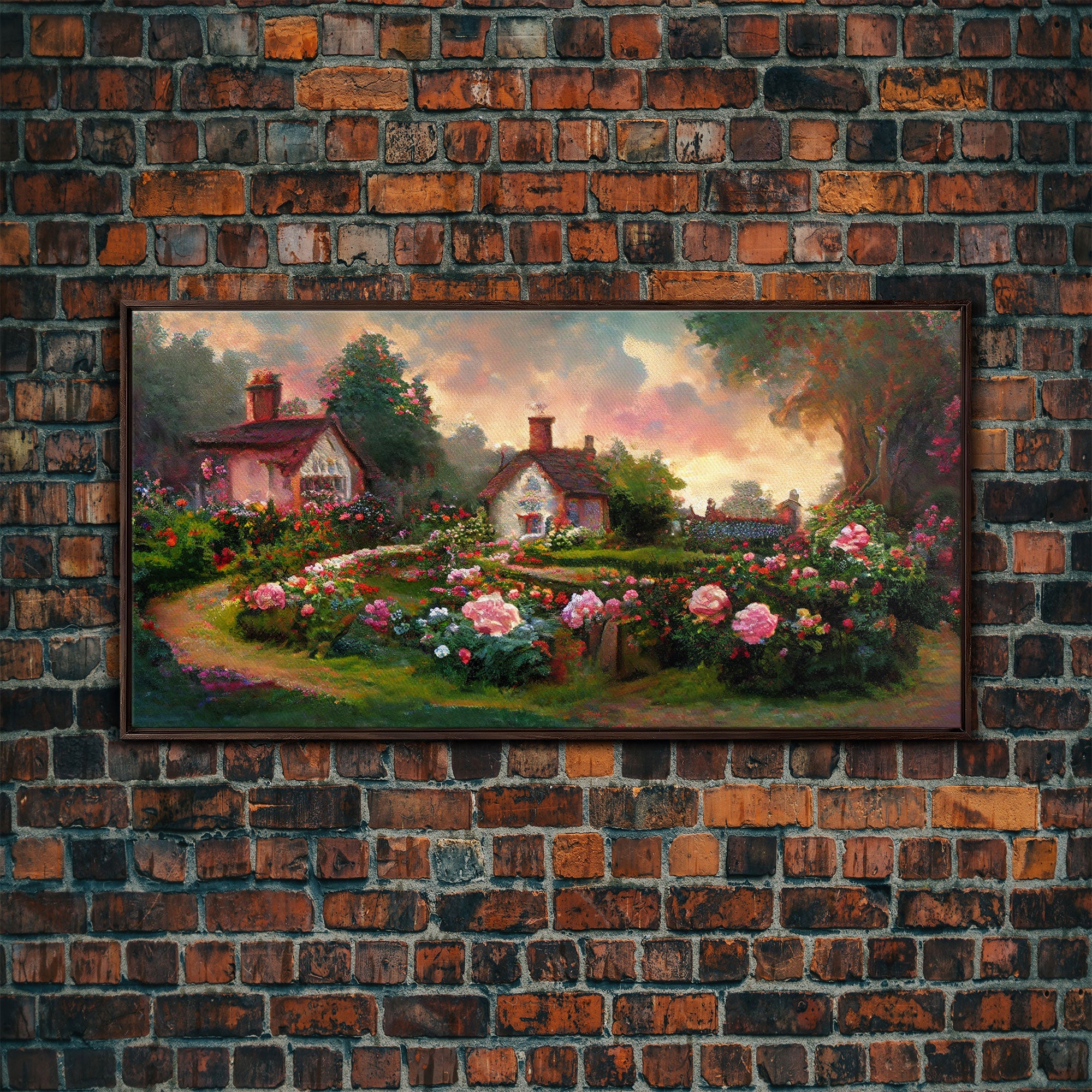 English cottage with rose garden, canvas print, cute English countryside wall art