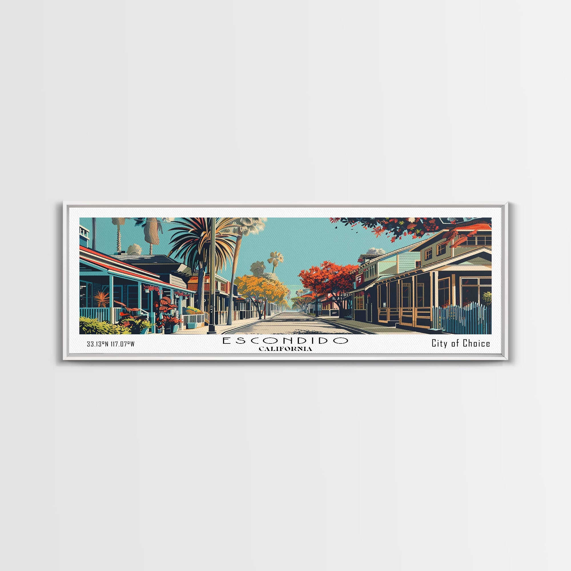 Escondido California Panoramic Painting, Framed Canvas Print, Mid Century Modern Wall Art, Retro Pop Art Travel Poster, Living Room Decor, City Art
