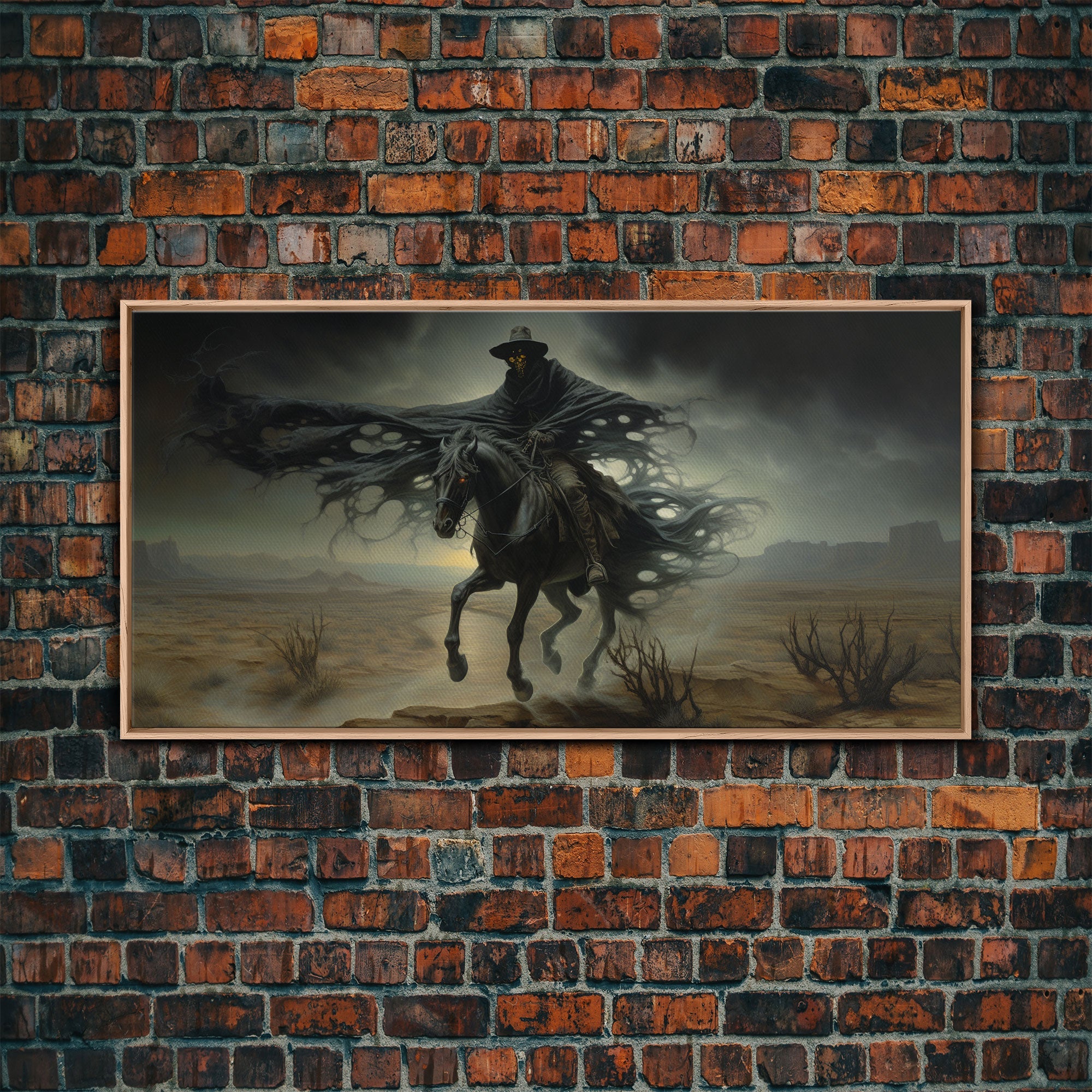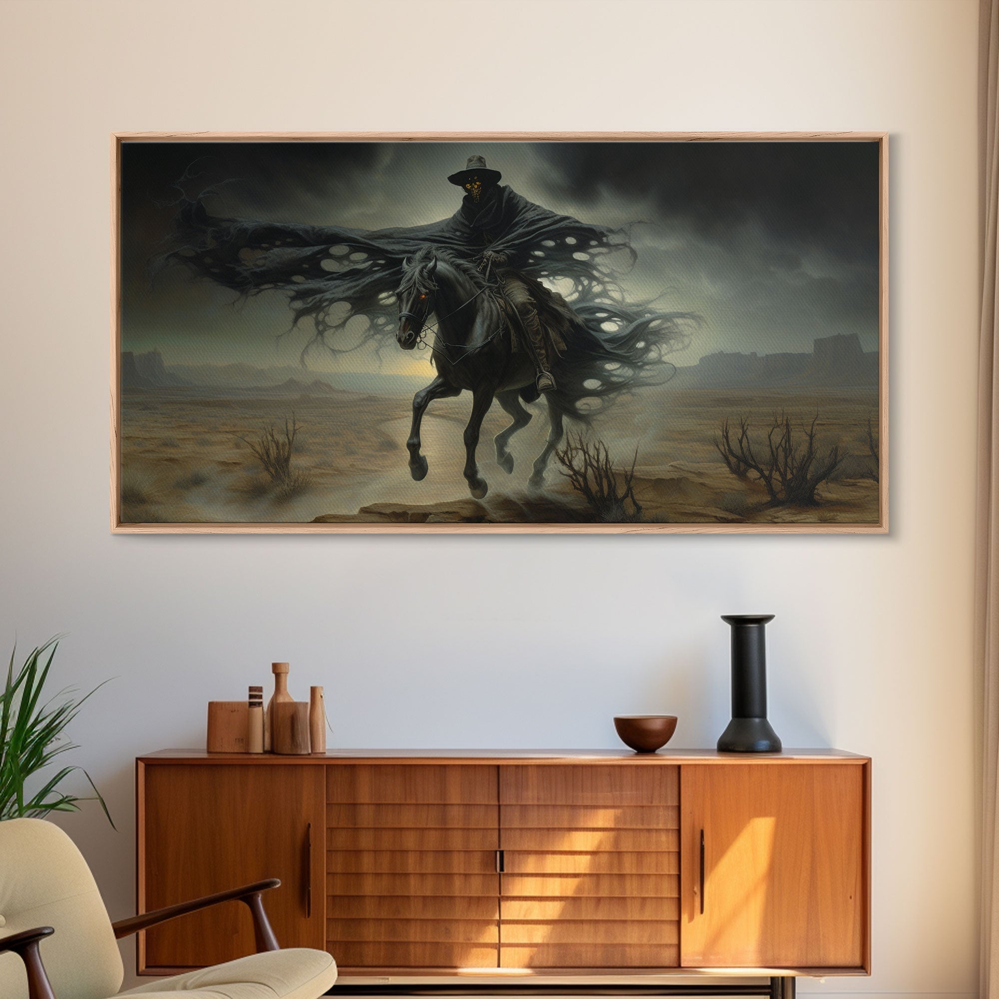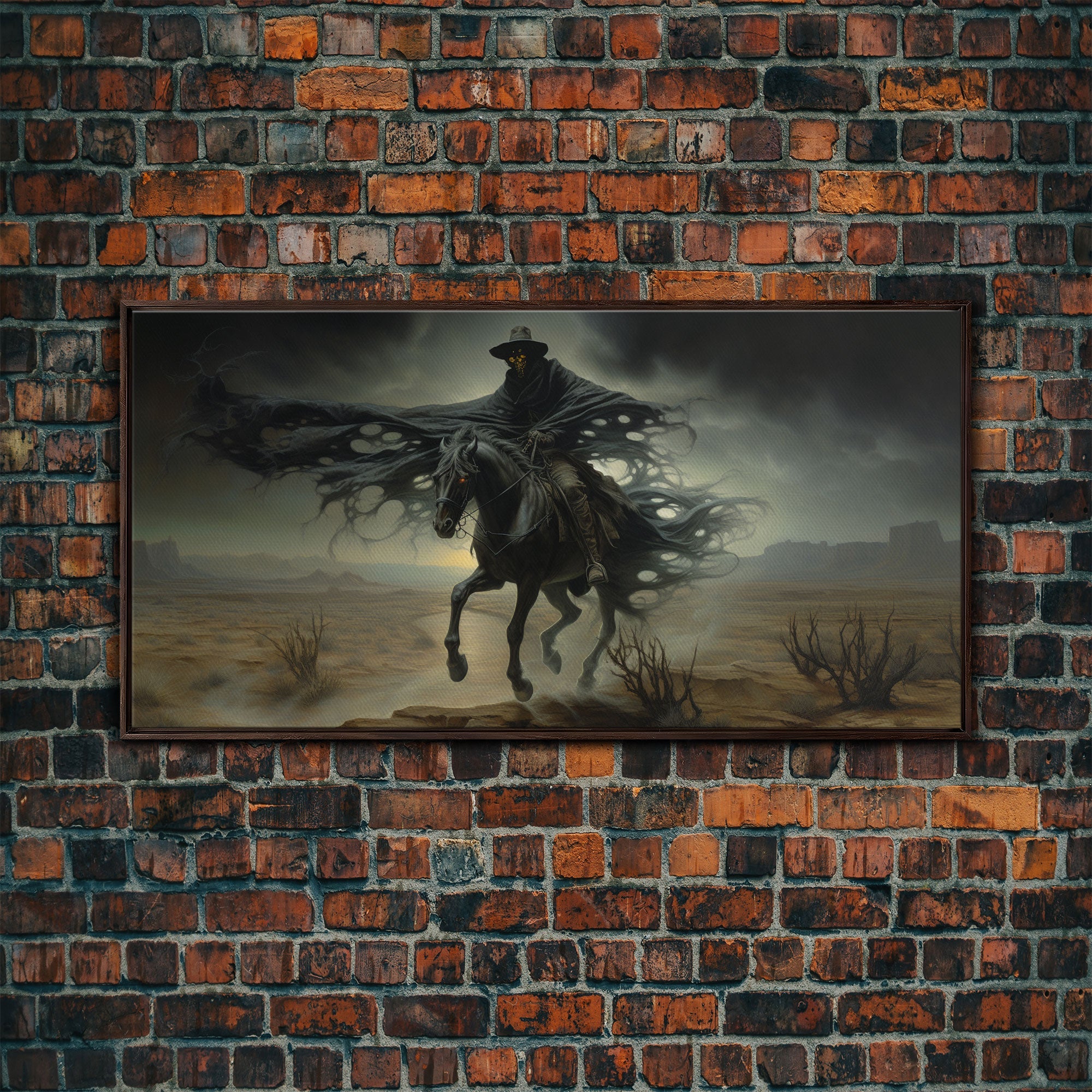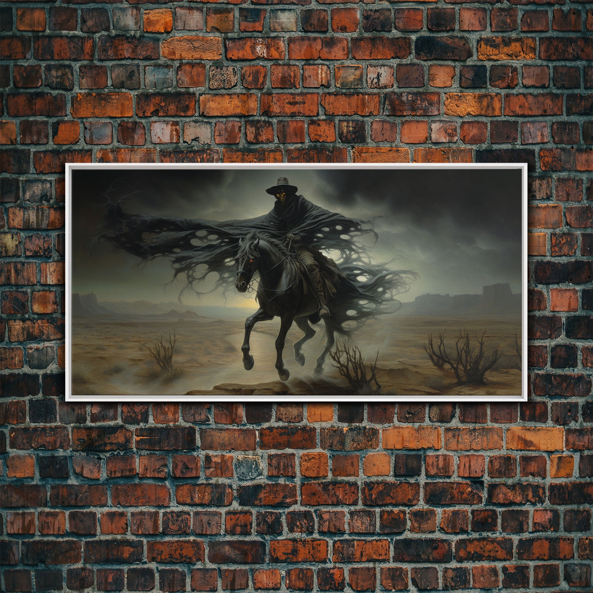 Ghost Cowboy Art, Framed Canvas Print, Halloween art, spooky decor, cowboy art, western decor, grim reaper on a horse in the desert