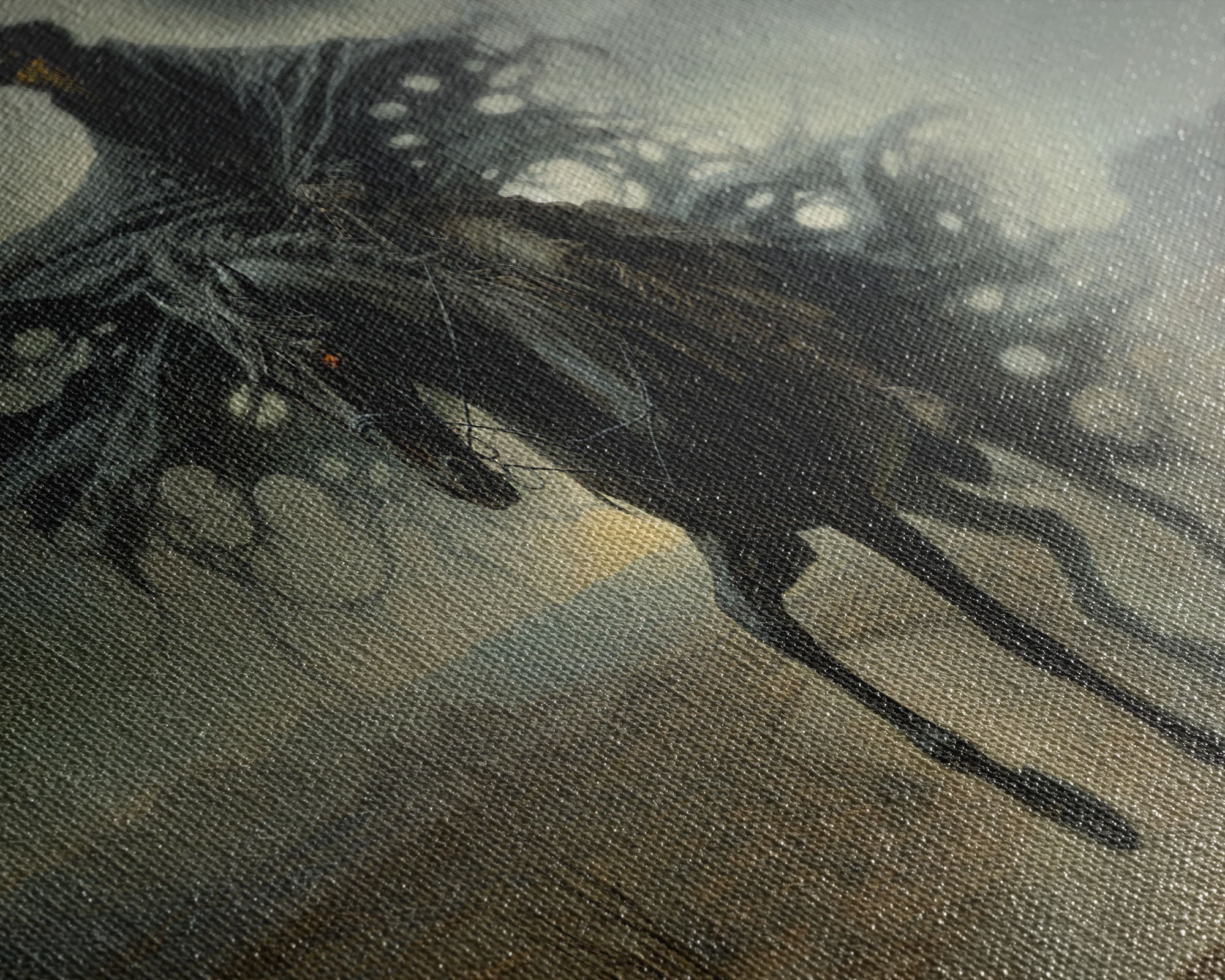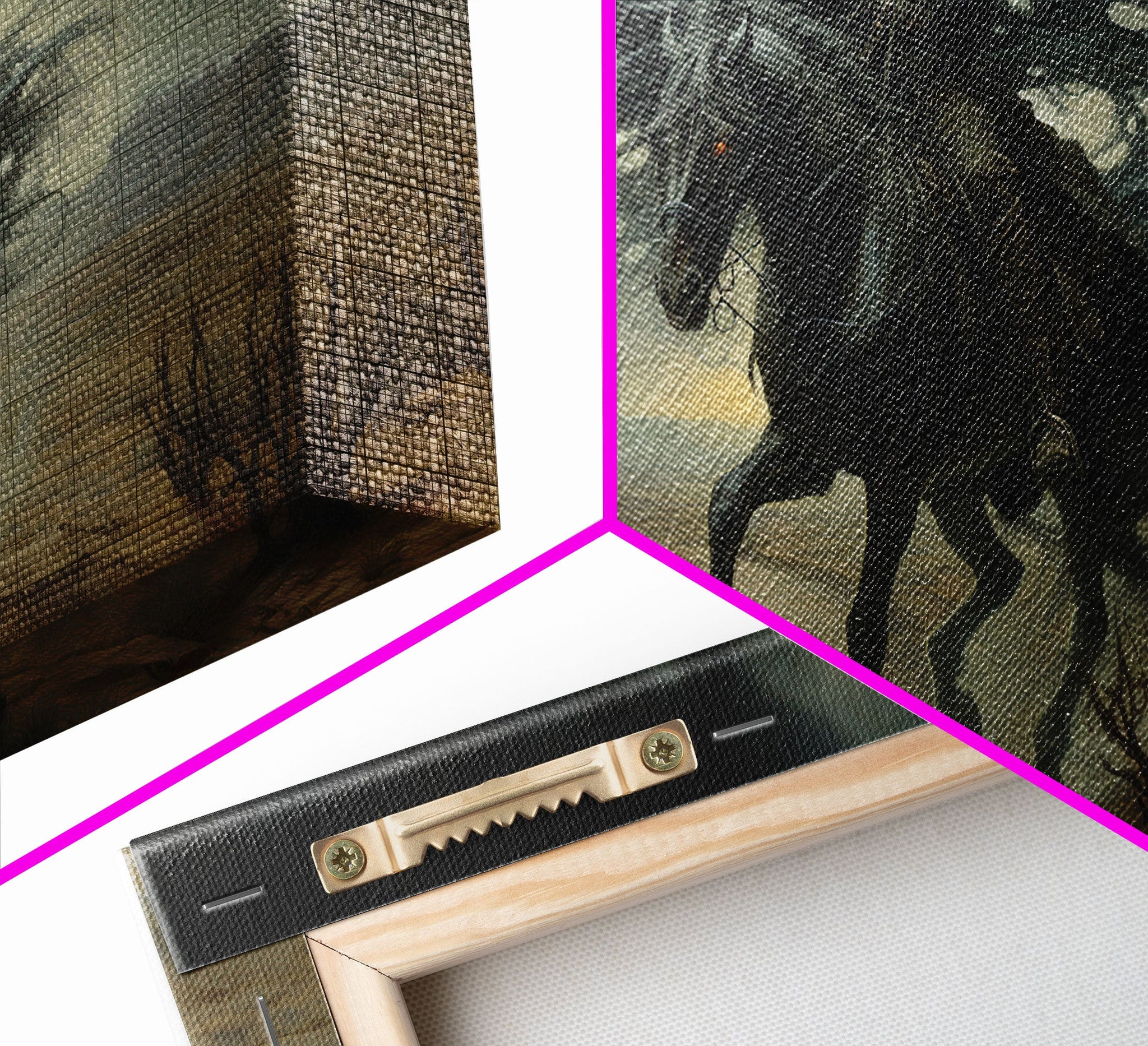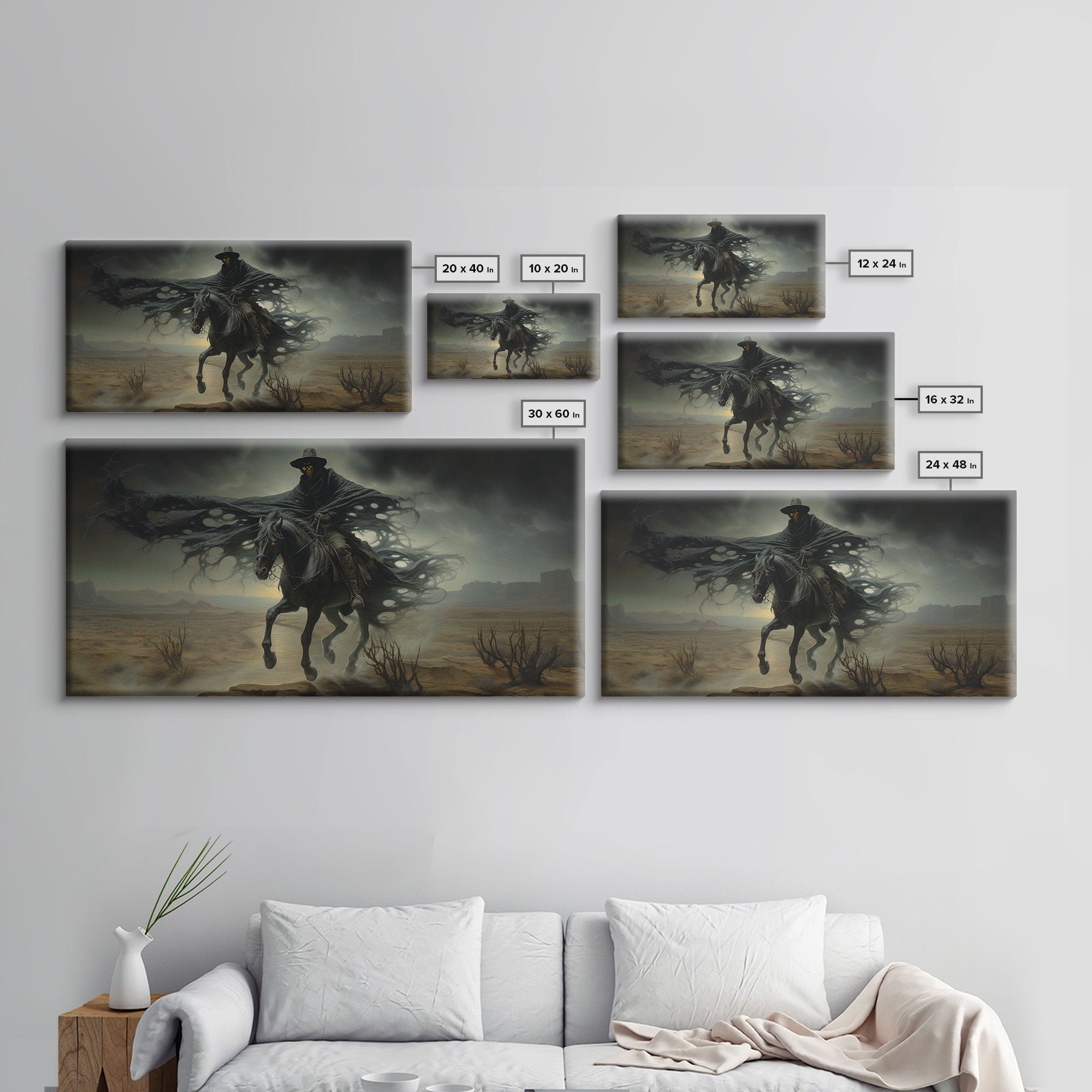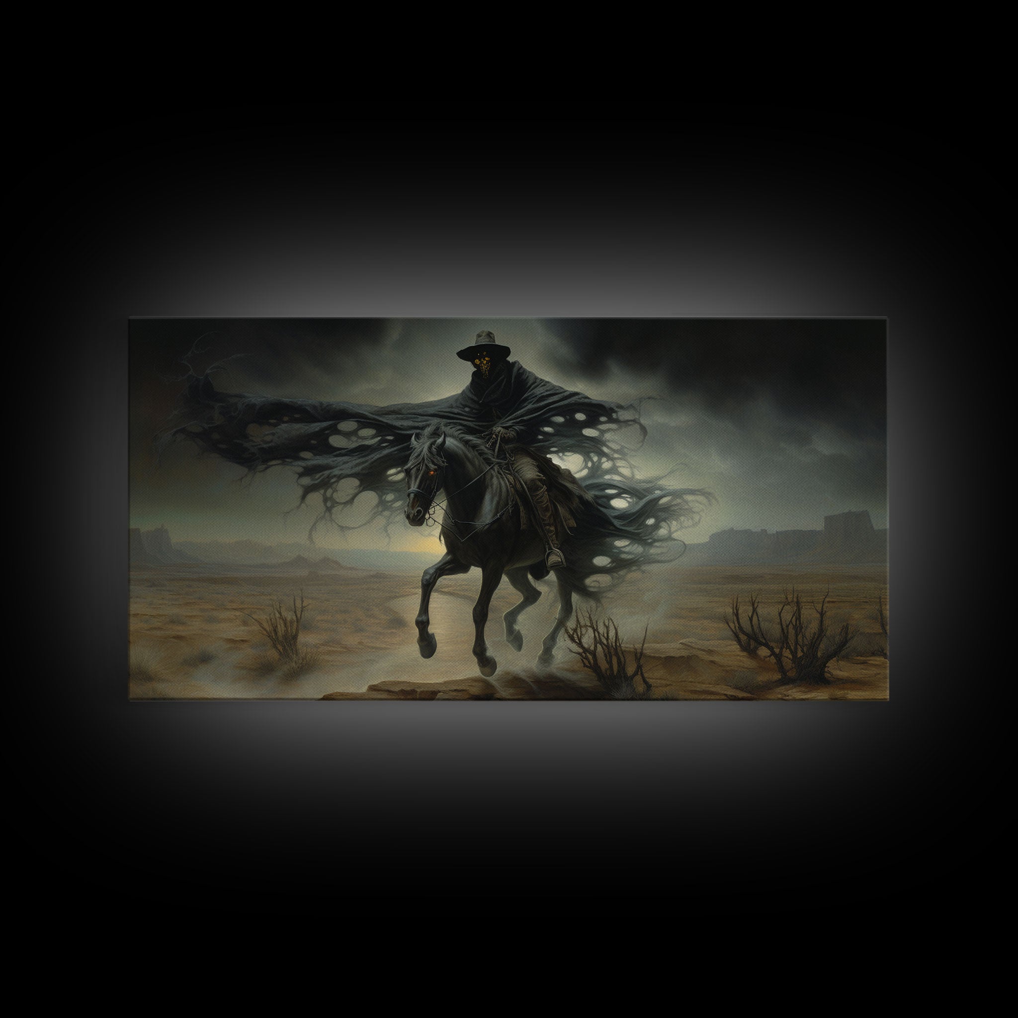 Ghost Cowboy Art, Framed Canvas Print, Halloween art, spooky decor, cowboy art, western decor, grim reaper on a horse in the desert