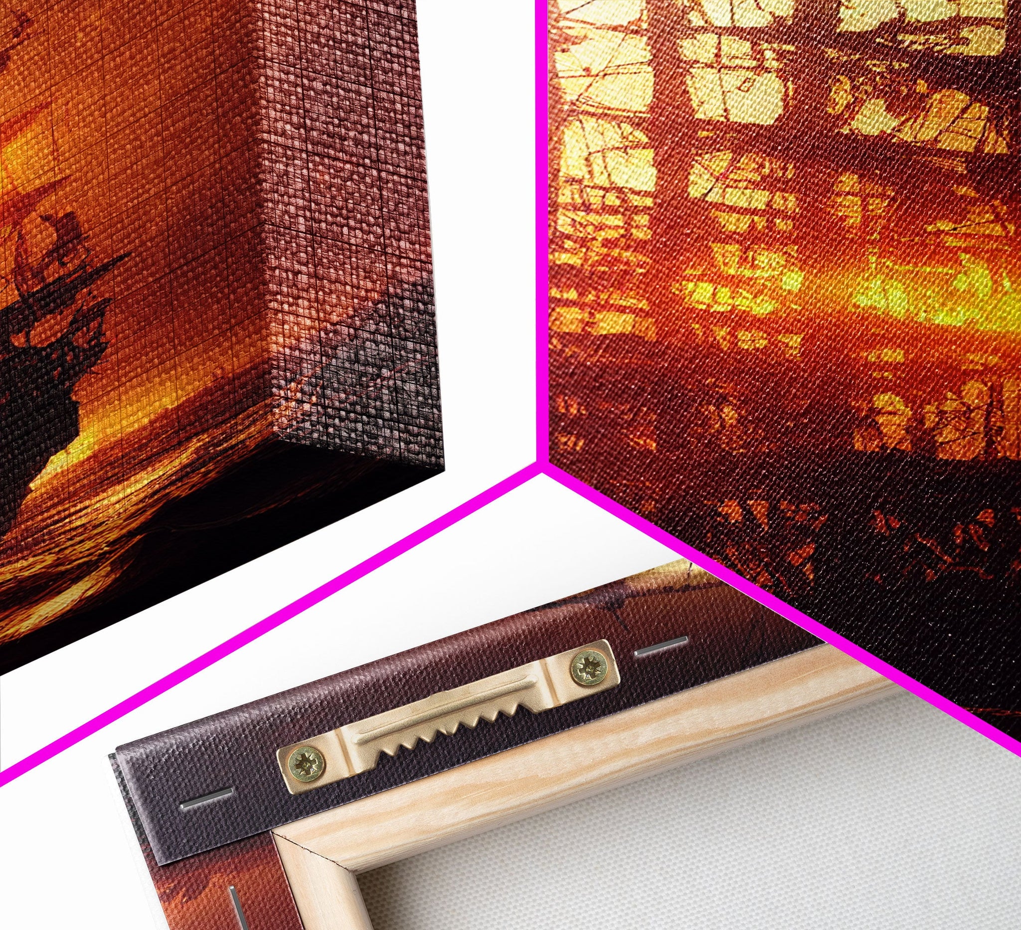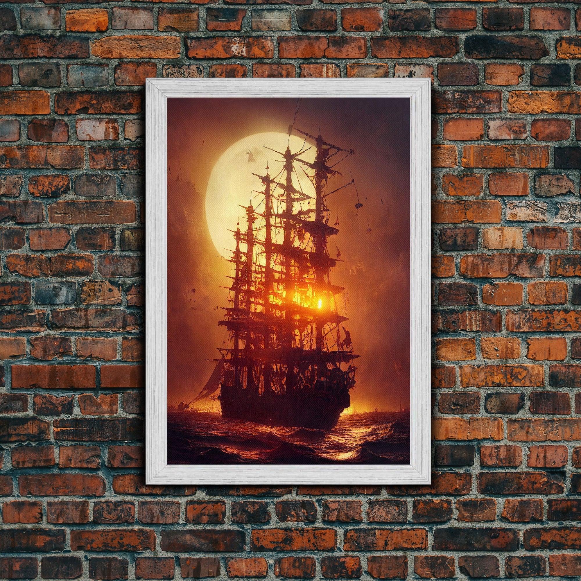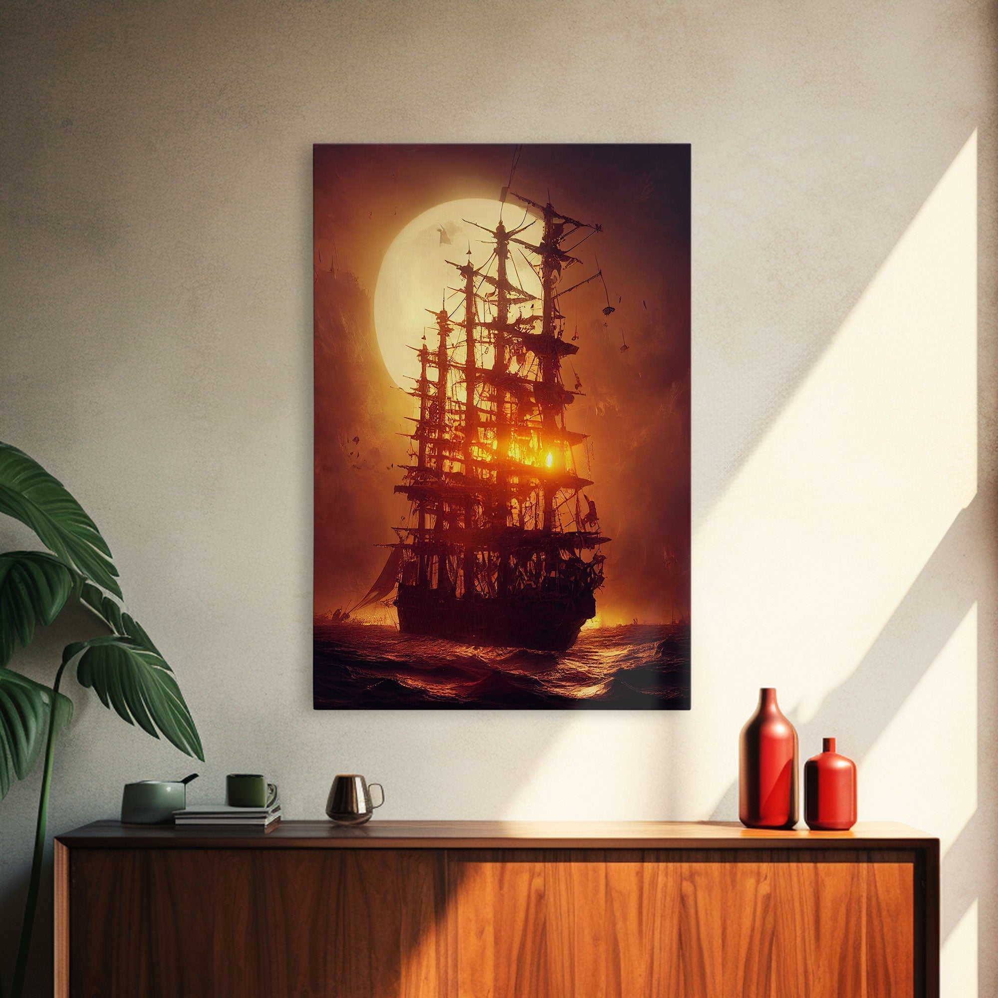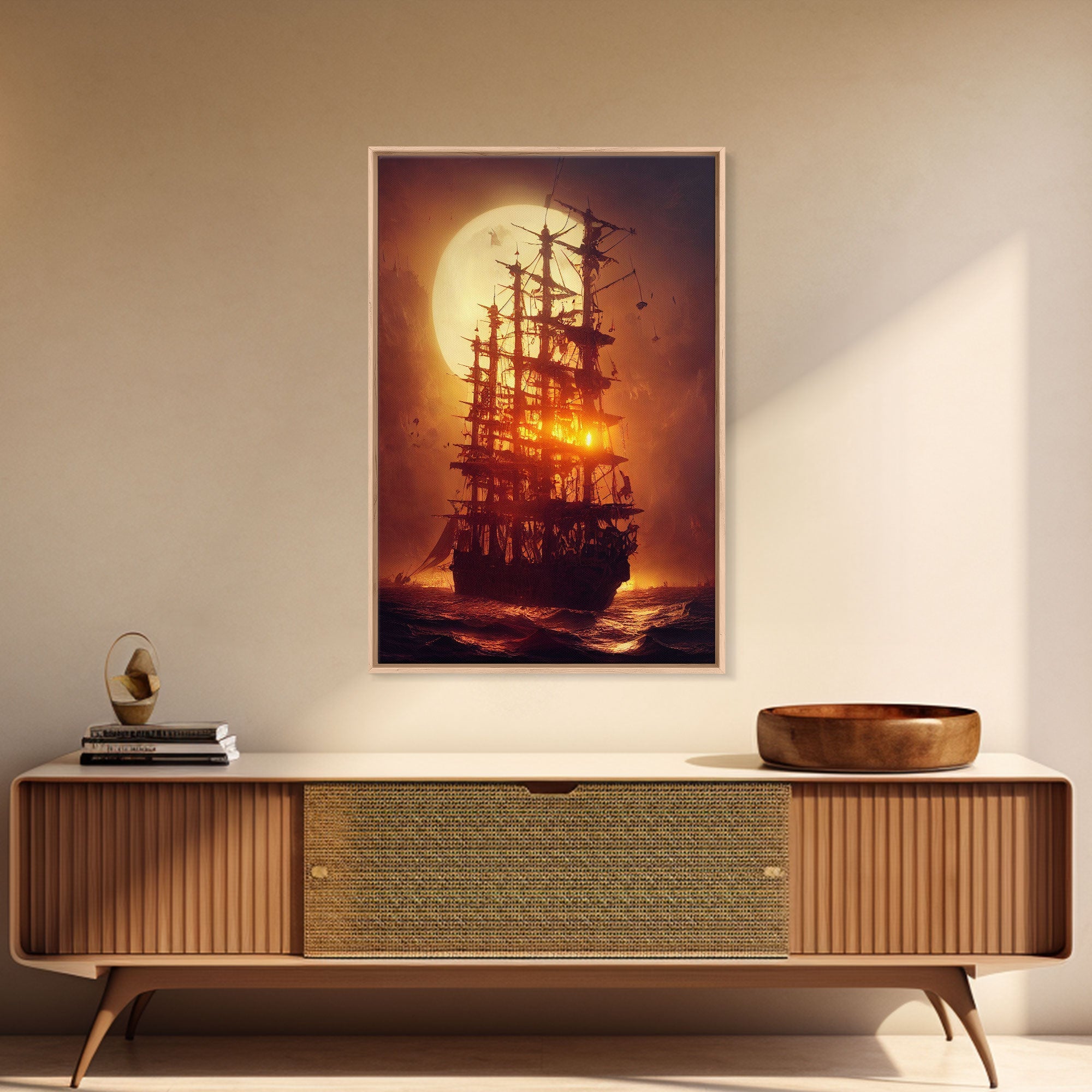 Ghost Ship and Full Moon, Spooky Pirate Ship Art, Framed Canvas Print, Ready To Hang Framed Wall Art, Living Room Wall Hanging