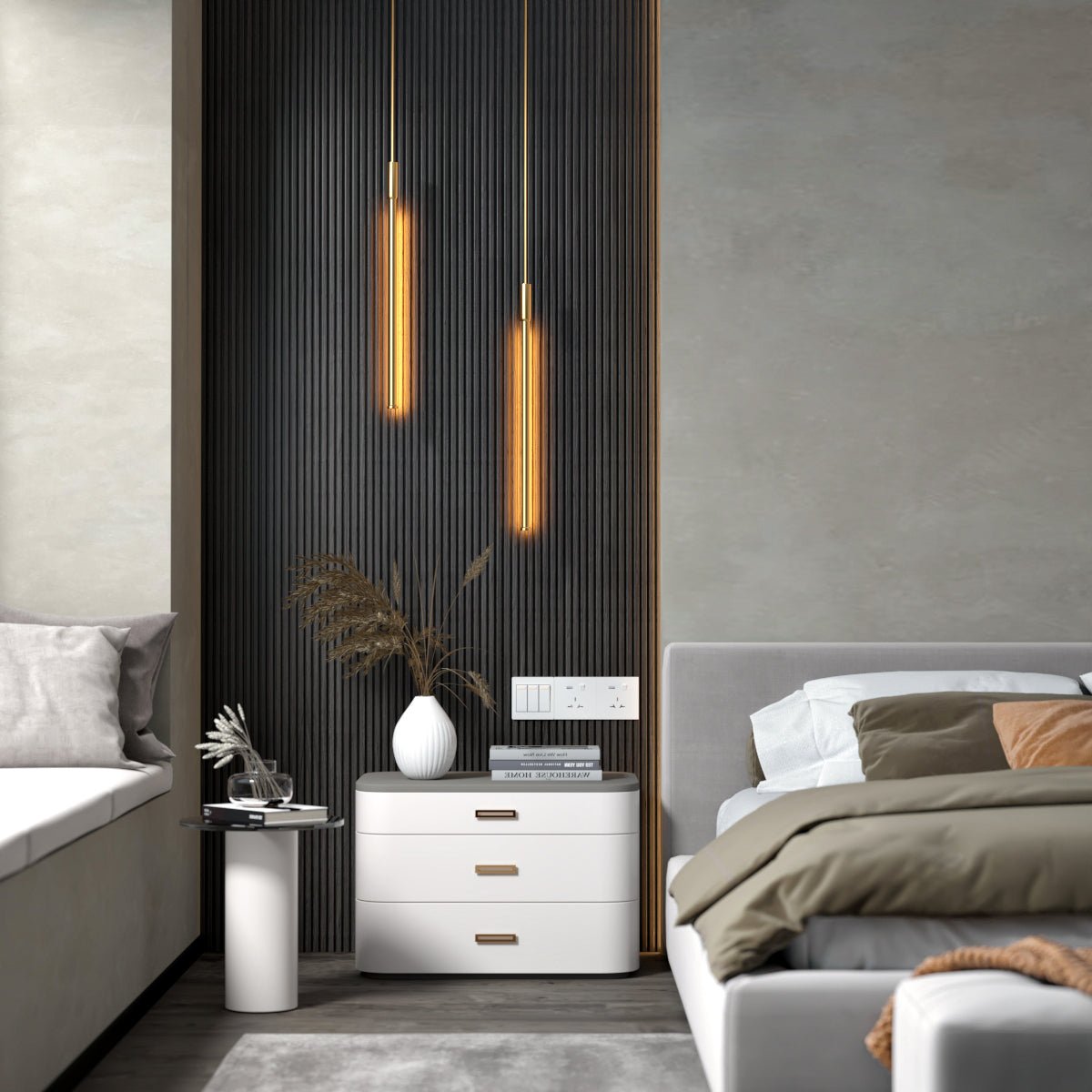 The Vertical Line Pendant is the latest innovation in modern lighting design. A linear pendant hangs down and illuminates the wall with the integrated LED strip. A one-of-a-kind halo lighting effect is produced. This pendant light is Ideal as an accent piece for your accent wall, nightstands, TV stands, or living areas.