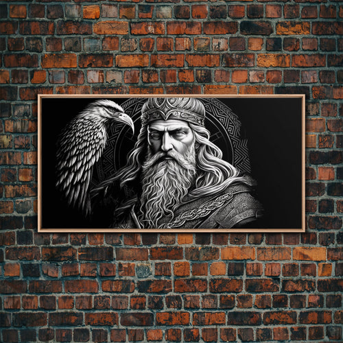 Black and White Portrait of Odin and Muninn, King of The Gods, Framed Canvas Print, Odin's Ravens, Norse Mythology Art