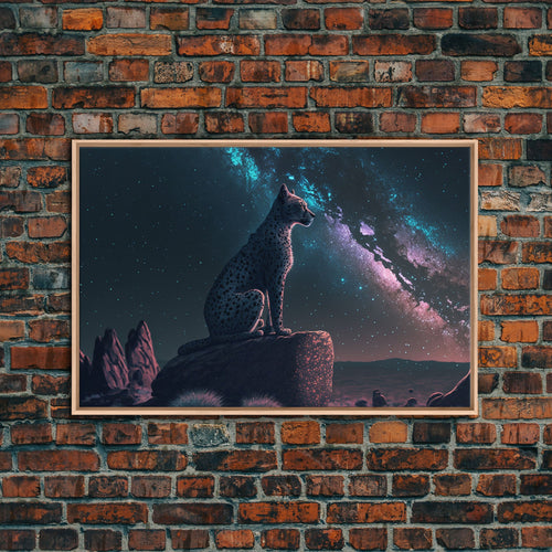 Cheetah overlooking the valley, synthwave retro style animal prints, framed canvas print, framed wall art, starry Africa night sky