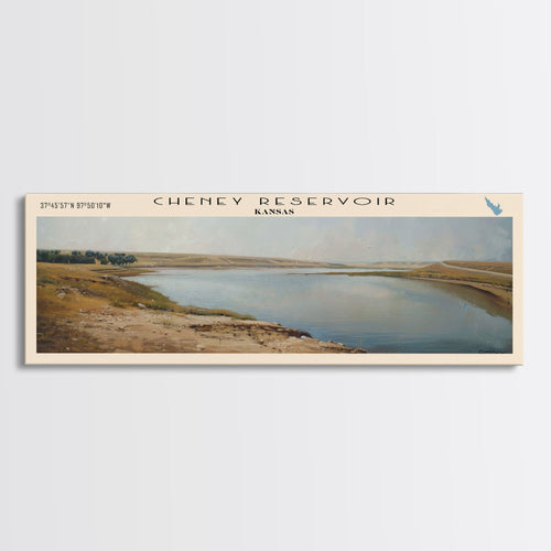 Cheney Reservoir Kansas Framed Canvas Print, Midcentury Modern Panoramic Wall Art, Living Room Decor, Pop Art, Travel Poster Art, Scenic Nature Painting, Lake House Decor