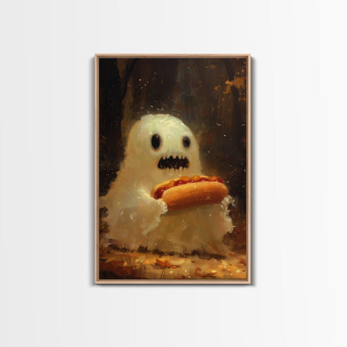 CHOMP! Cute Lil Ghost Eatin' a Dog, The Hot Dog Ghost, Haunted Hot Dog Thief, Framed Canvas Print, Halloween Art