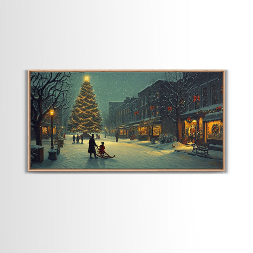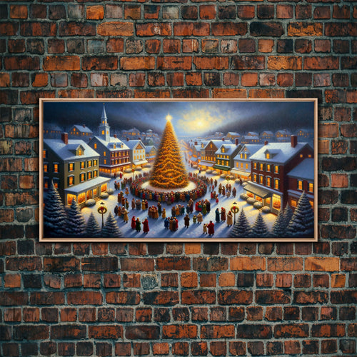 Christmas Village Tree Lighting Framed Canvas Print, Nostalgic Winter Holiday Art, Vintage Wall Art Scene, Best Gift Idea Christmas Decor