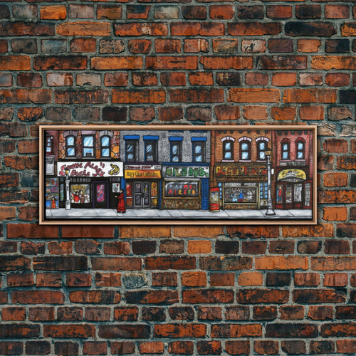 Colored Pencil Urban Sketch Art, Urban Art, Street Art Print, Storefronts, Wall Decor, Large Canvas Print, Panoramic, Wall Art, Canvas Print