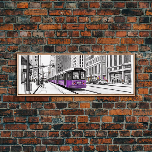 Colored Pencil Sketch, Tram In The City, Urban Art, Violet Streetcar, Urban Art Wall Decor, Wall Decor, Panoramic, Wall Art, Canvas Print