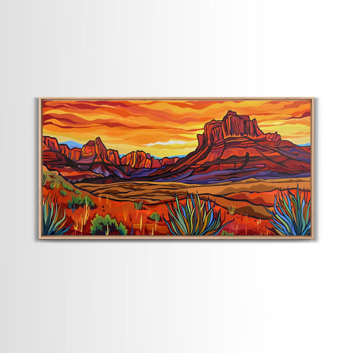 Colorful desert scene with distant mountains, Framed Canvas Print, ideal for minimalist living room, boho wall art decor